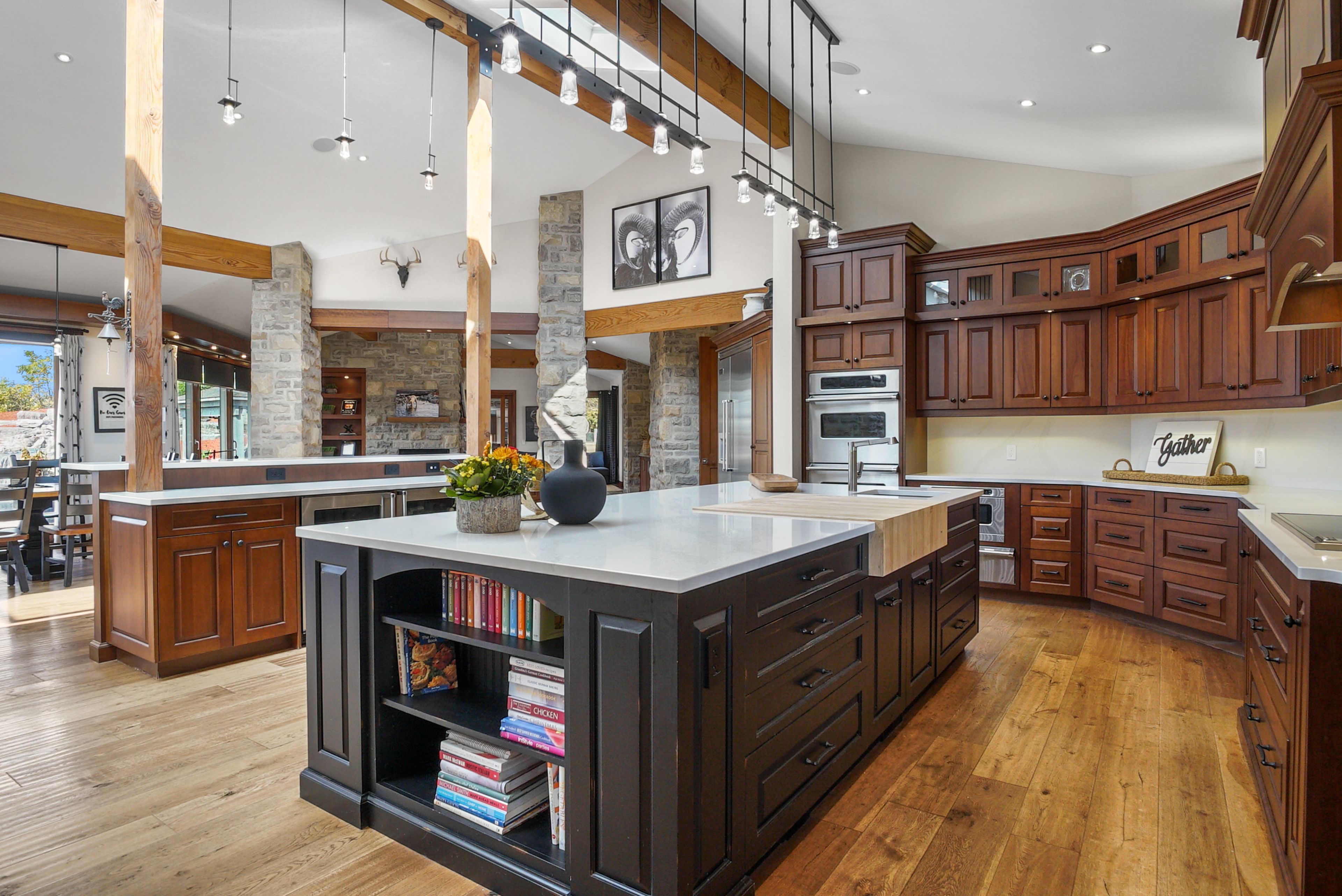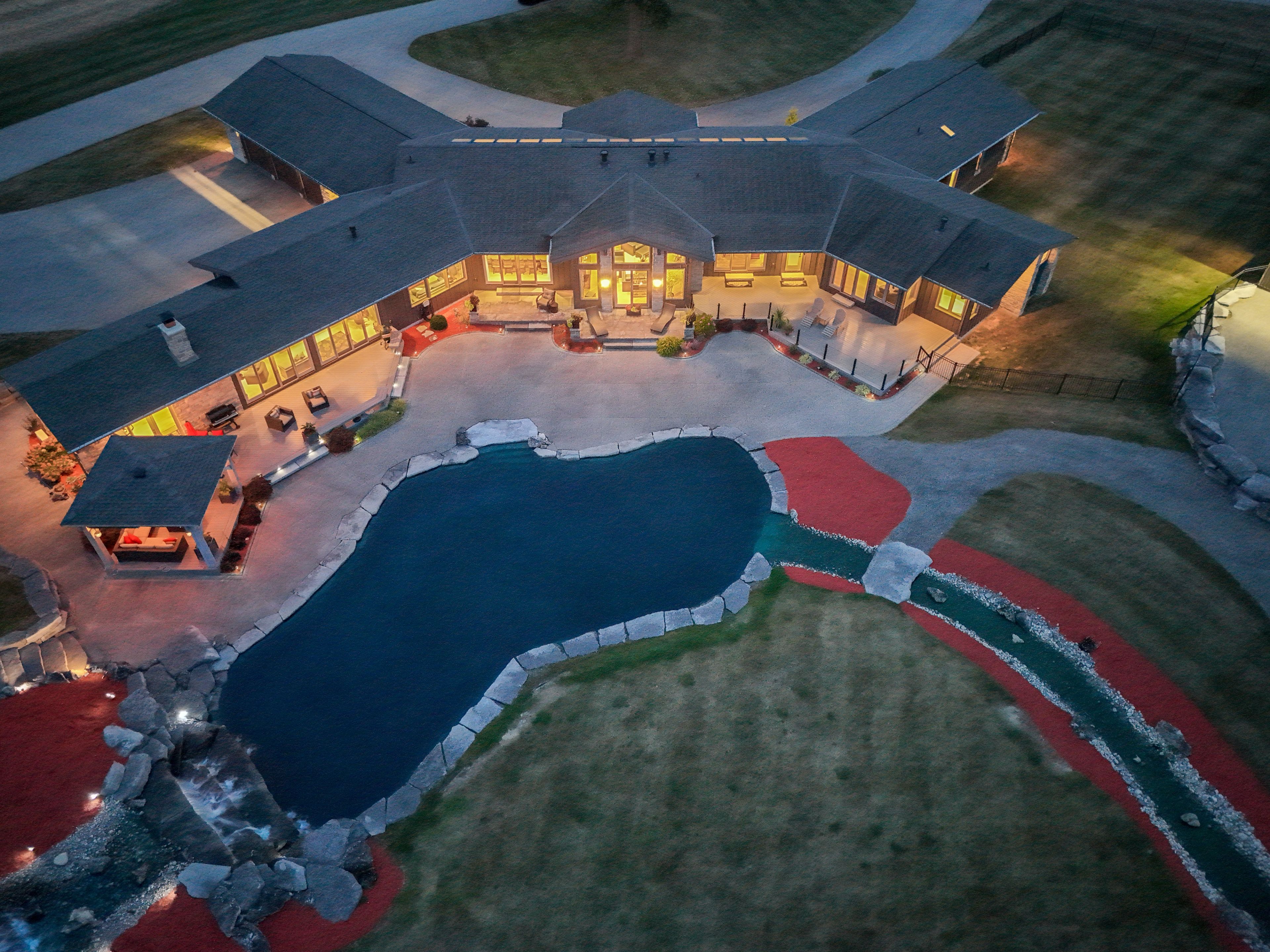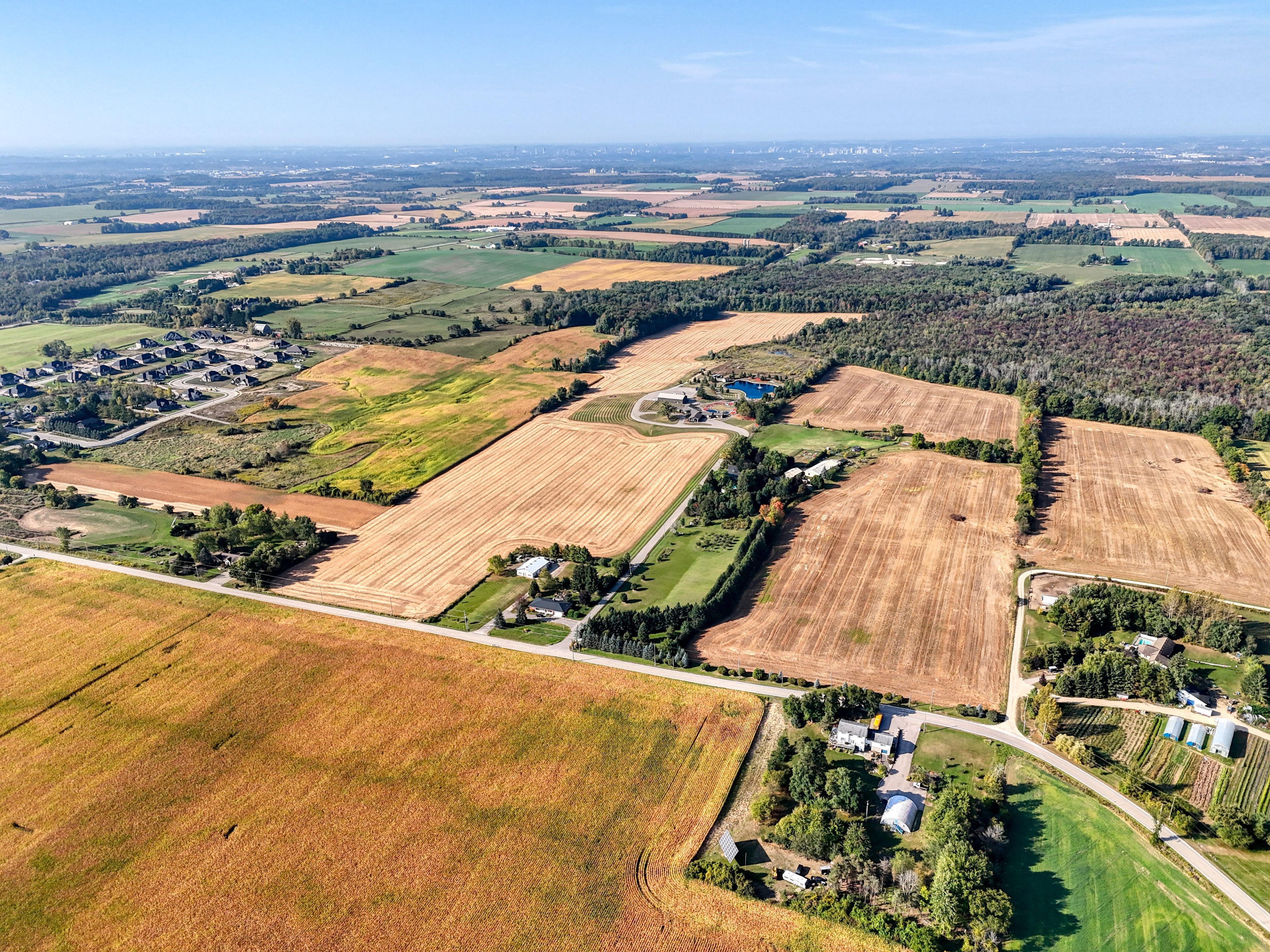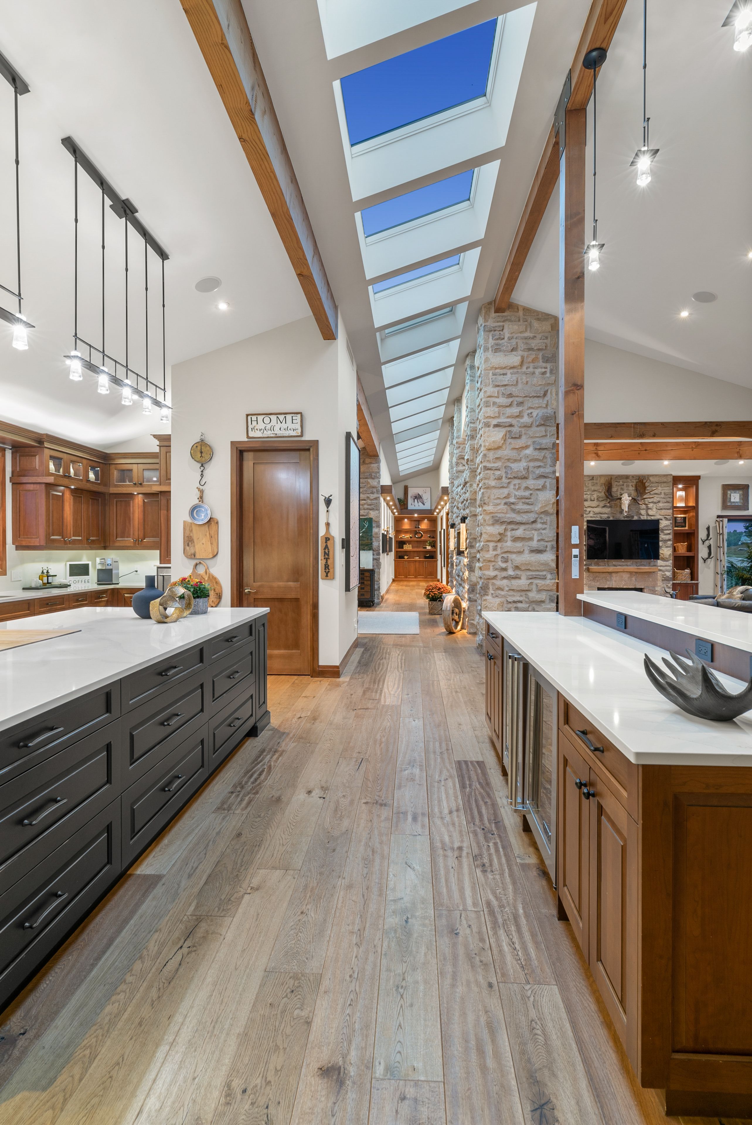 Set on over 120 acres of stunning countryside, this exceptional estate offers a rare combination of privacy, recreation, and luxury living, just minutes from cambridge, guelph, and kitchener-waterloo. The property is designed for year-round enjoyment, featuring two incredible ponds -one a swim pond perfect for cooling off on warm summer days, and the other a stocked fishing pond with a sandy beach and waterfall, creating a truly resort-like setting at home. Scenic trails wind throughout the property, offering endless opportunities to explore, relax, and enjoy the peaceful natural surroundings. The property also includes a heated 4,000 sq. Ft. Detached building with in-floor heating, offering incredible versatility for a workshop, car collection, equipment storage, hobby space, or recreational use. The custom-built stone bungalow offers an impressive 10,454 sq. Ft. Of finished living space, including 6,505 sq. Ft. On the main floor and a fully finished 3,949 sq. Ft. Lower level. Inside, soaring ceilings, skylights, and hand-chipped stone accents create a warm and inviting atmosphere, while natural wood details add character throughout. At the heart of the home is a spectacular gourmet kitchen featuring viking professional appliances, silestone quartz countertops, striking douglas fir beams, and dual islands designed for gathering and entertaining. The spacious dining area seats 14 and overlooks the picturesque ponds and surrounding landscape. An indoor grilling area with heated floors makes entertaining effortless in every season. The primary suite is a private retreat with direct access to the swim pond and a spa-like ensuite complete with a jacuzzi tub beside a cozy gas fireplace. The fully finished lower level is designed for relaxation and entertaining, offering a spacious recreation area, full bar, billiards space, wine cellar, and a private cinema room. A truly one-of-a-kind property where luxury living meets the beauty of nature.