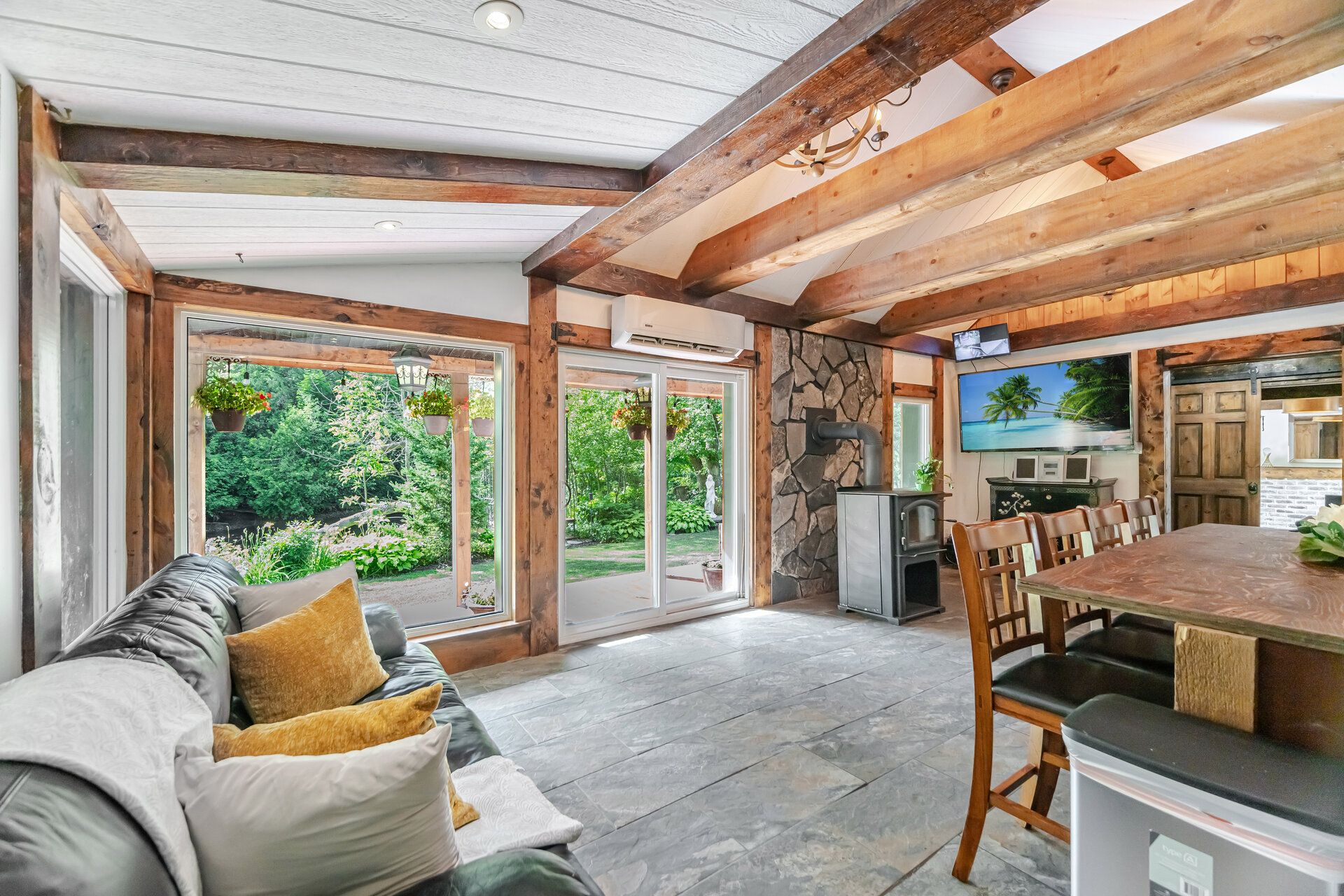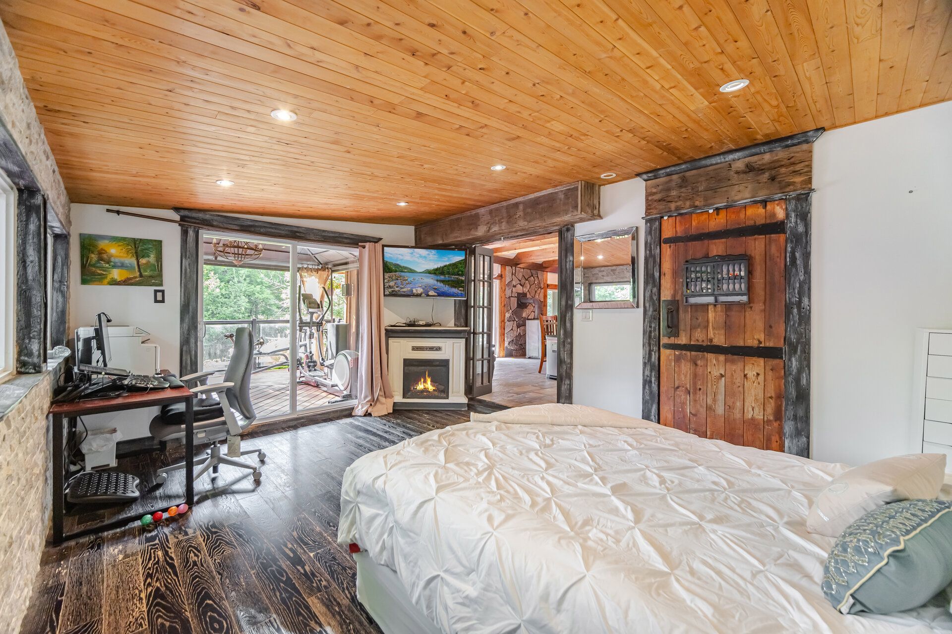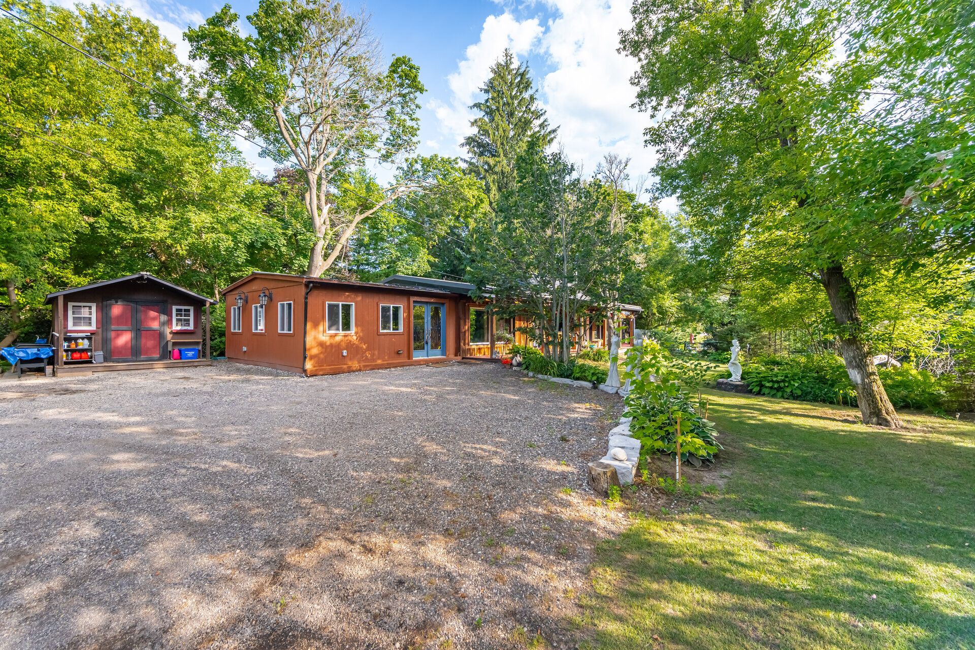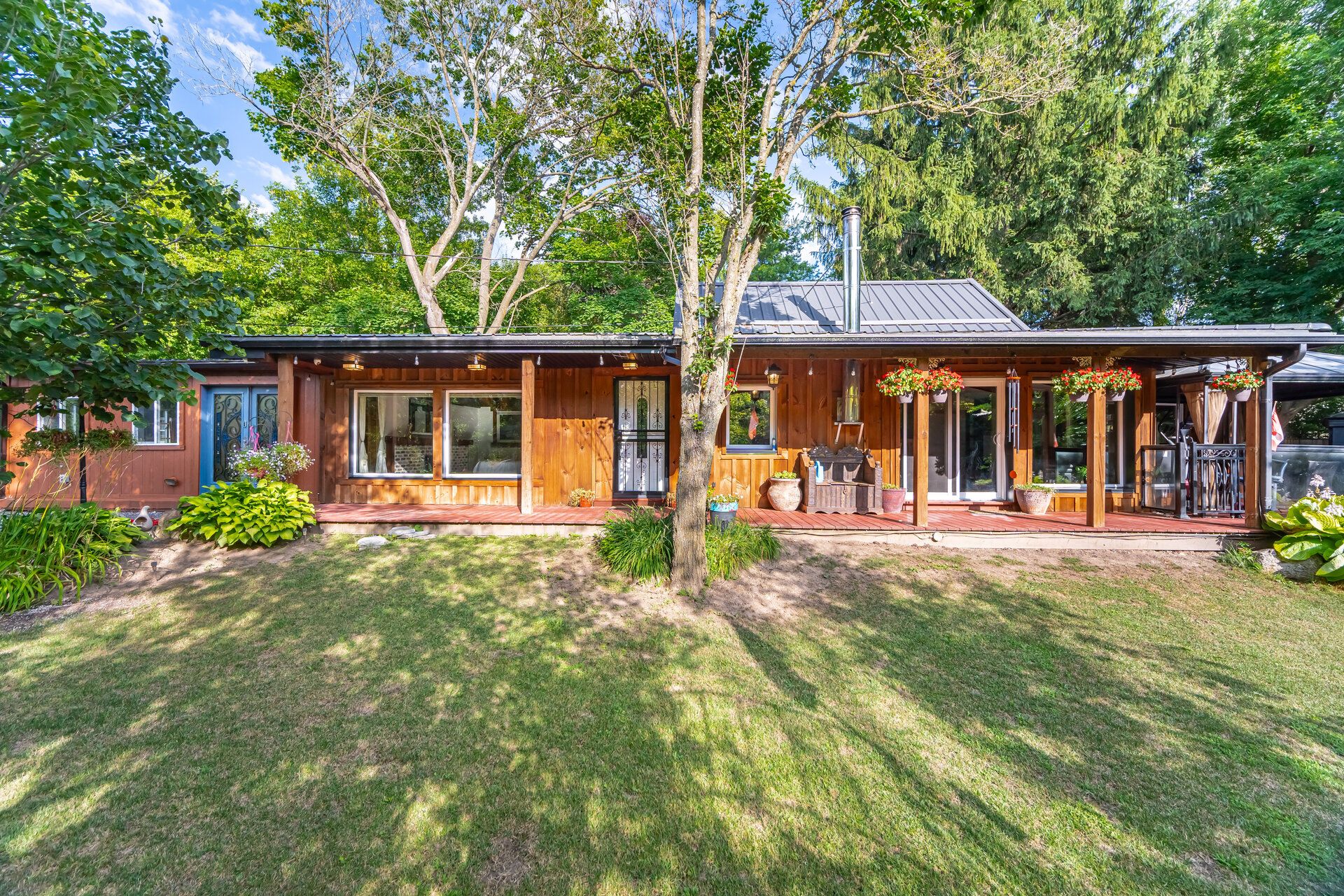 Set on over 0. 7-acre of property enjoy this unique characteristic cottage-style home. As you enter the circular driveway and see the eye-catching river scenic views. Inside, the 2 bedroom bungalow style home features rustic wood and stone finishes, vaulted ceilings, and elegant light fixtures. It boasts a country-style kitchen with stainless steel appliances, a wood stove, fireplaces, and heated bathroom floors. Large windows and multiple walkouts in every room provide stunning viewsthe exterior includes a charming covered front porch, perennial gardens, a large, enclosed dog run, gazebos with lighting and speakers, a hot tub, and a 1200 sq ft two-tier deck with glass railings. Additionally, there's over 300 feet of riverfront for fishing.