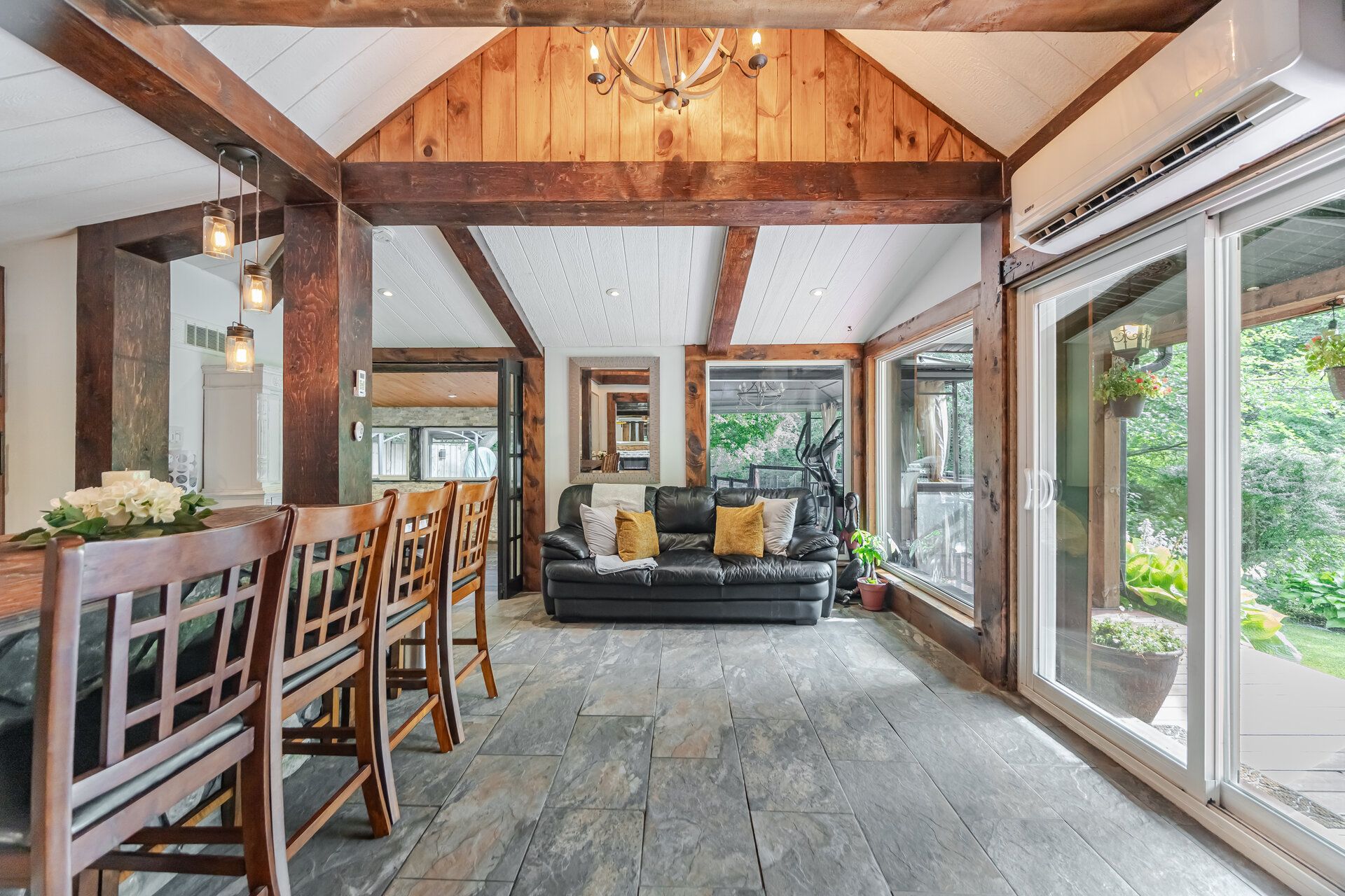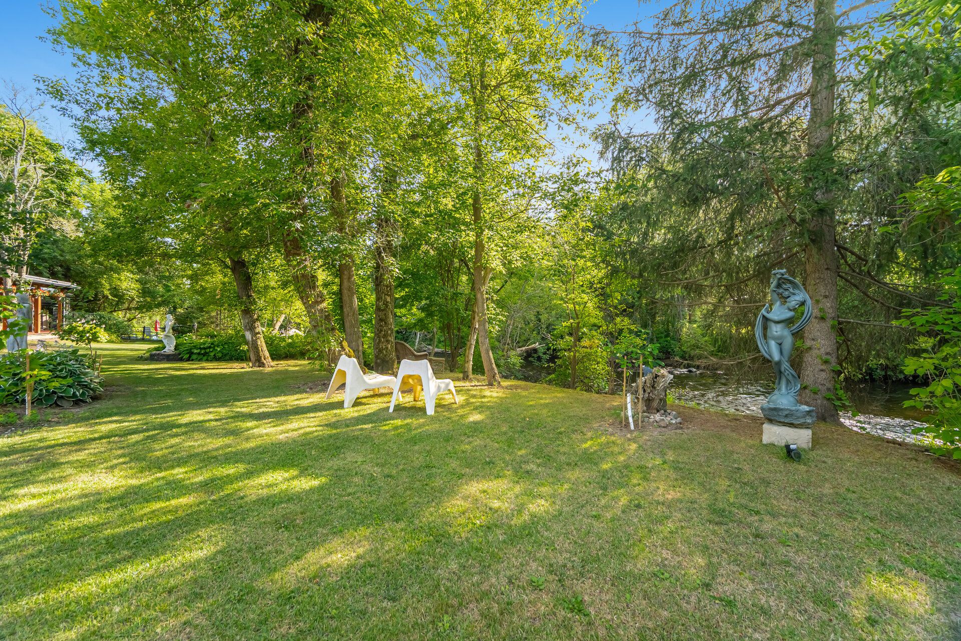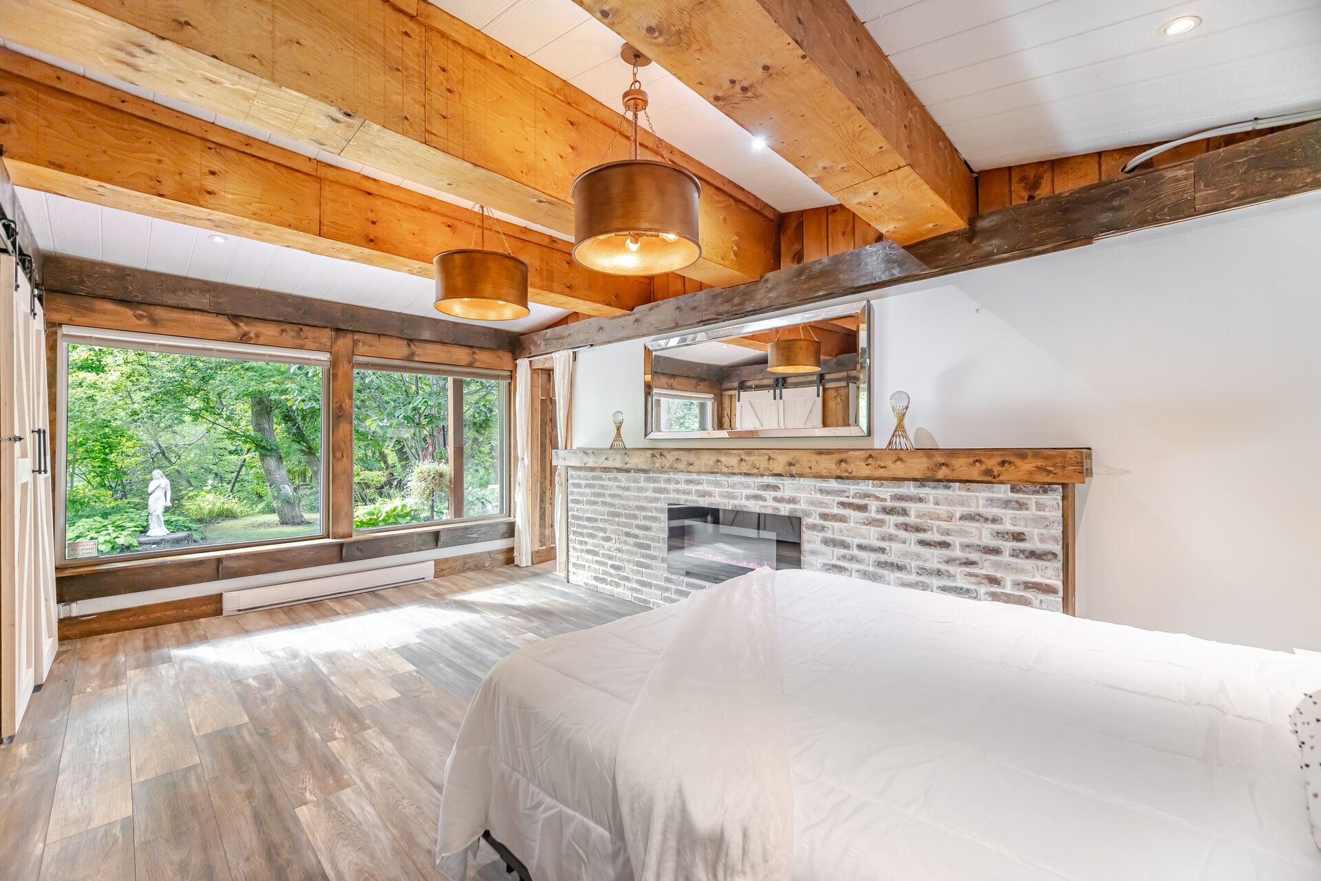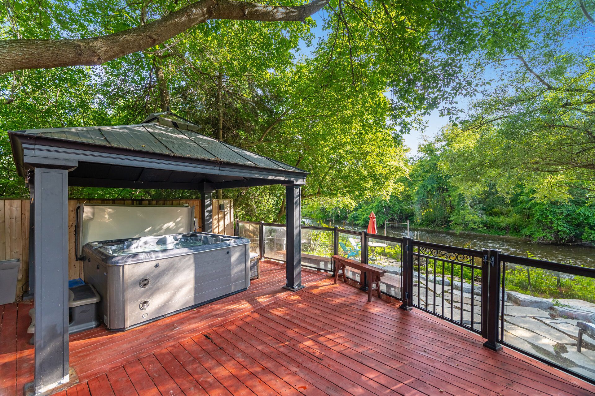 Set on over 0. 7-acre of property enjoy this unique characteristic cottage-style home. As you enter the circular driveway and see the eye-catching river scenic views. Inside, the 2 bedroom bungalow style home features rustic wood and stone finishes, vaulted ceilings, and elegant light fixtures. It boasts a country-style kitchen with stainless steel appliances, a wood stove, fireplaces, and heated bathroom floors. Large windows and multiple walkouts in every room provide stunning viewsthe exterior includes a charming covered front porch, perennial gardens, a large, enclosed dog run, gazebos with lighting and speakers, a hot tub, and a 1200 sq ft two-tier deck with glass railings. Additionally, there's over 300 feet of riverfront for fishing.