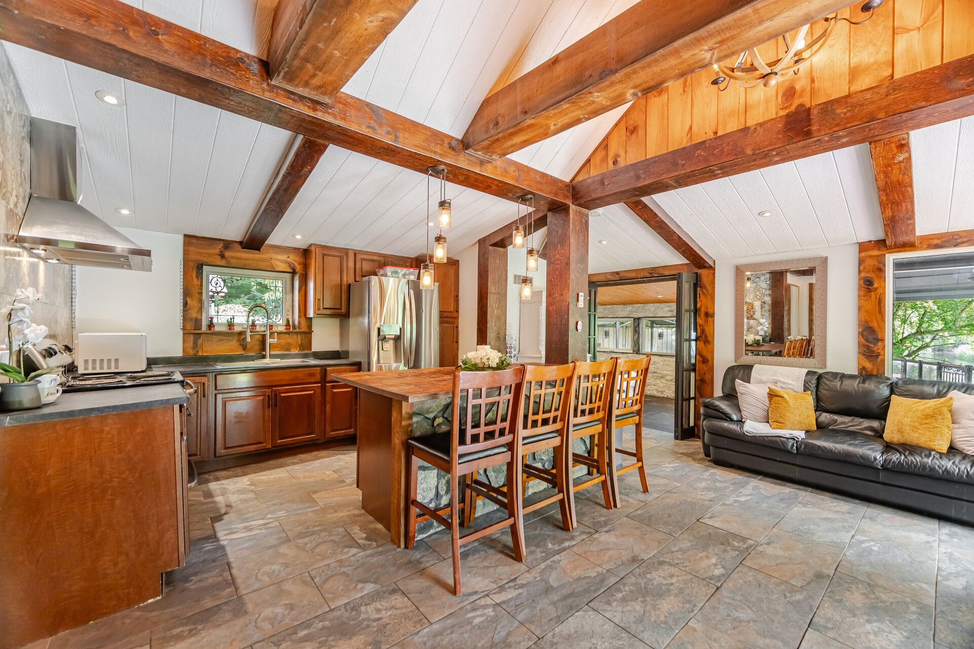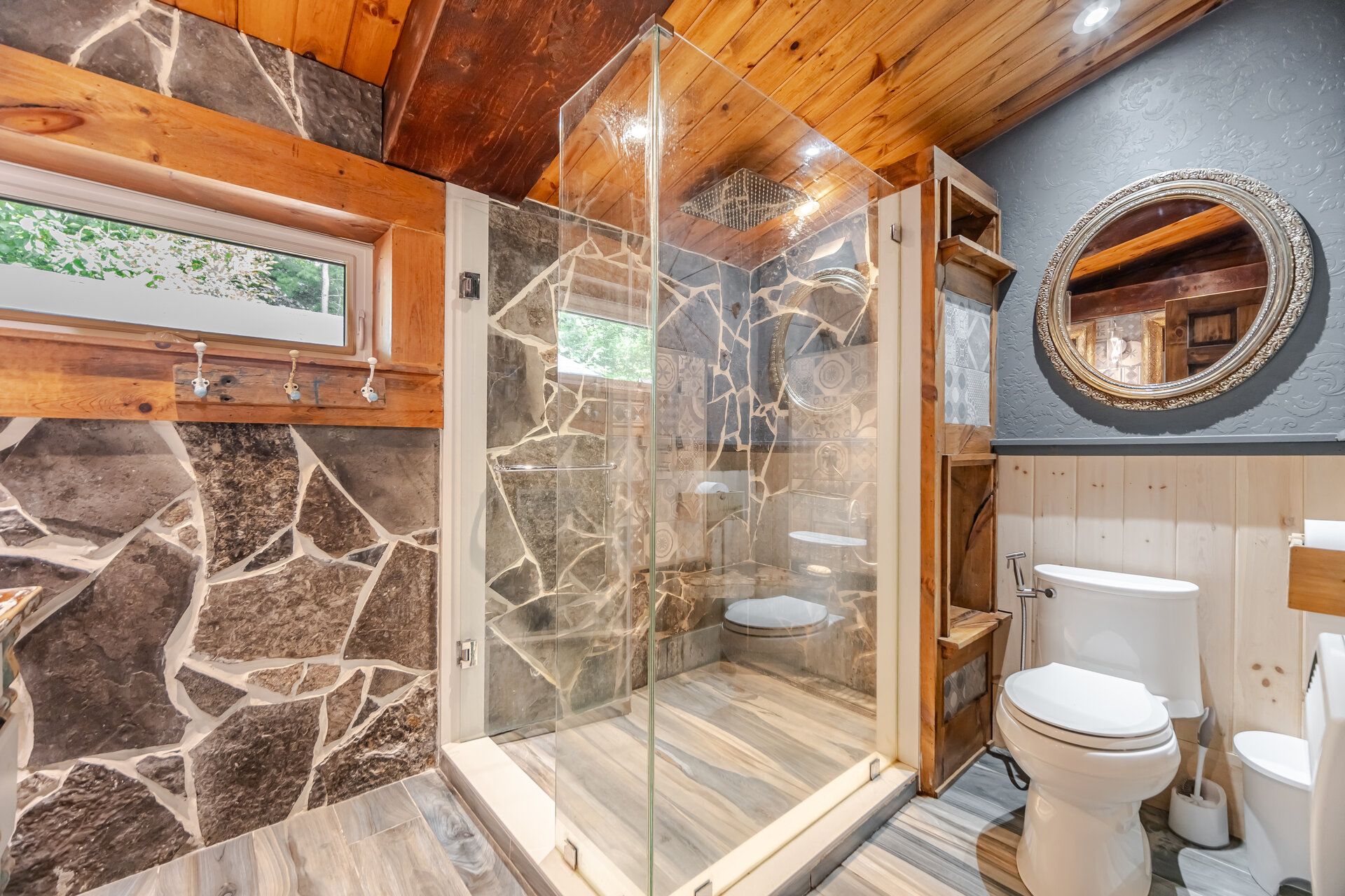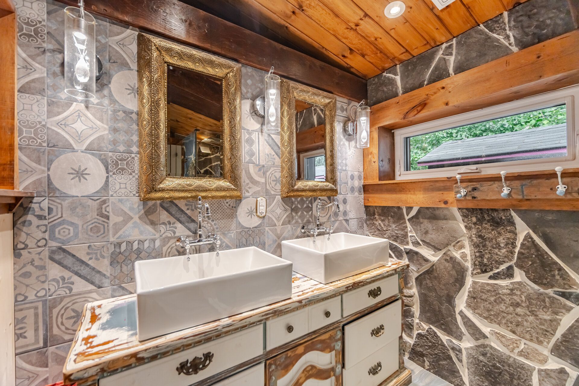 • Two-bedroom bungalow featuring rustic wood, stone finishes, and vaulted ceilings.