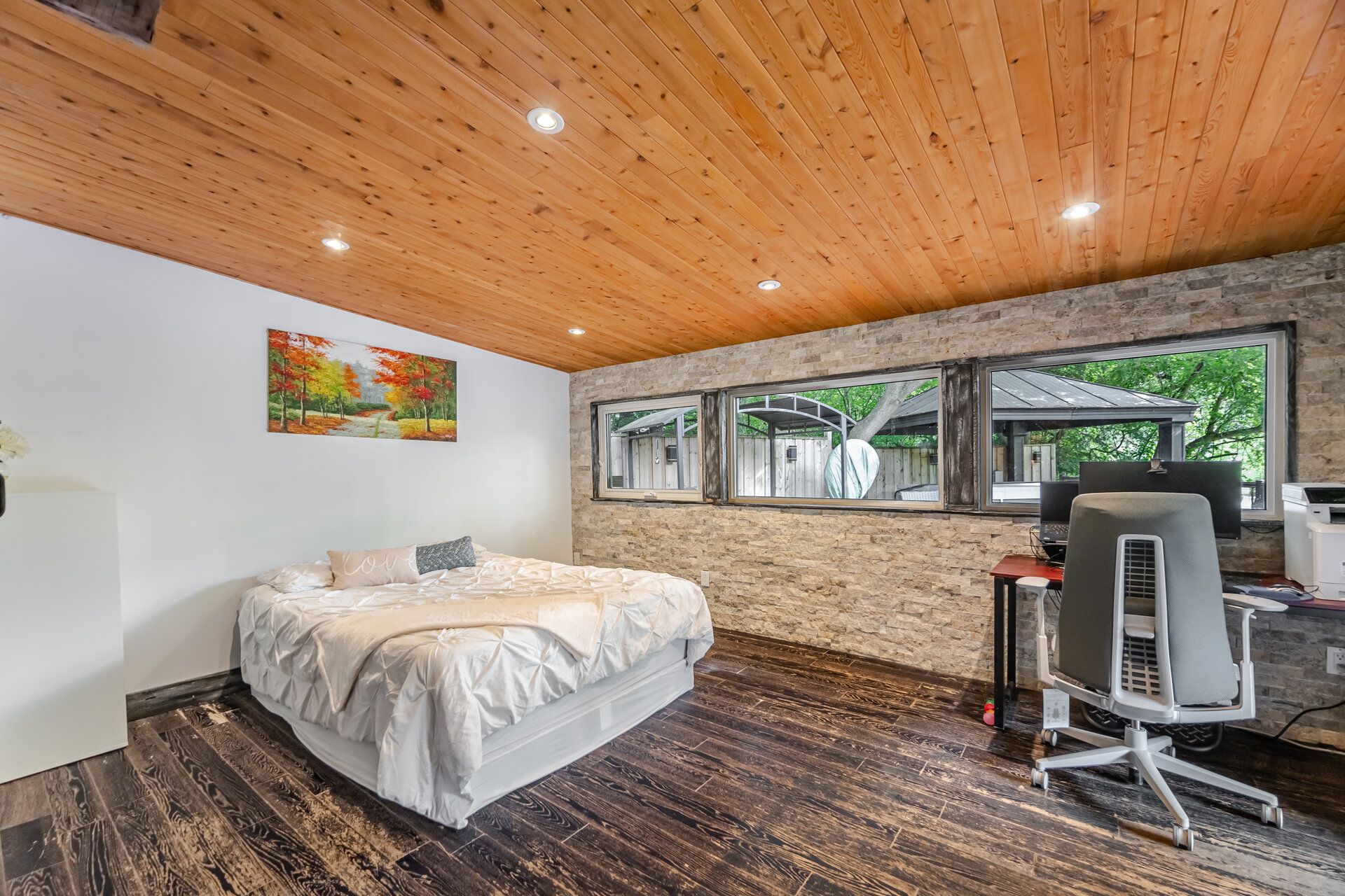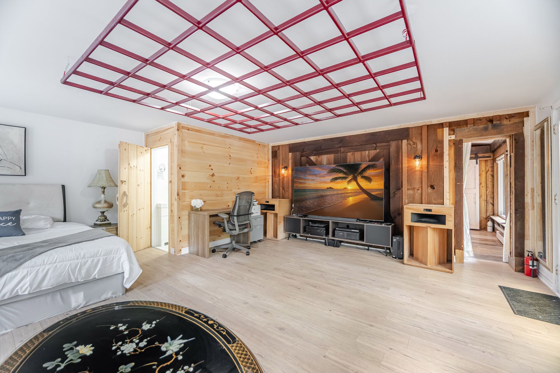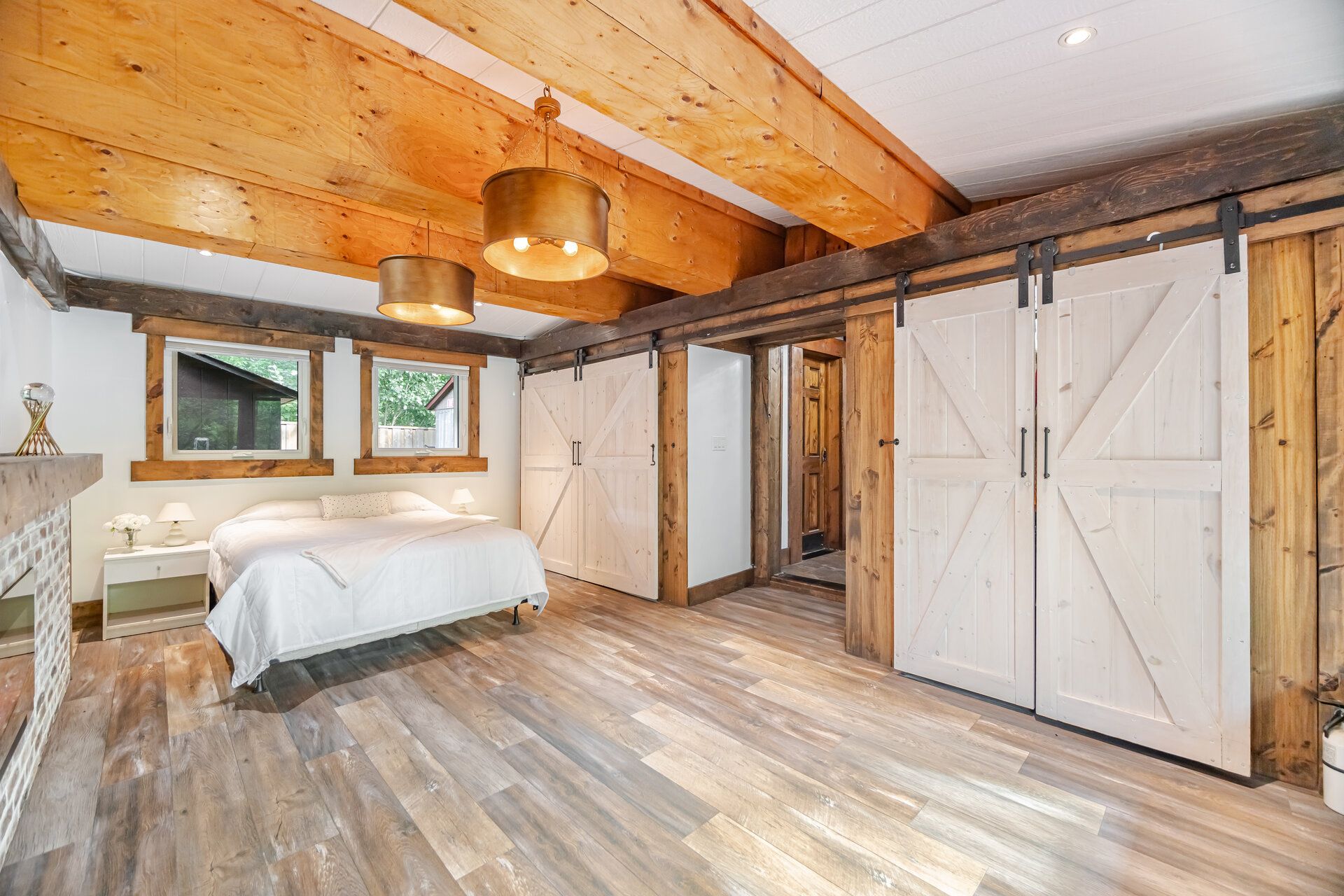 • Two-bedroom bungalow featuring rustic wood, stone finishes, and vaulted ceilings.