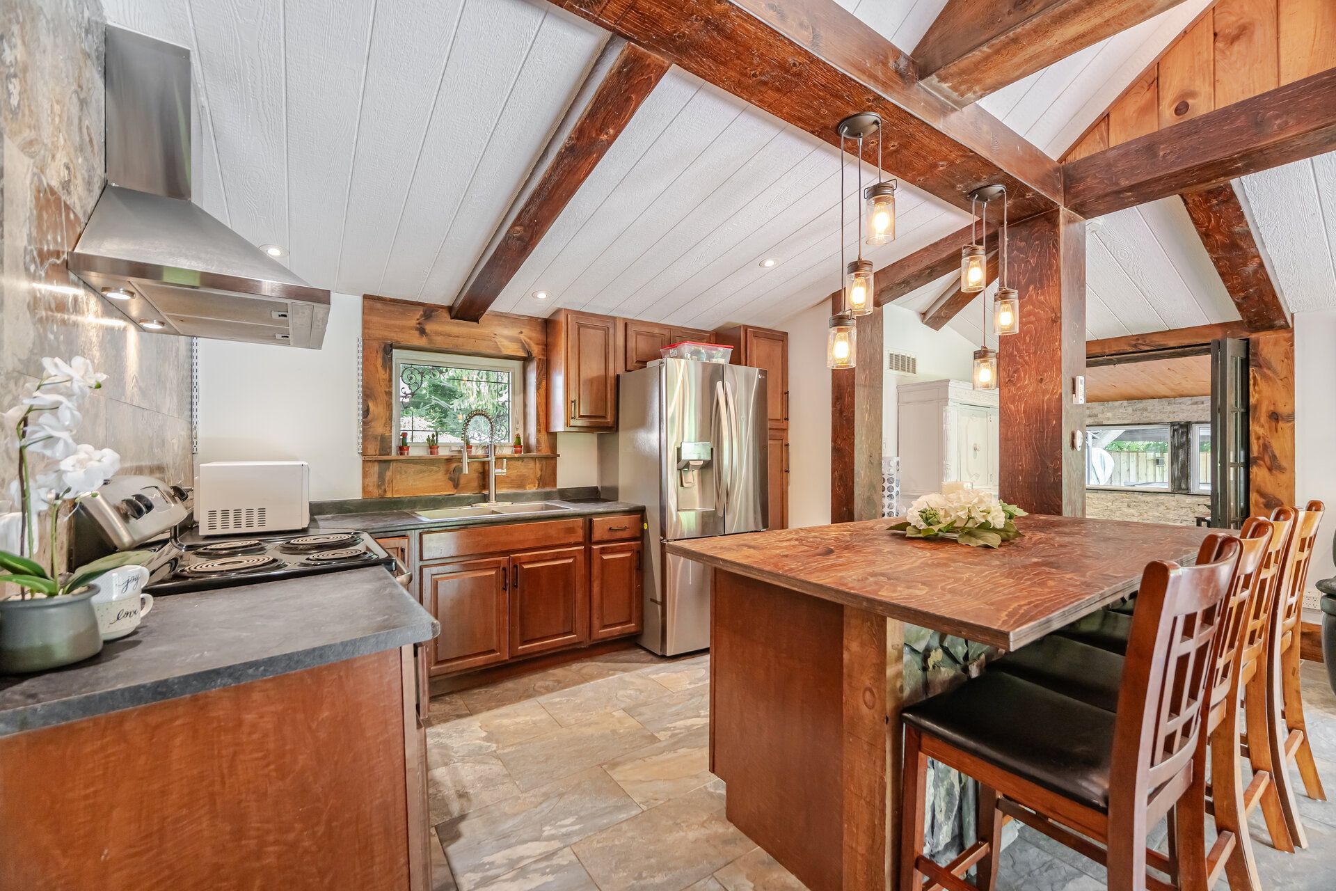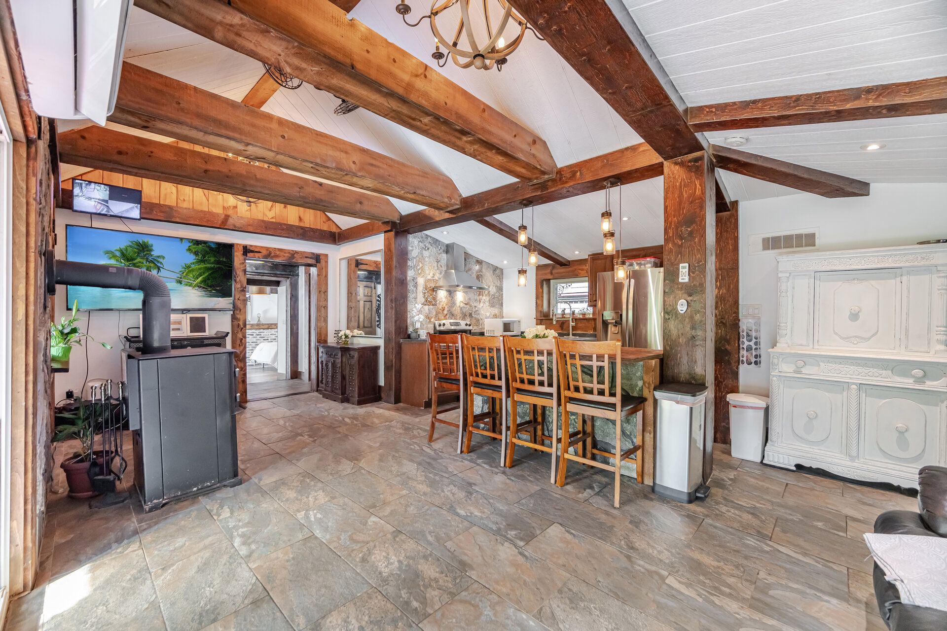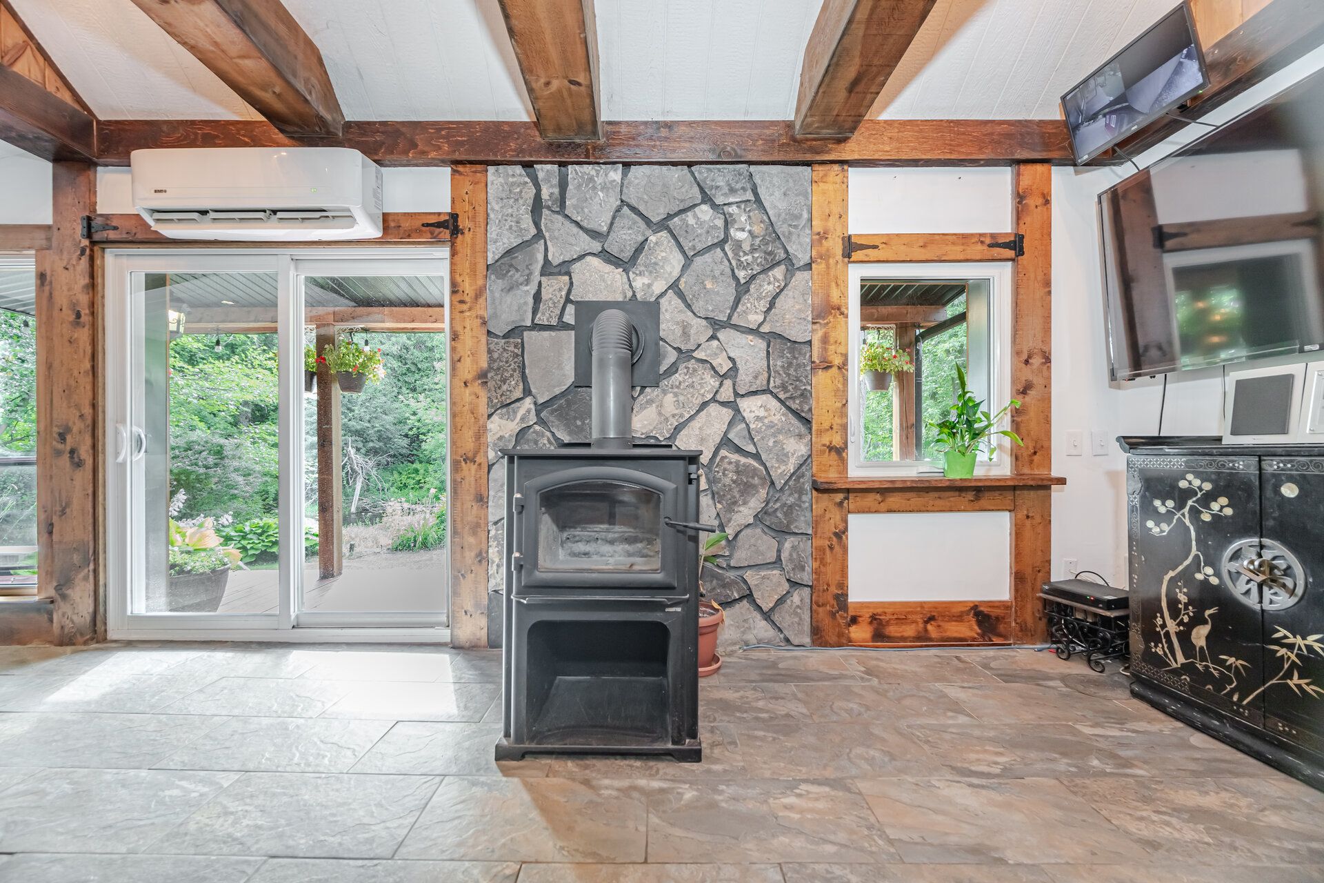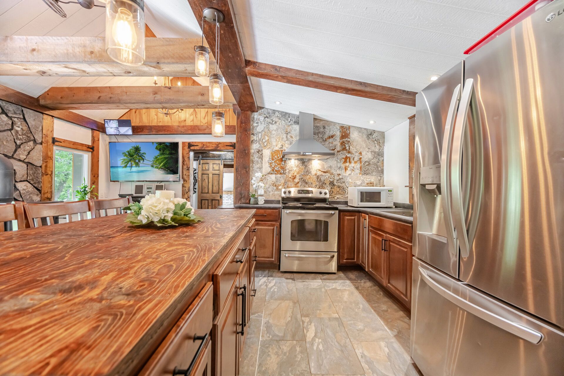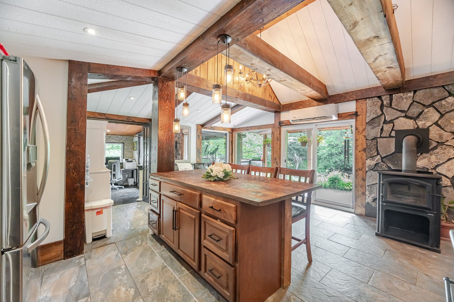 • Country-style kitchen equipped with stainless steel appliances and wood stove.