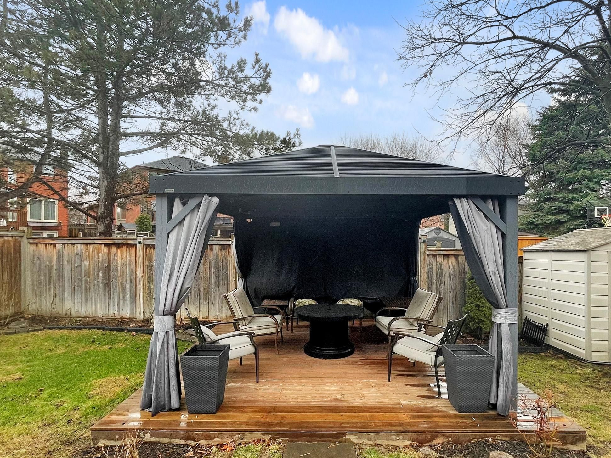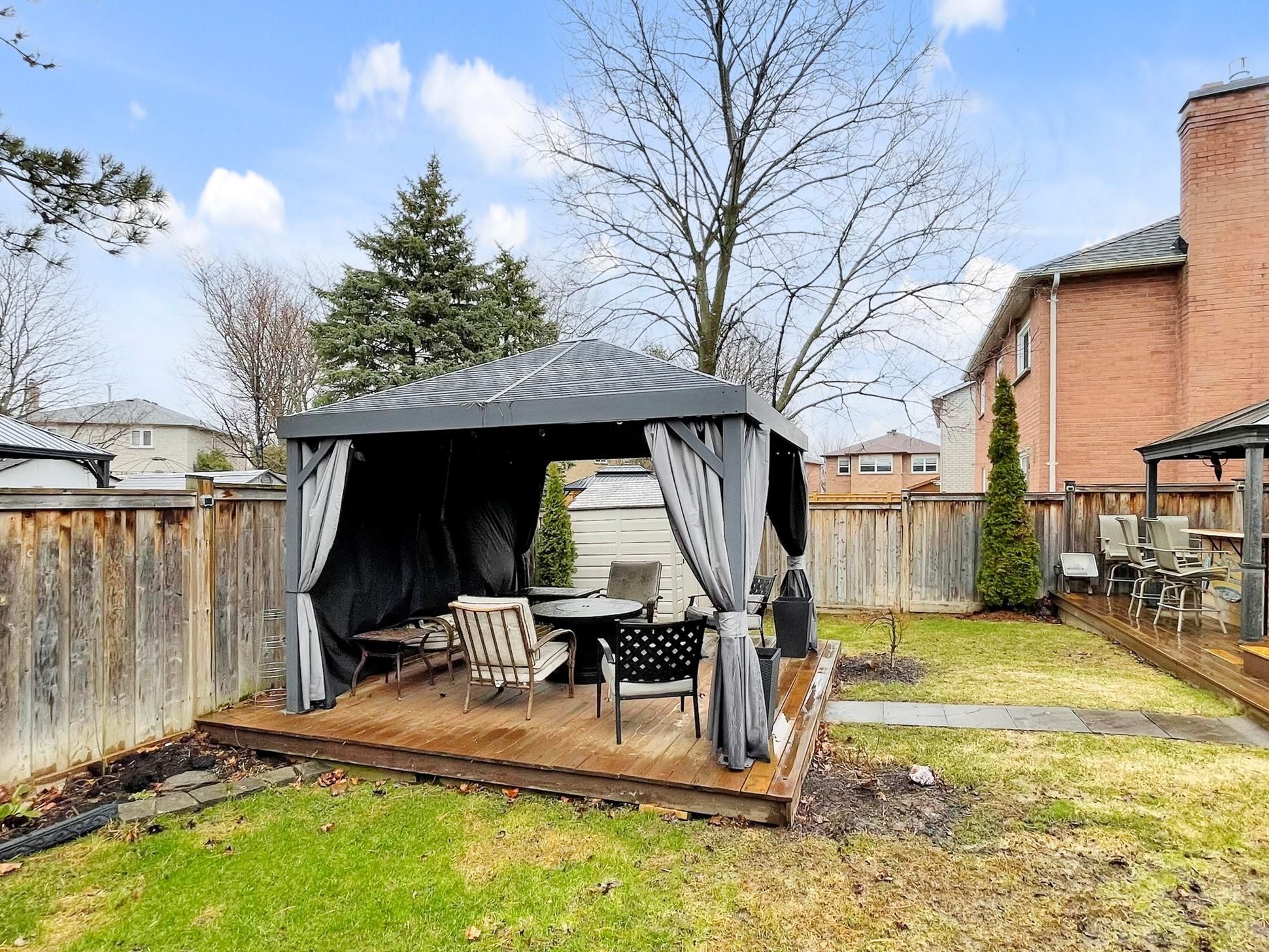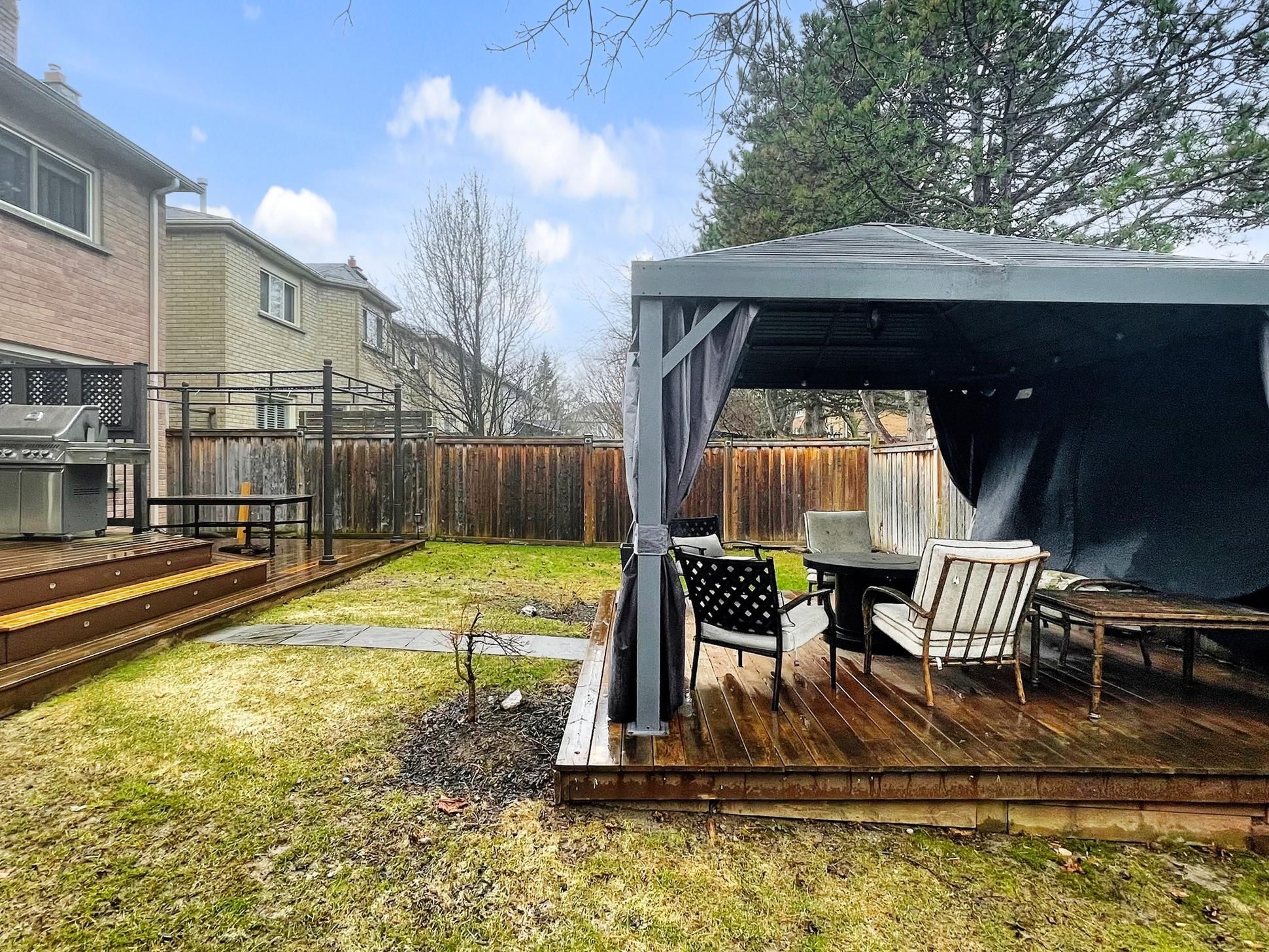• Beautiful backyard retreat with deck, gazebo, and ample lawn area.