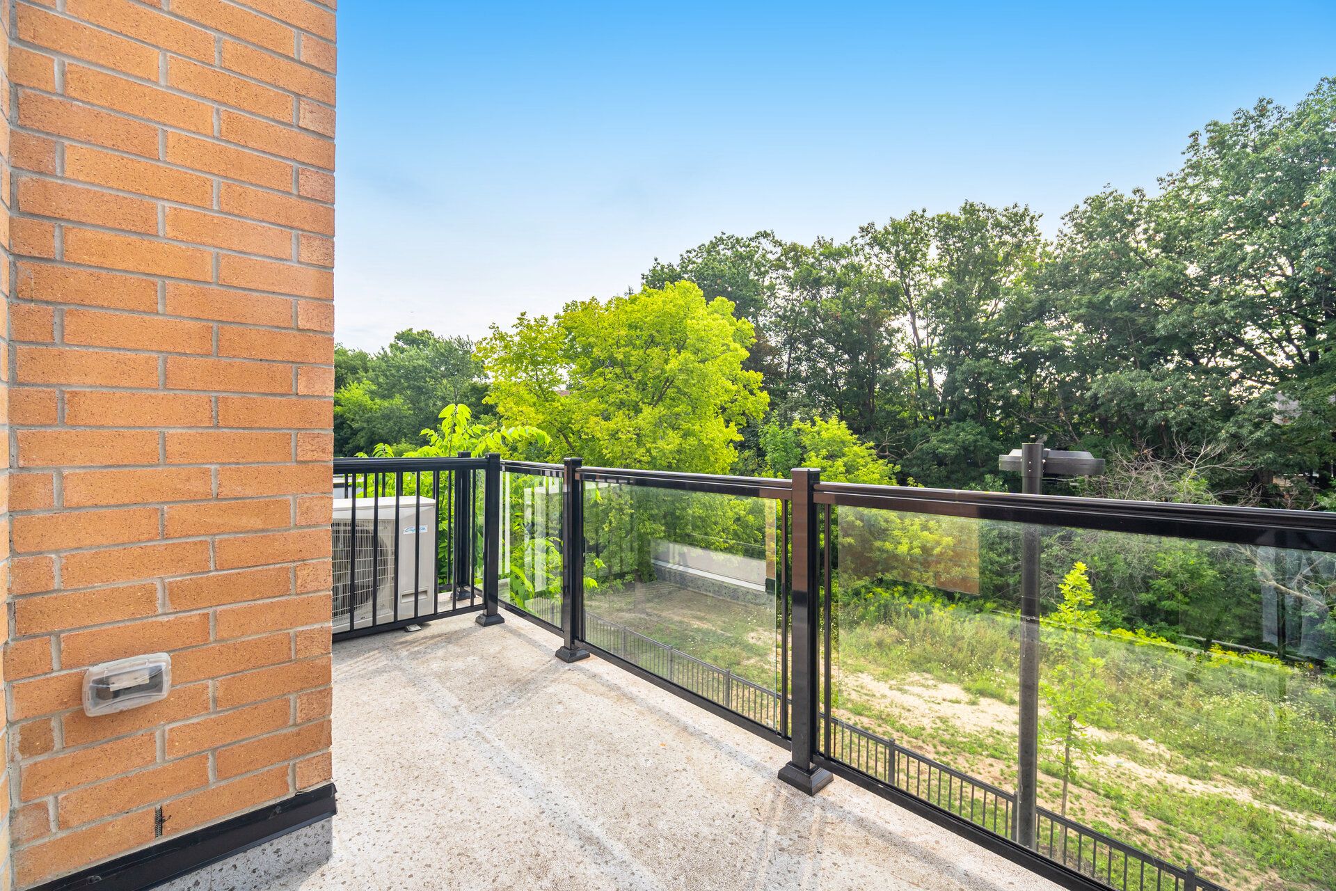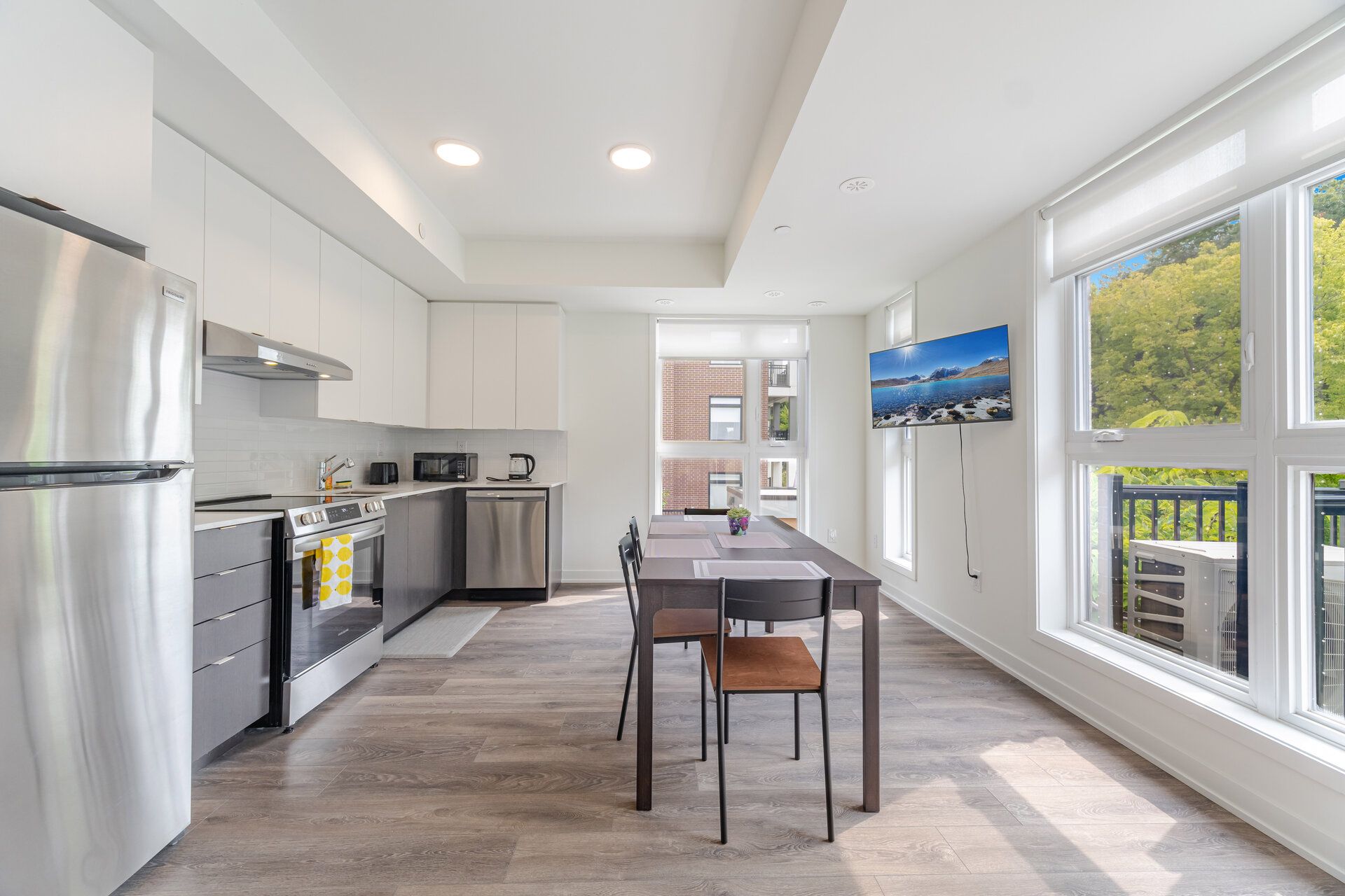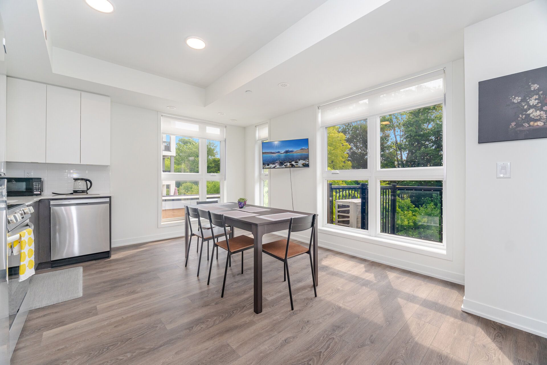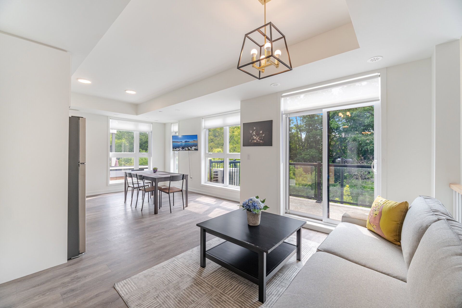 Furnished & flexible lease options welcome to this contemporary 2-storey townhome facing the private wooded area in one of toronto's most connected and rapidly evolving neighbourhoods. This bright, spacious home features three private en-suite bedrooms, each with its own separate entrance, ideal for privacy, flexibility, and shared living. Two of the bedrooms feature large private balconies, while the main floor opens up to a massive shared terrace, perfect for outdoor relaxation. The open-concept main level boasts a sun-filled living and dining area, a modern kitchen with full-sized appliances, and a versatile bedroom great for guests, extended family, or a home office setup. Upstairs, two oversized bedrooms each include private en-suites and ample closet space, offering rare comfort and convenience in a city setting. Enjoy serene views of landscaped green space and easy access to walking trails, parks, and a children's playground. Located in the daniels keelesdale community, you're just minutes from the new eglinton lrt, major highways, schools, shops, and daily essentials. Utilities included. Gym and recreation centre access available. Option without furniture $3550