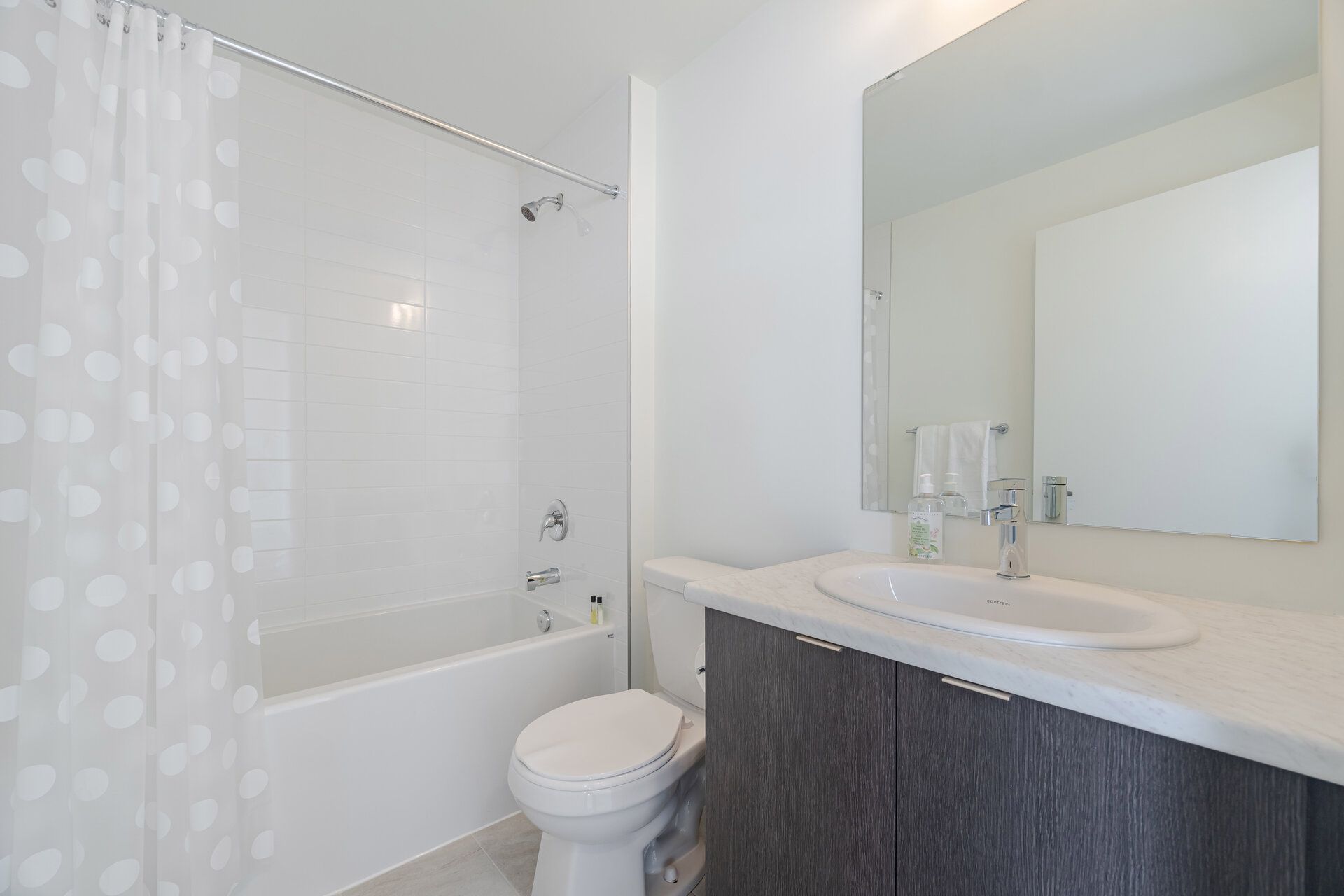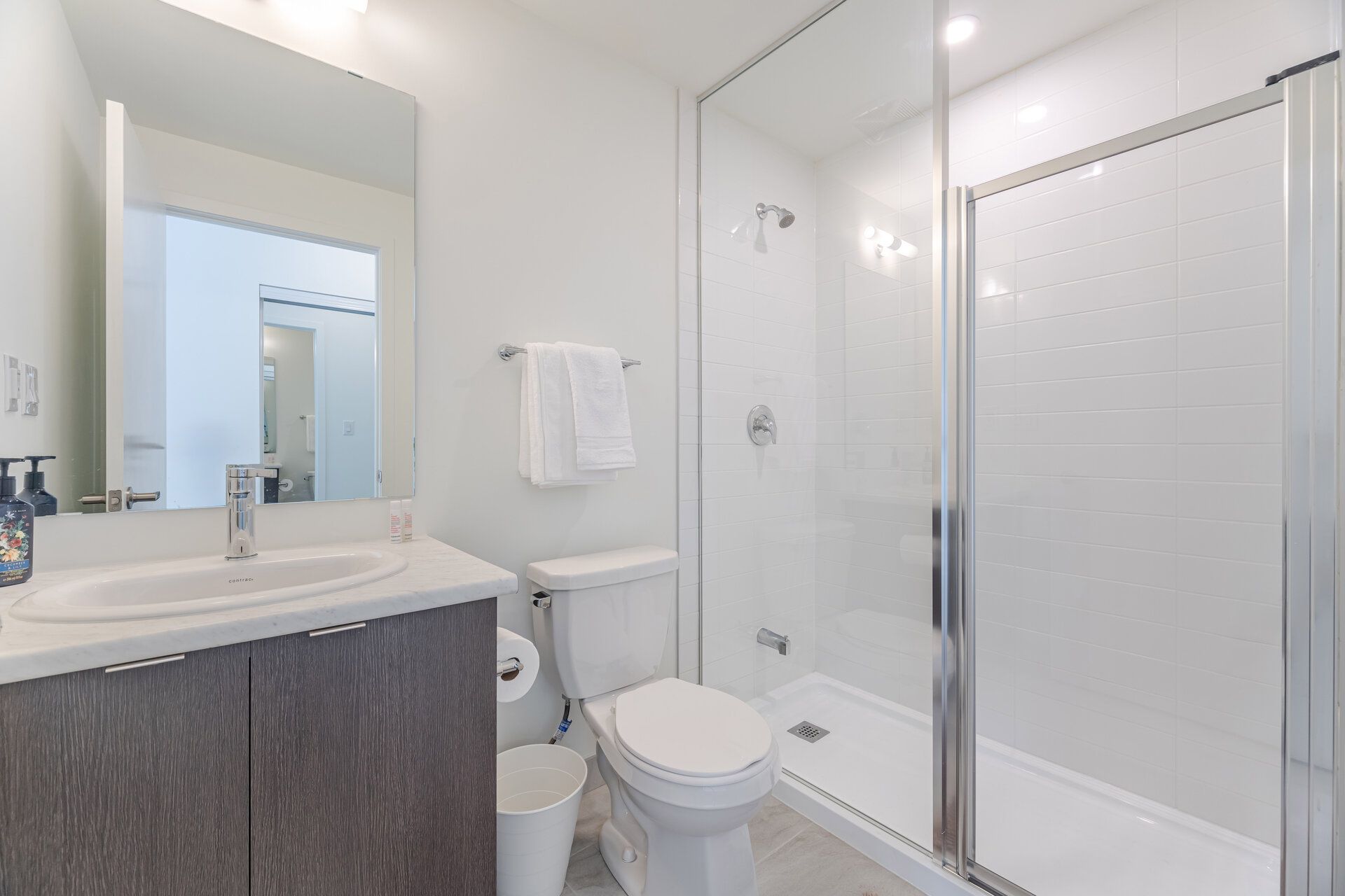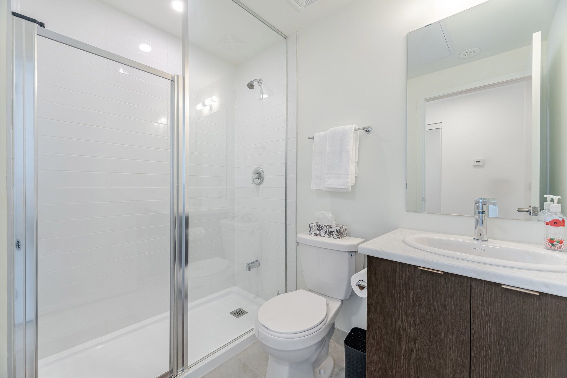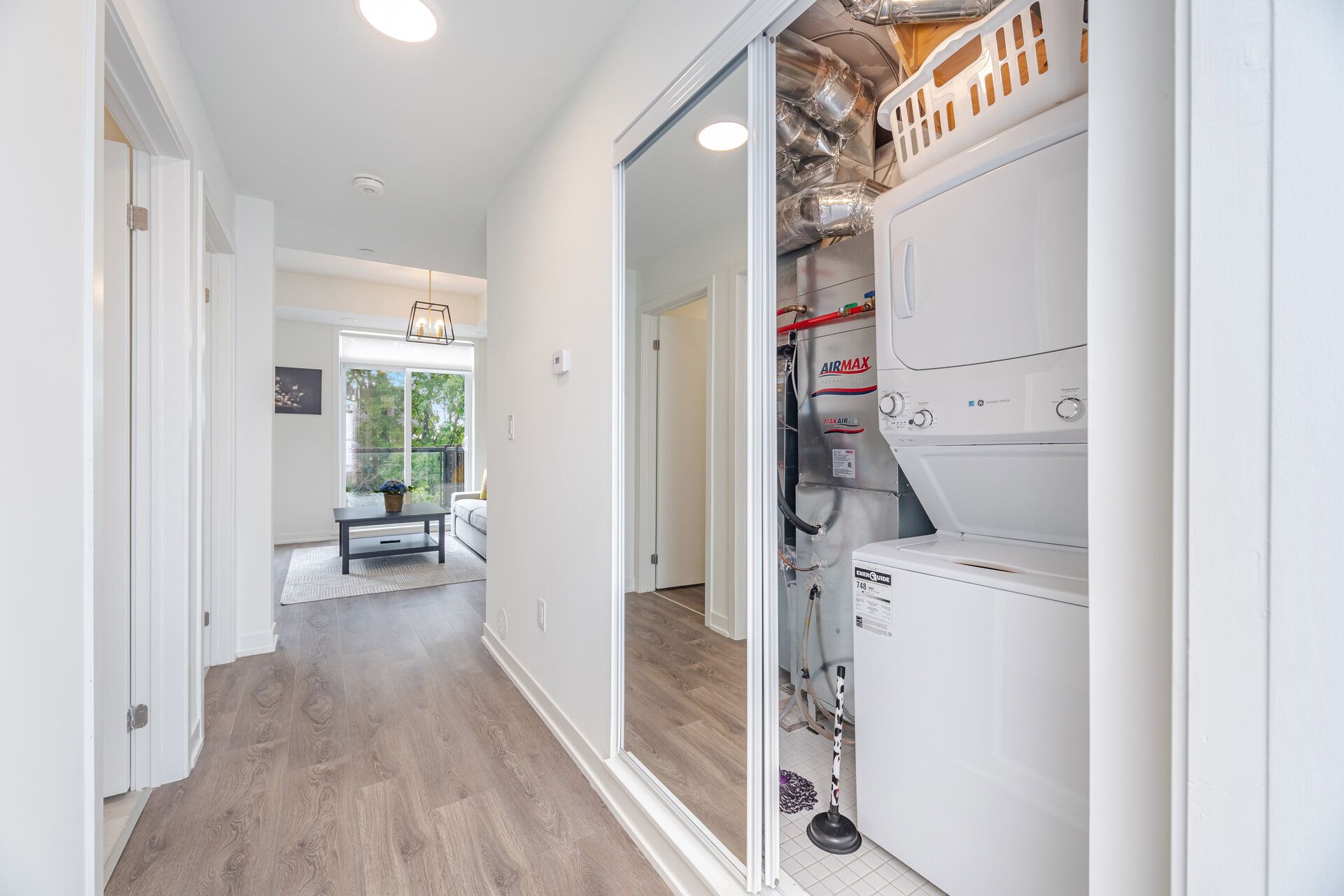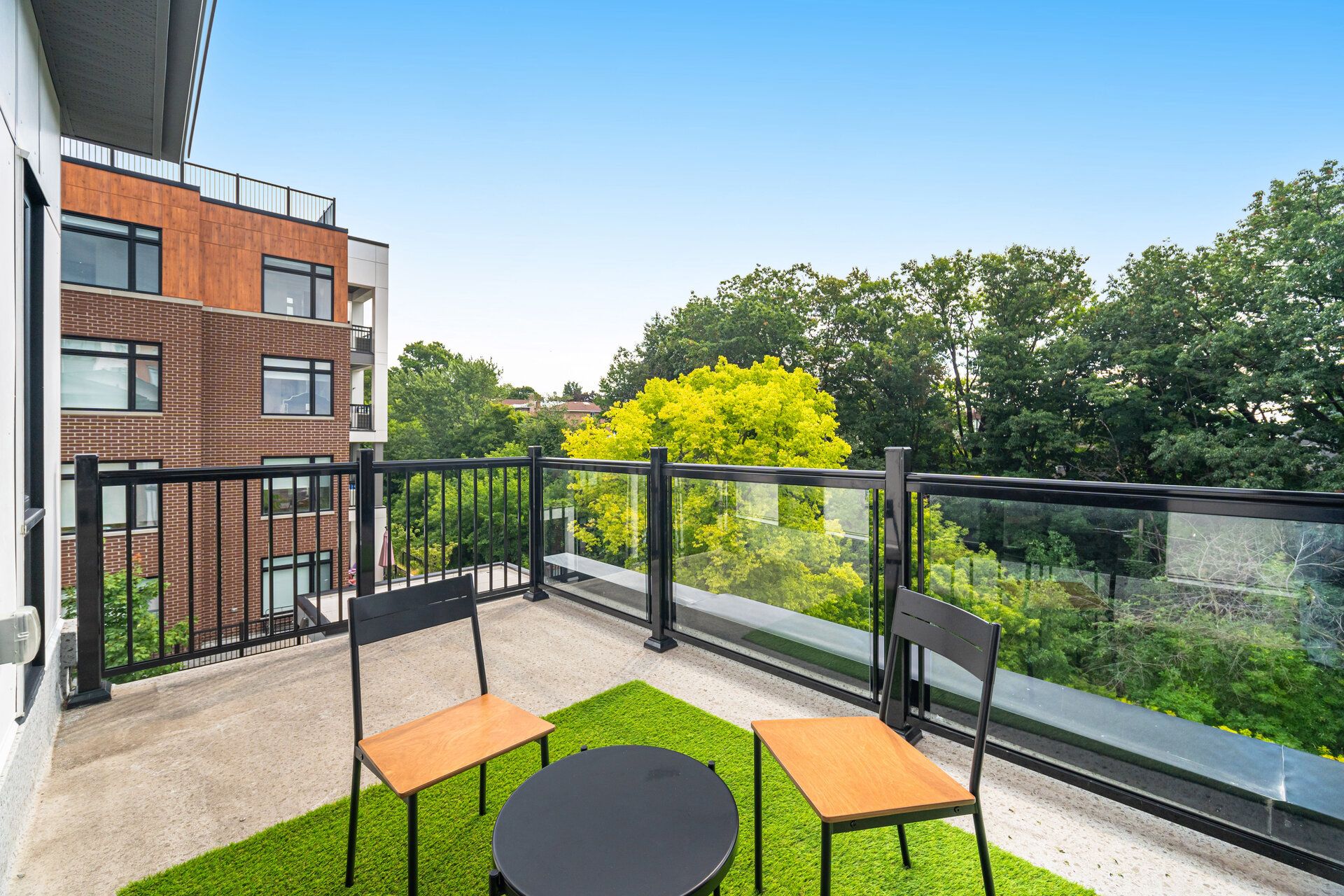 Furnished & flexible lease options welcome to this contemporary 2-storey townhome facing the private wooded area in one of toronto's most connected and rapidly evolving neighbourhoods. This bright, spacious home features three private en-suite bedrooms, each with its own separate entrance, ideal for privacy, flexibility, and shared living. Two of the bedrooms feature large private balconies, while the main floor opens up to a massive shared terrace, perfect for outdoor relaxation. The open-concept main level boasts a sun-filled living and dining area, a modern kitchen with full-sized appliances, and a versatile bedroom great for guests, extended family, or a home office setup. Upstairs, two oversized bedrooms each include private en-suites and ample closet space, offering rare comfort and convenience in a city setting. Enjoy serene views of landscaped green space and easy access to walking trails, parks, and a children's playground. Located in the daniels keelesdale community, you're just minutes from the new eglinton lrt, major highways, schools, shops, and daily essentials. Utilities included. Gym and recreation centre access available. Option without furniture $3550