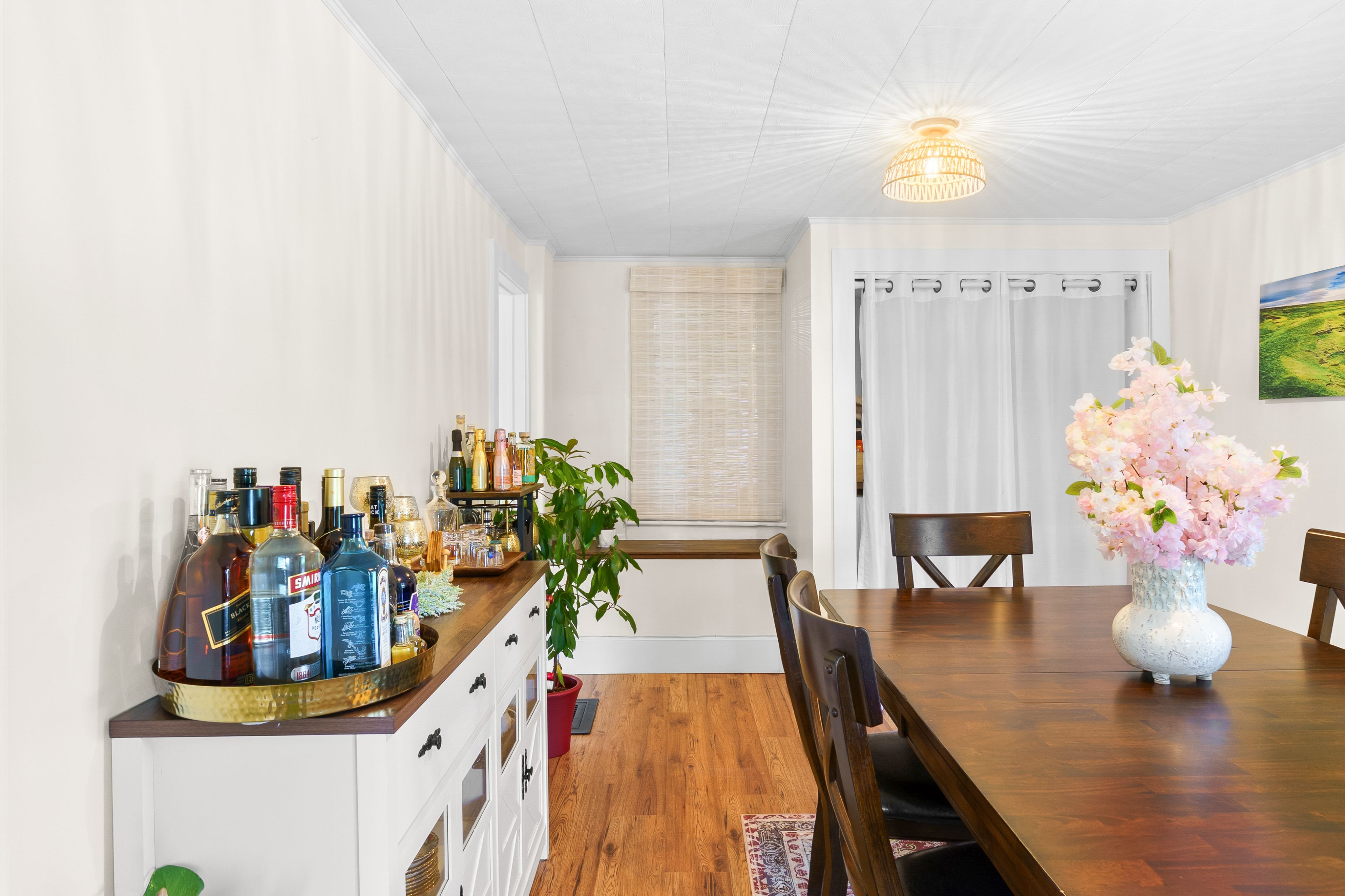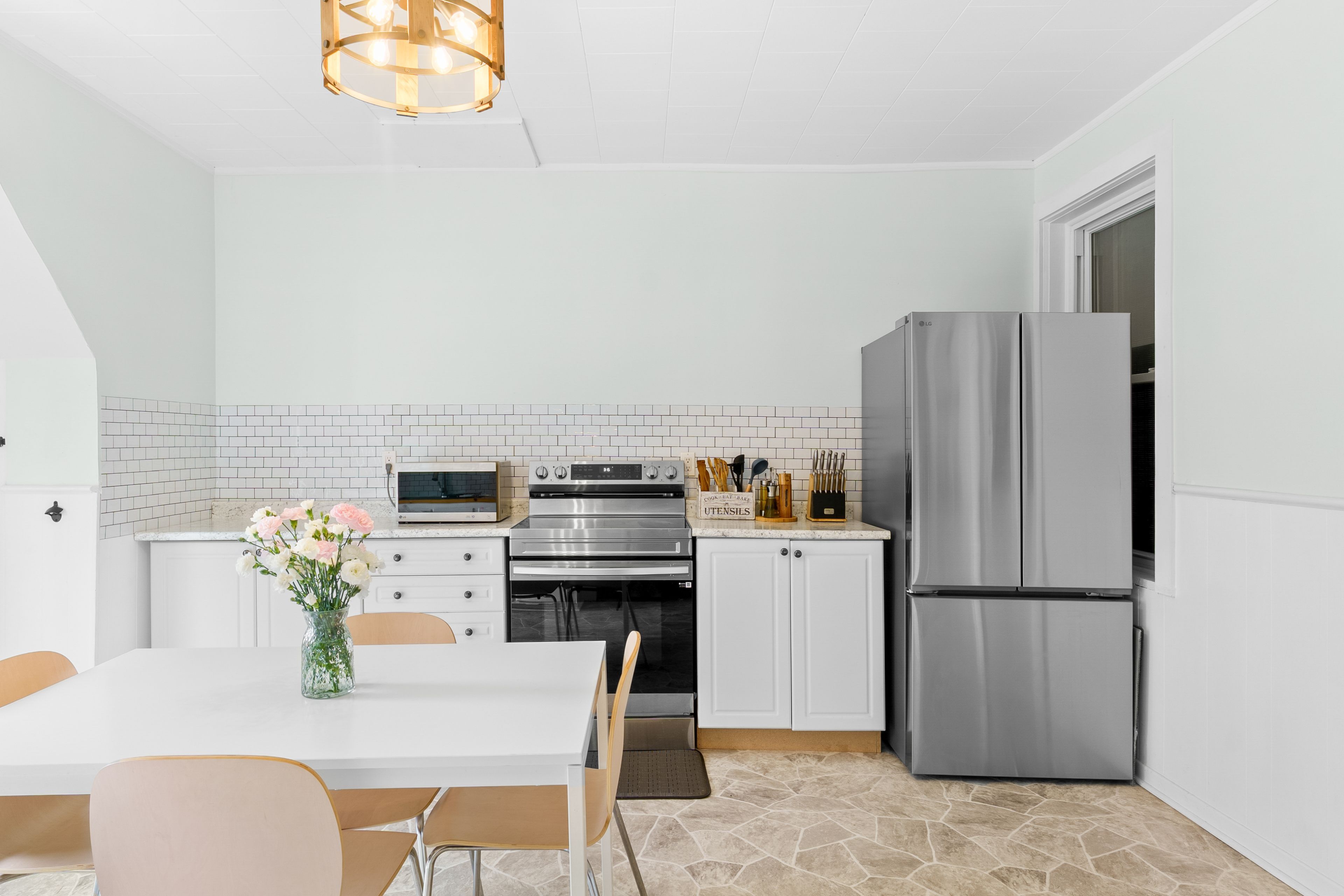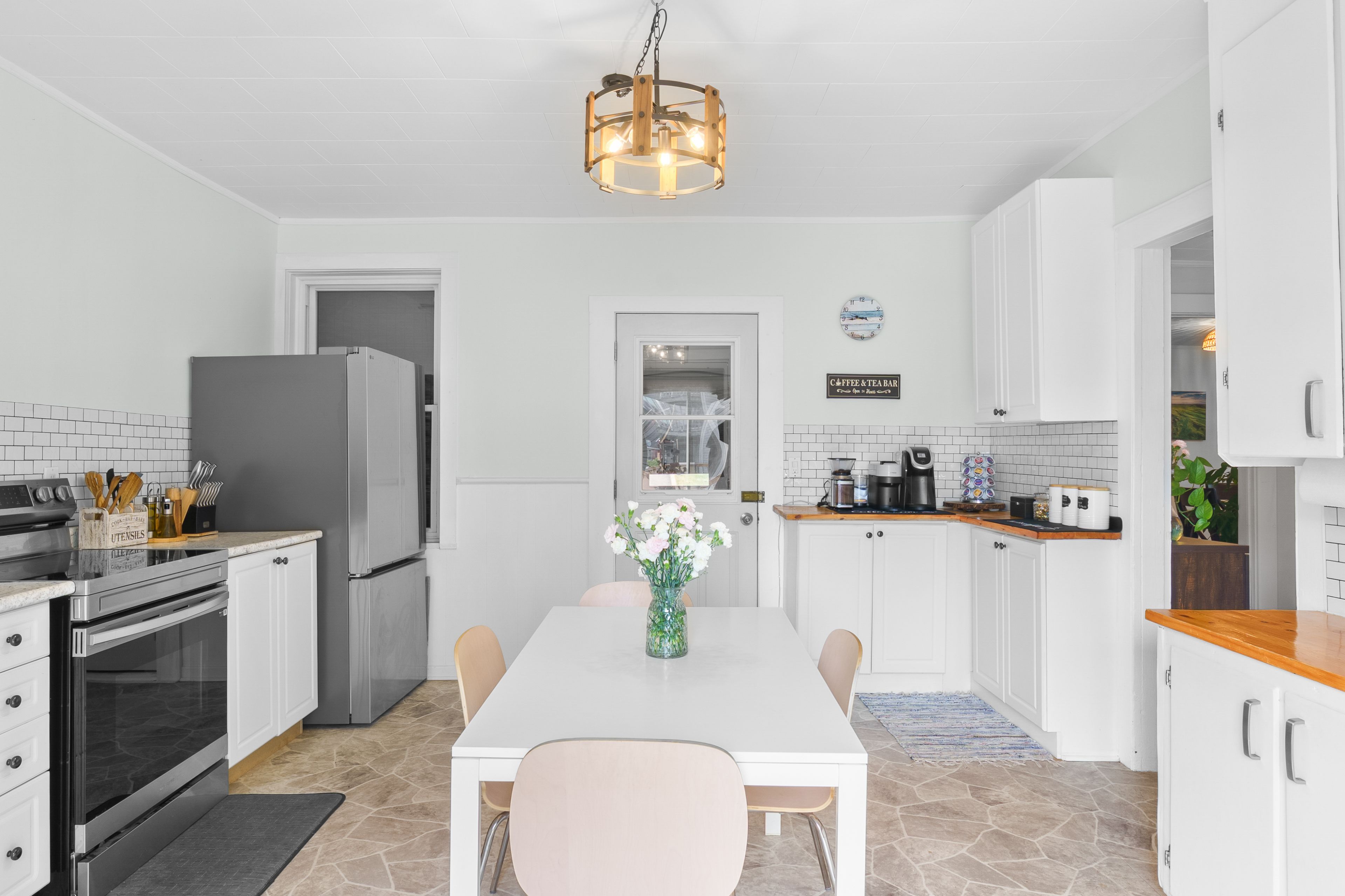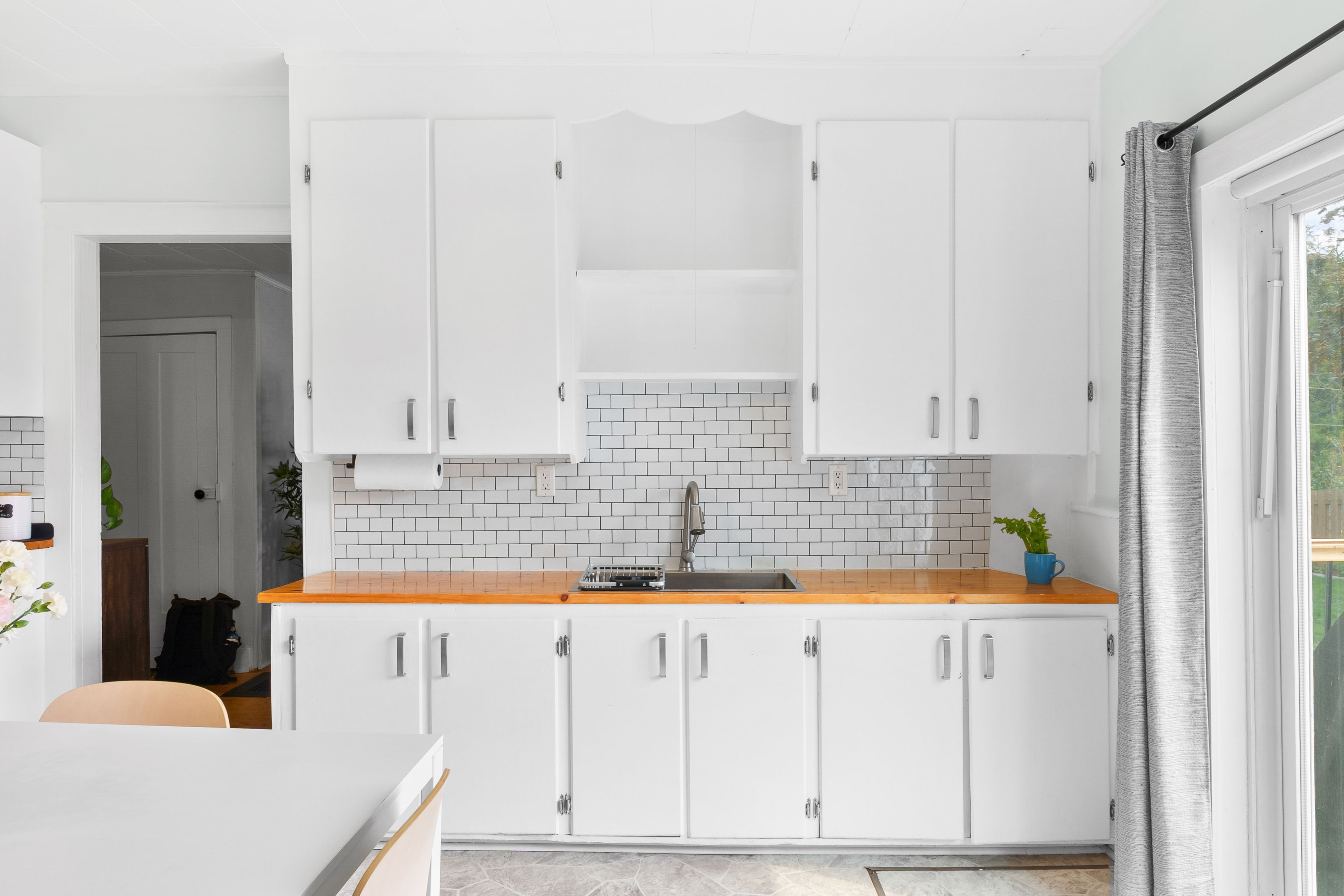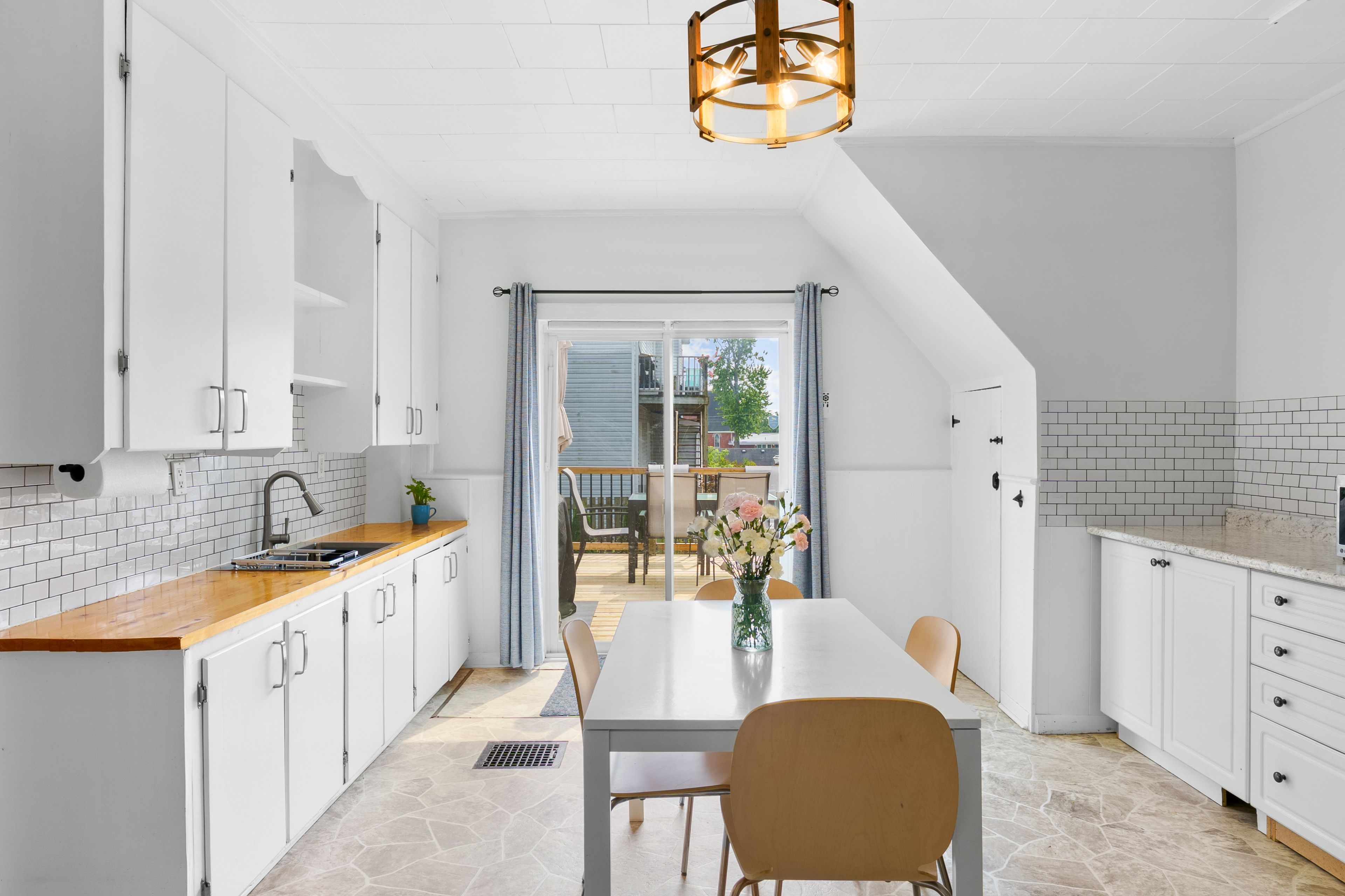 • Spacious kitchen with butcher block countertops and access to outdoor space.