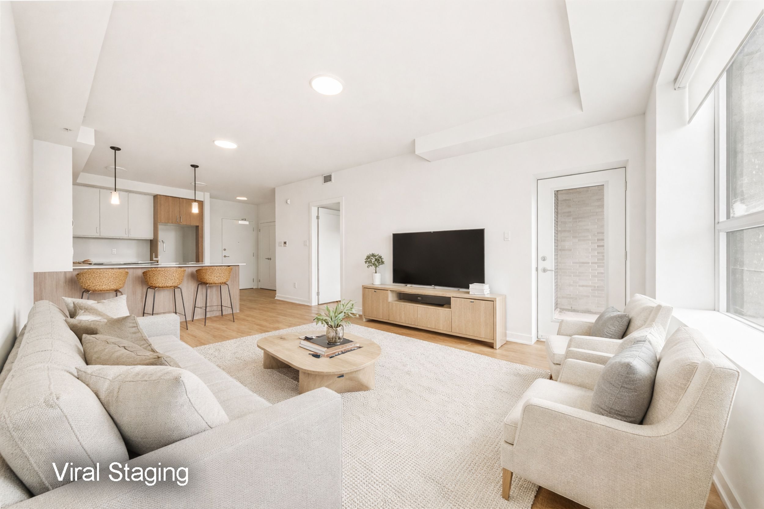 • Open-concept layout connects bright living area and modern kitchen.