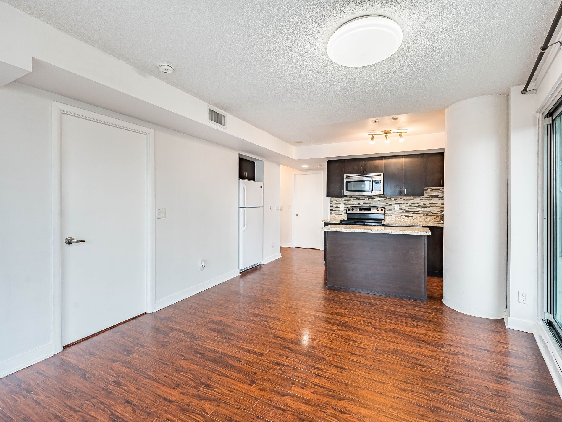 • Open concept kitchen with modern appliances and granite countertops.