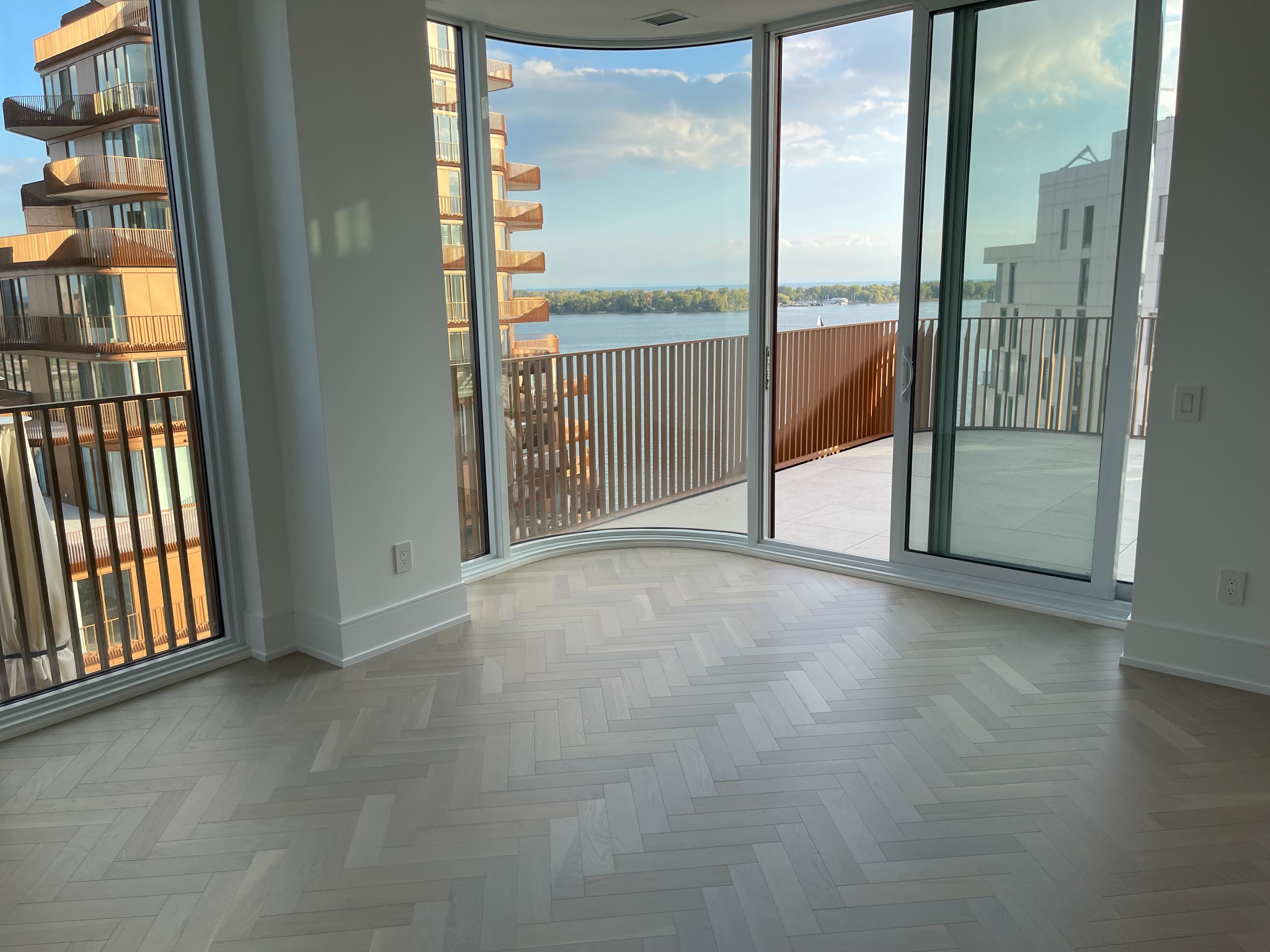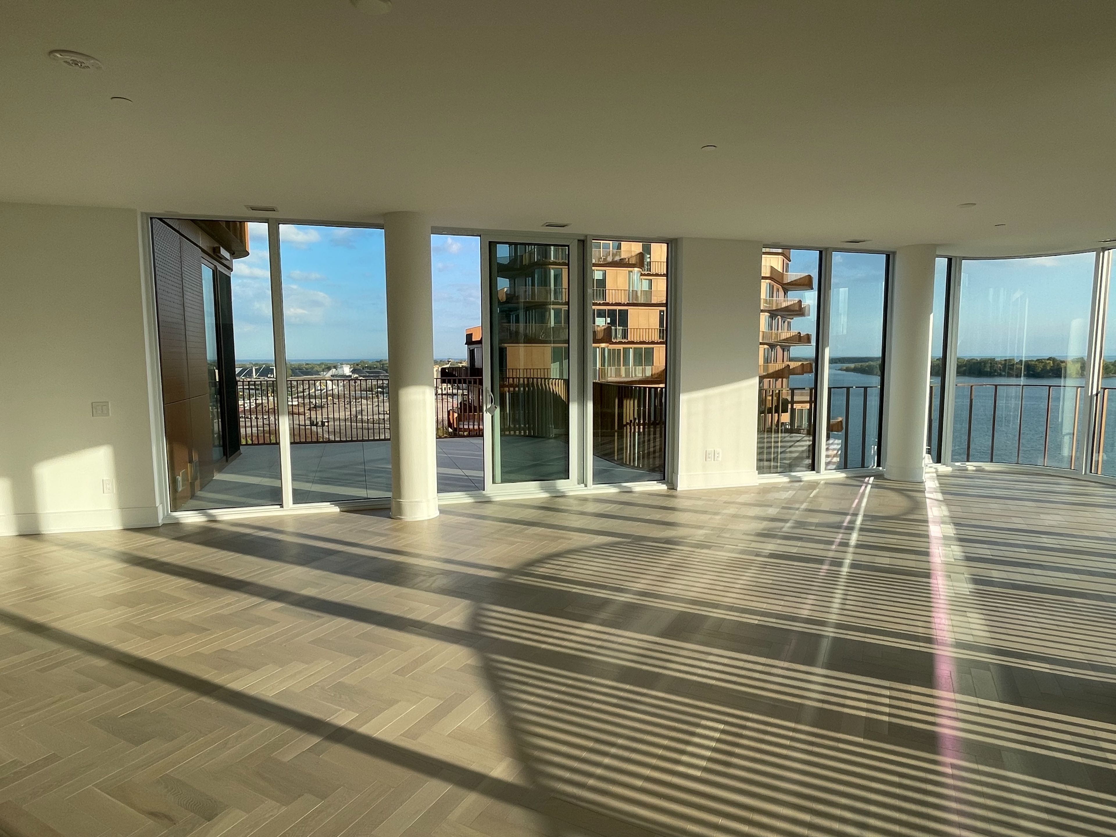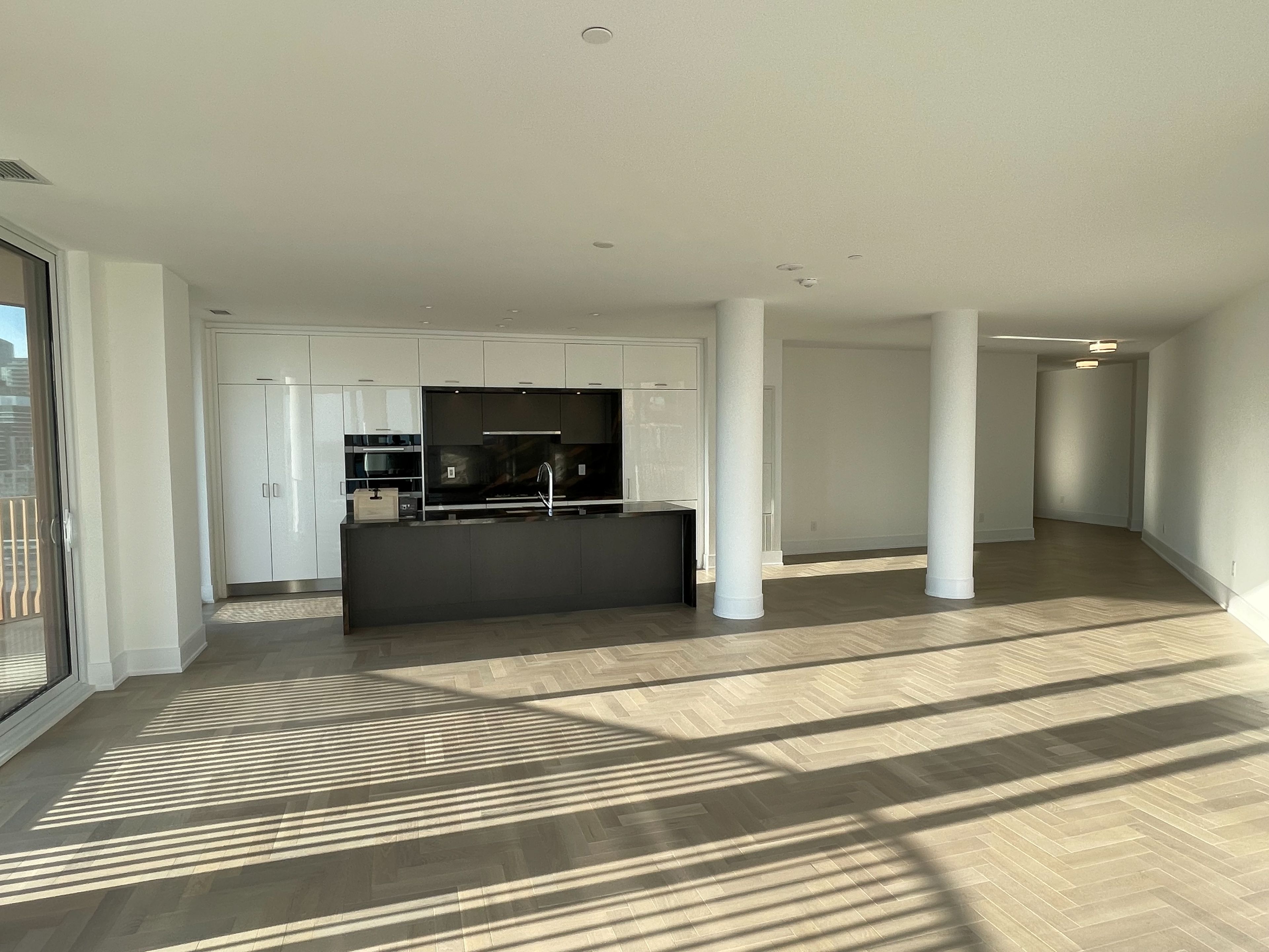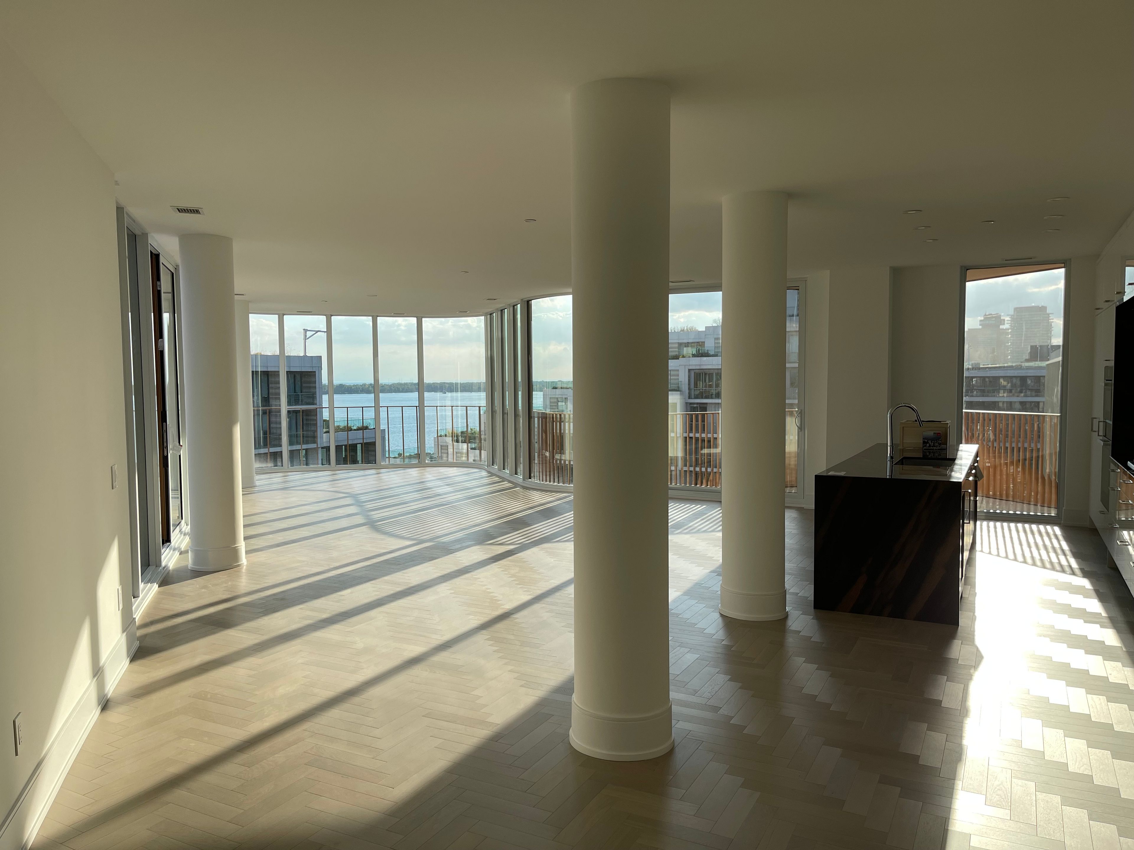 • Bright open-concept living area with floor-to-ceiling windows and large terrace.