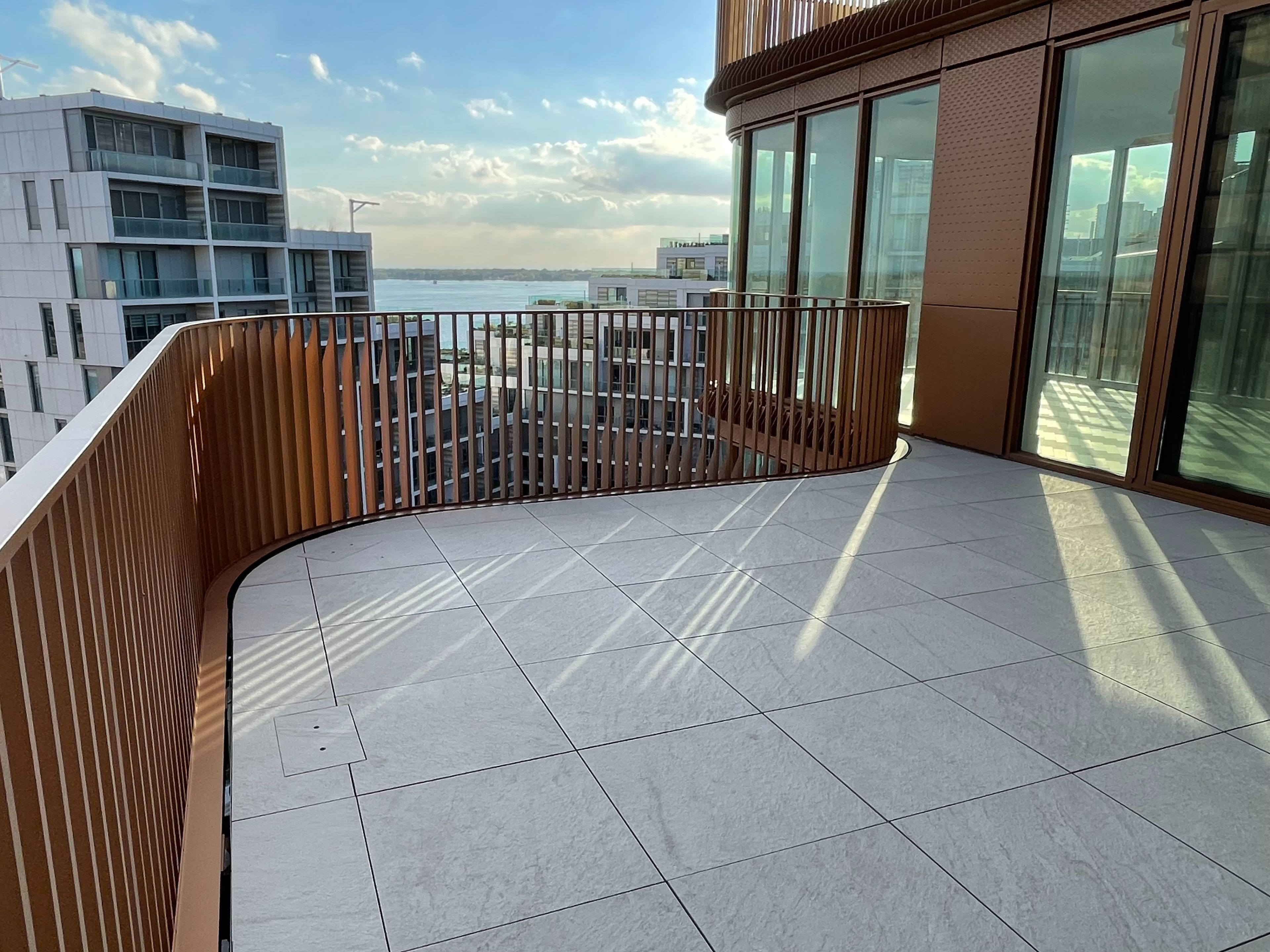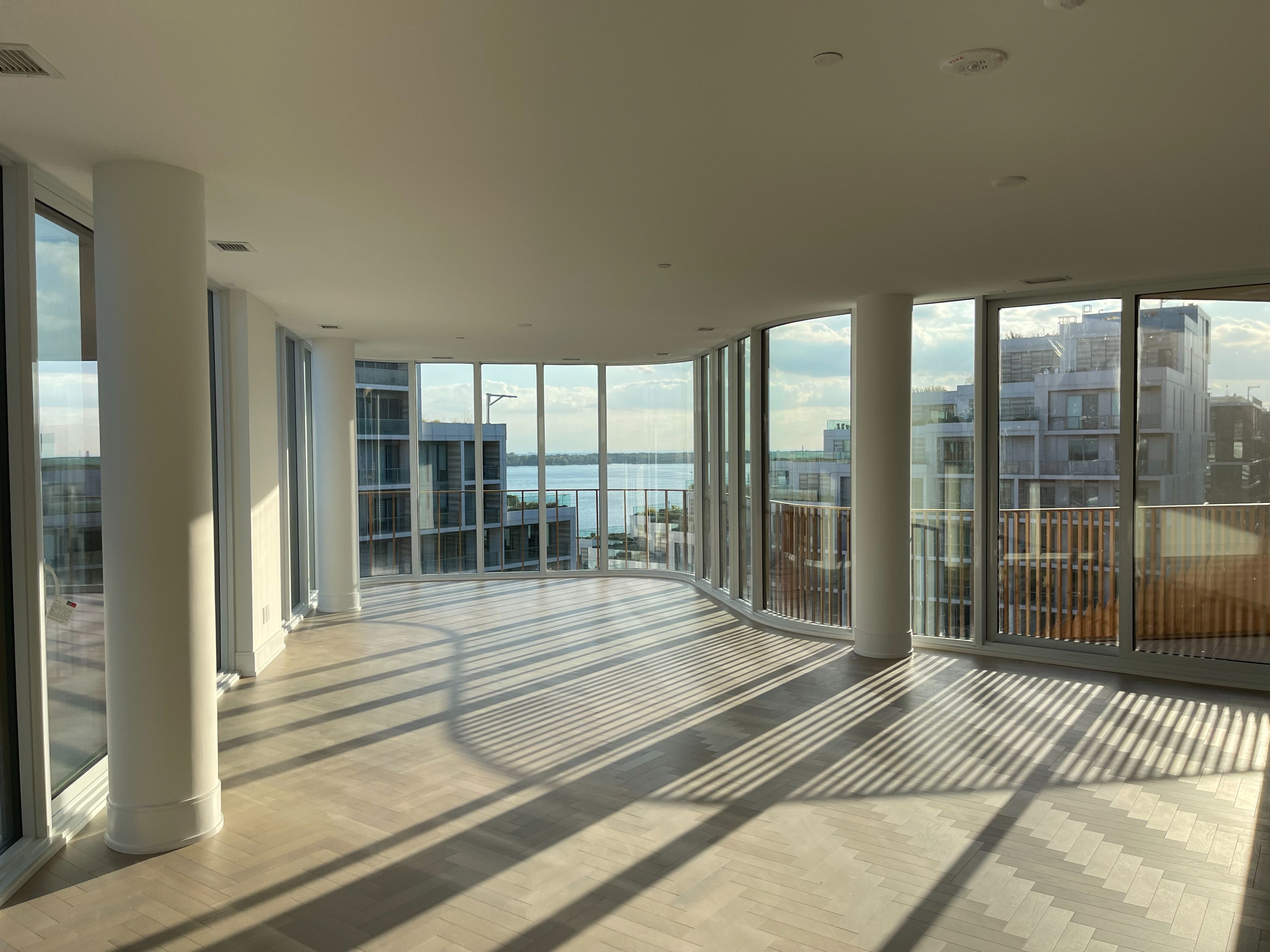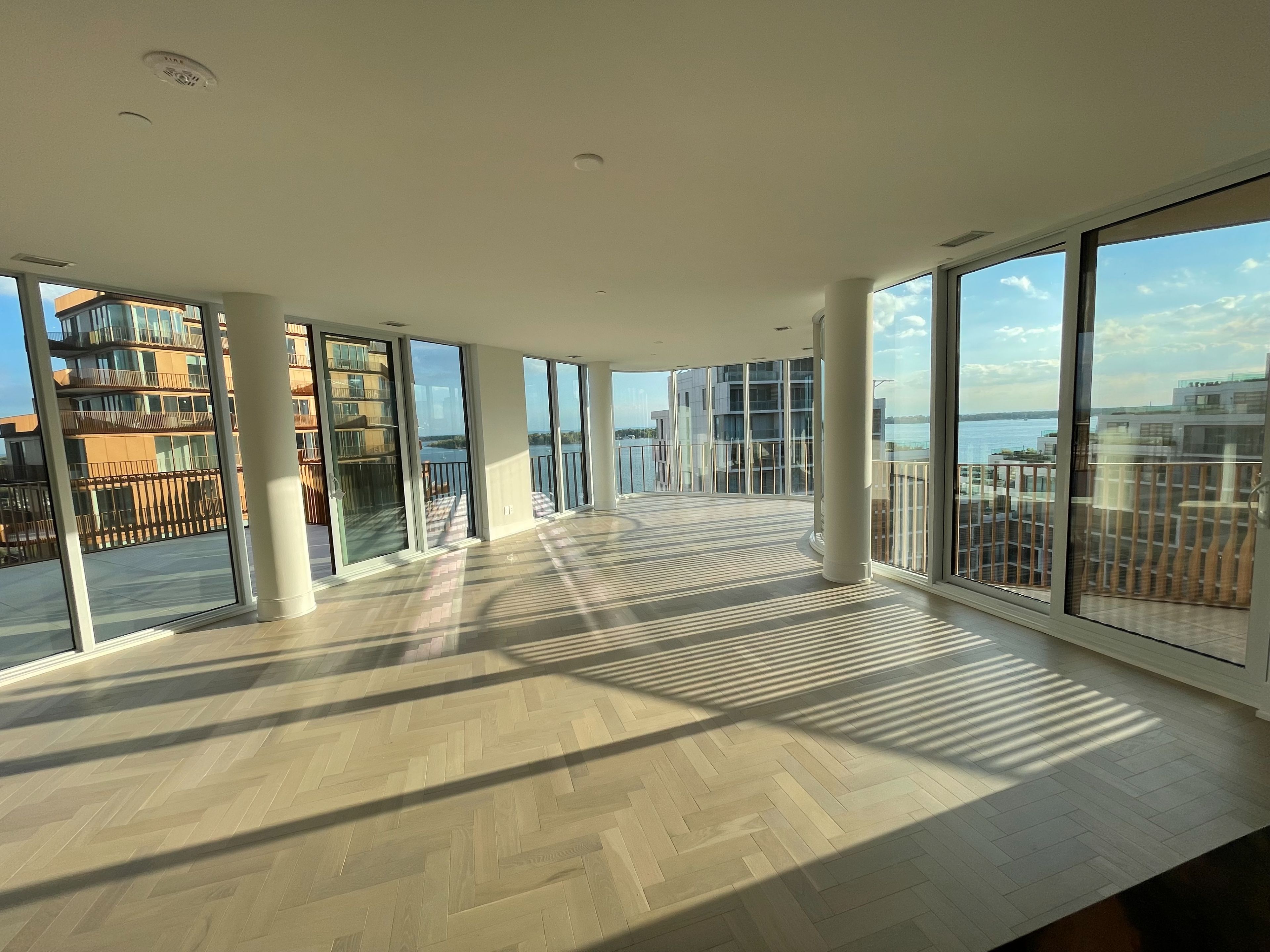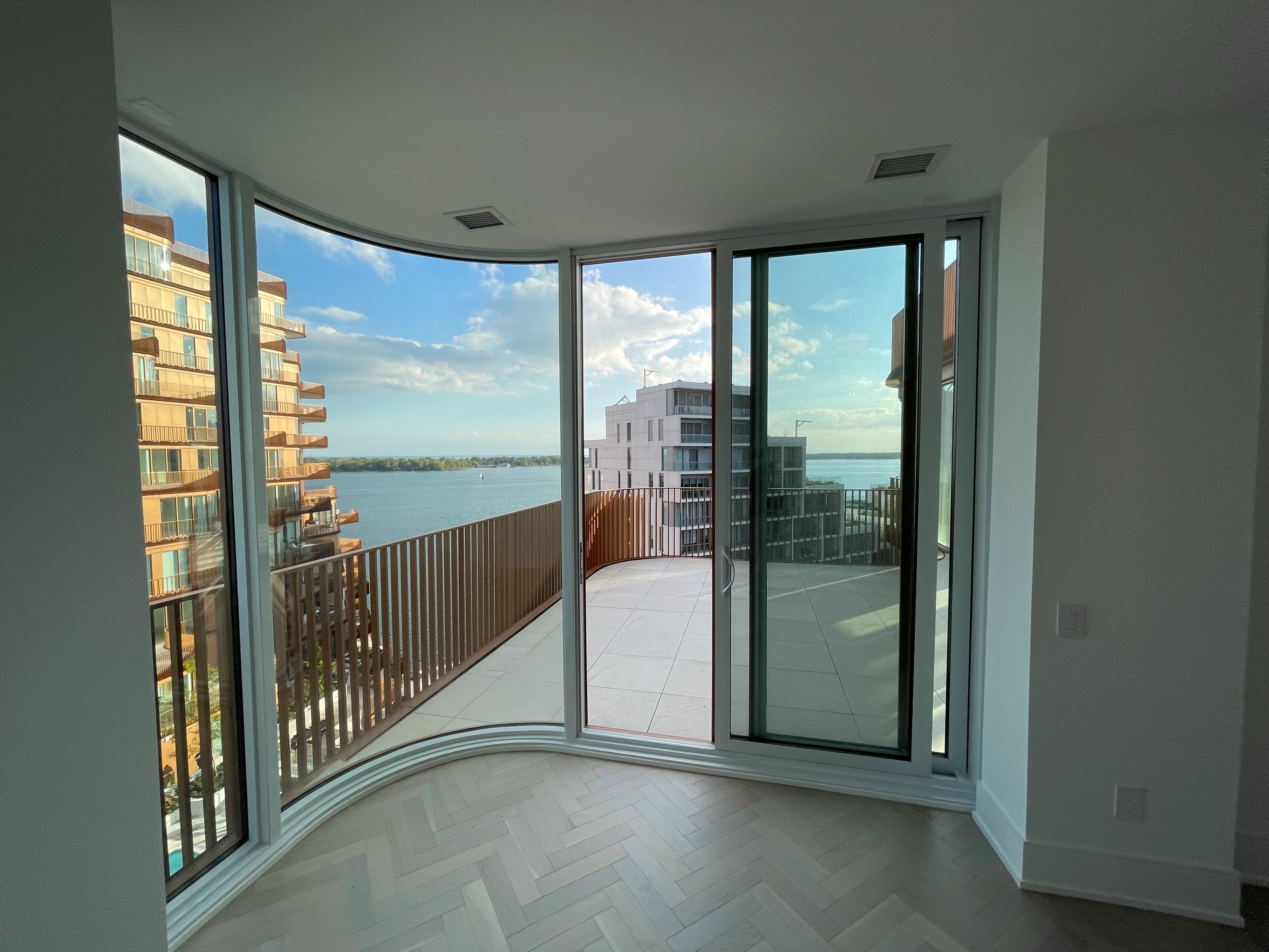 • Bright open-concept living area with floor-to-ceiling windows and large terrace.