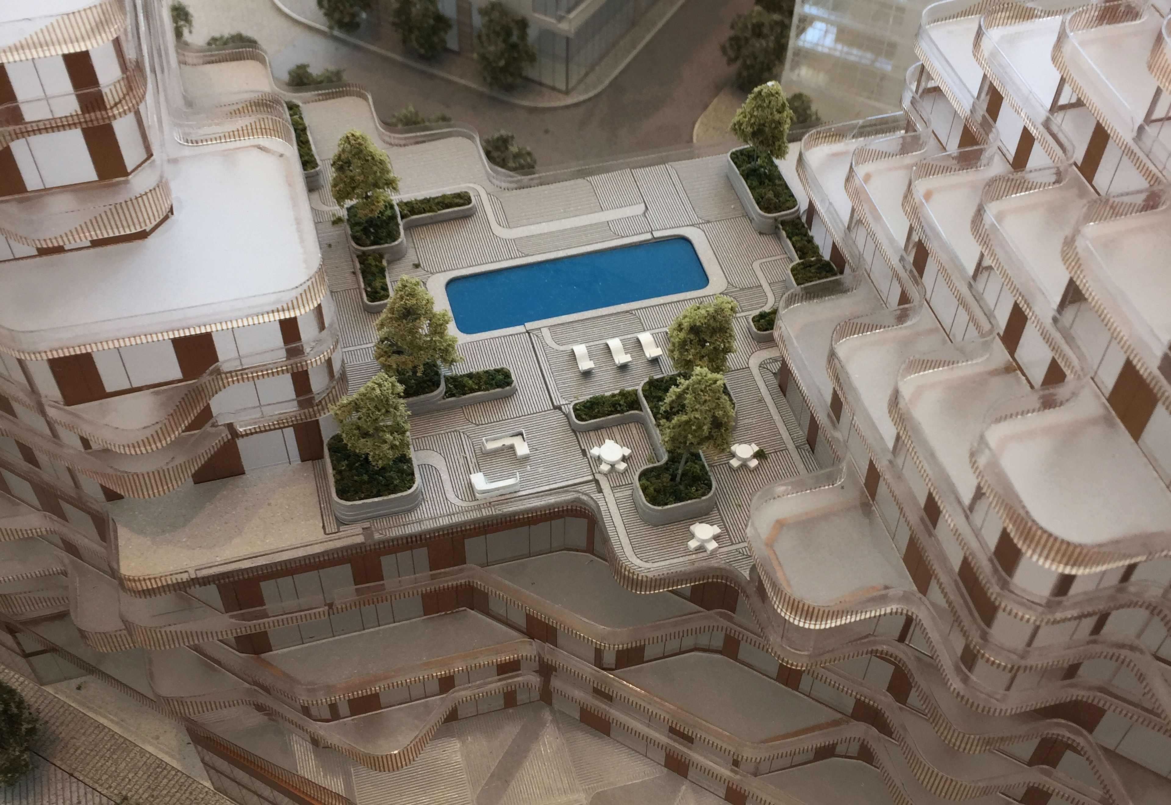 • Extensive amenities like a fitness center, lounges, and rooftop pool.