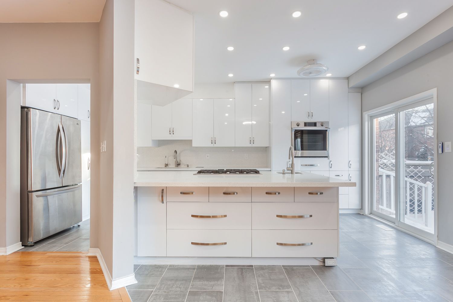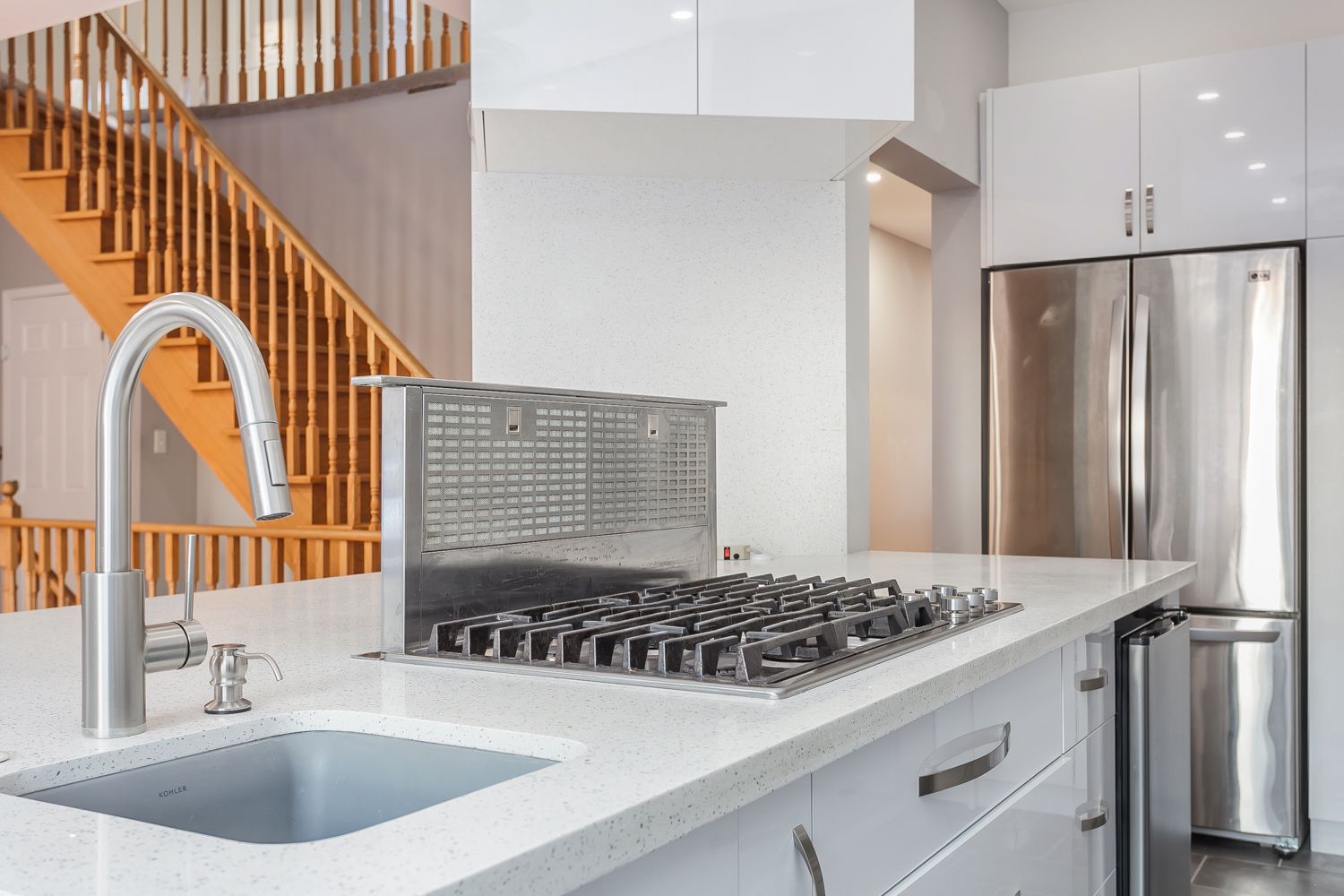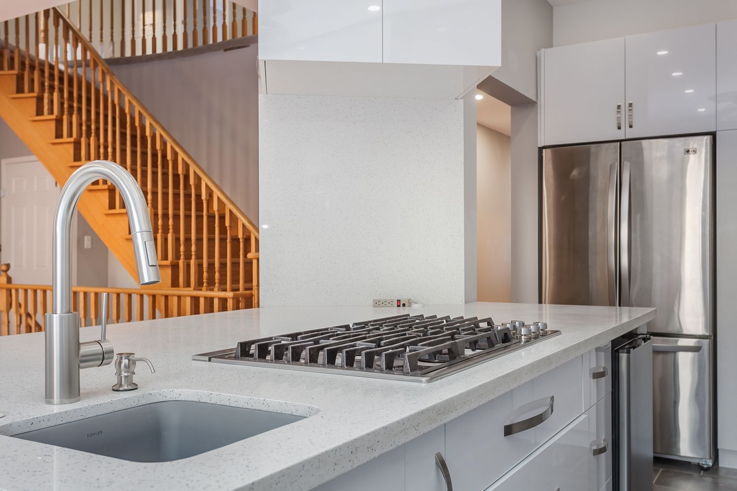 • Upgraded kitchen with custom cabinetry and gas cooktop for modern living.