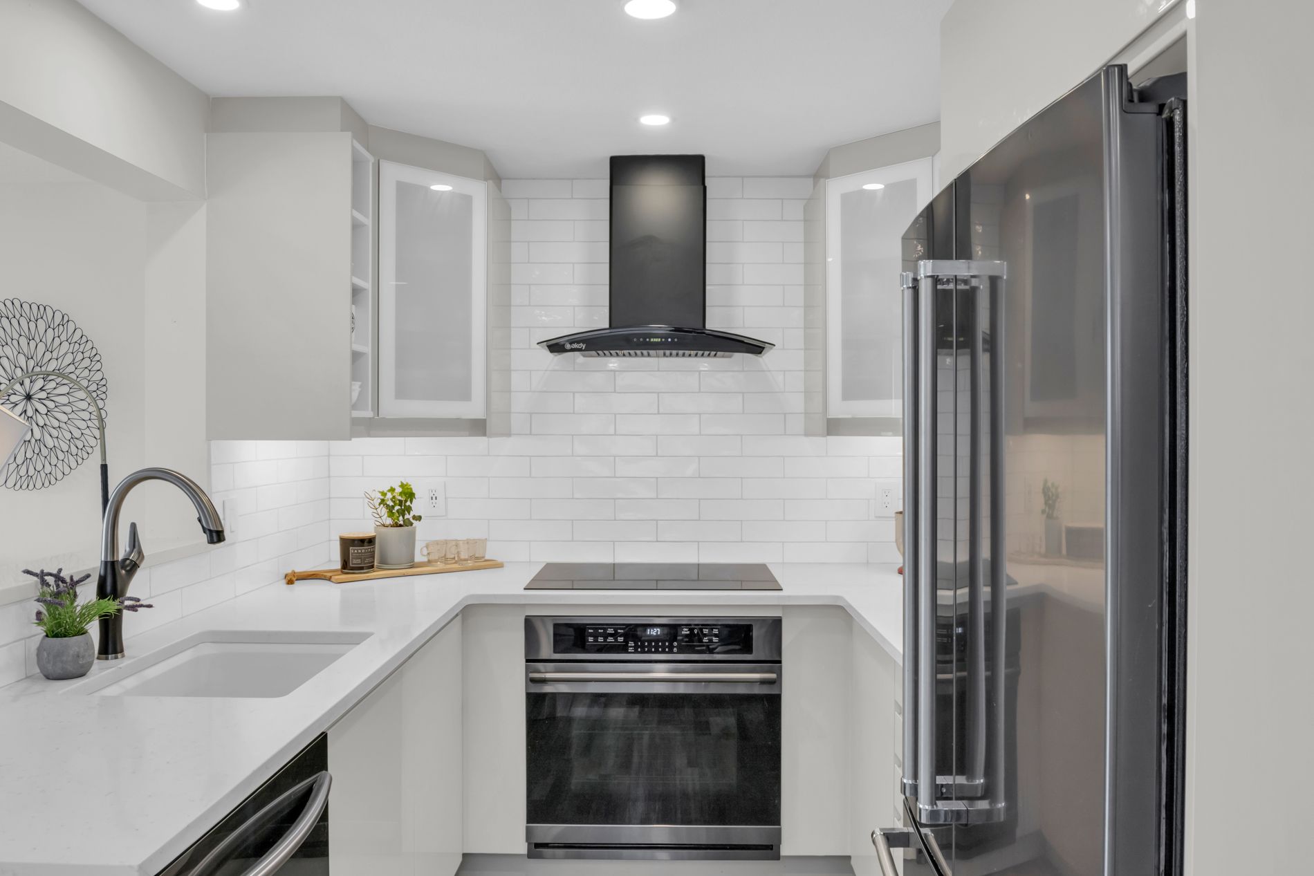 • Modern European-style kitchen with premium appliances and quartz countertops.