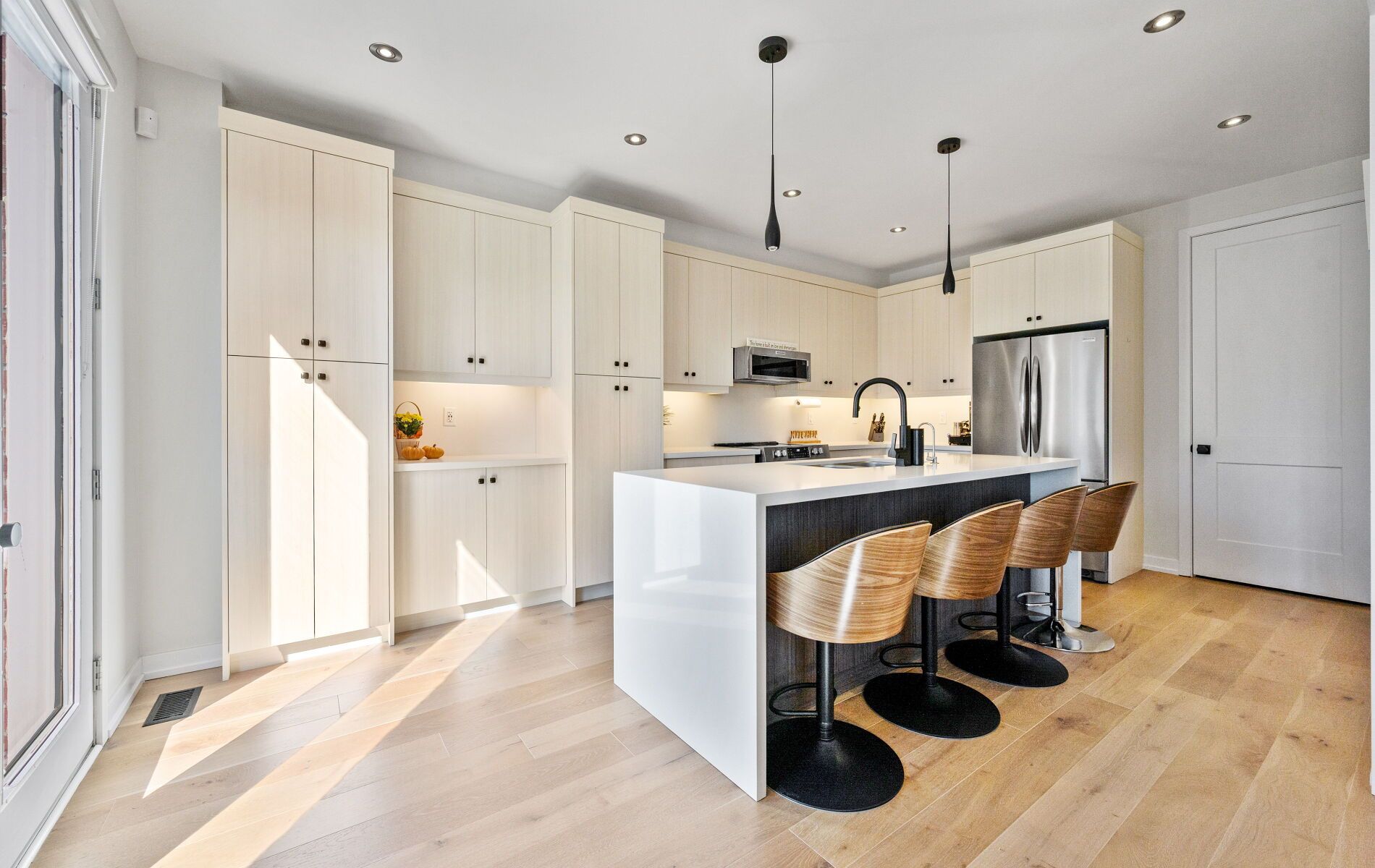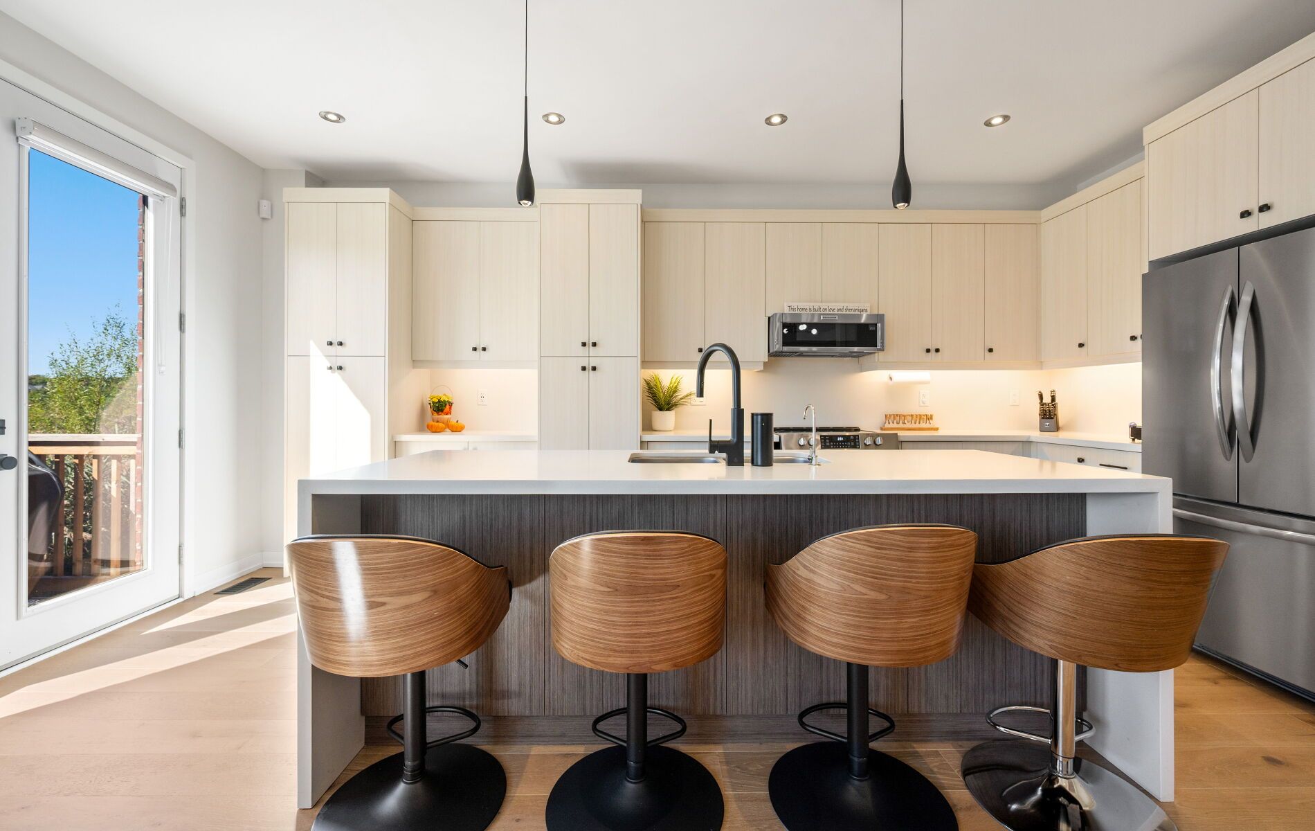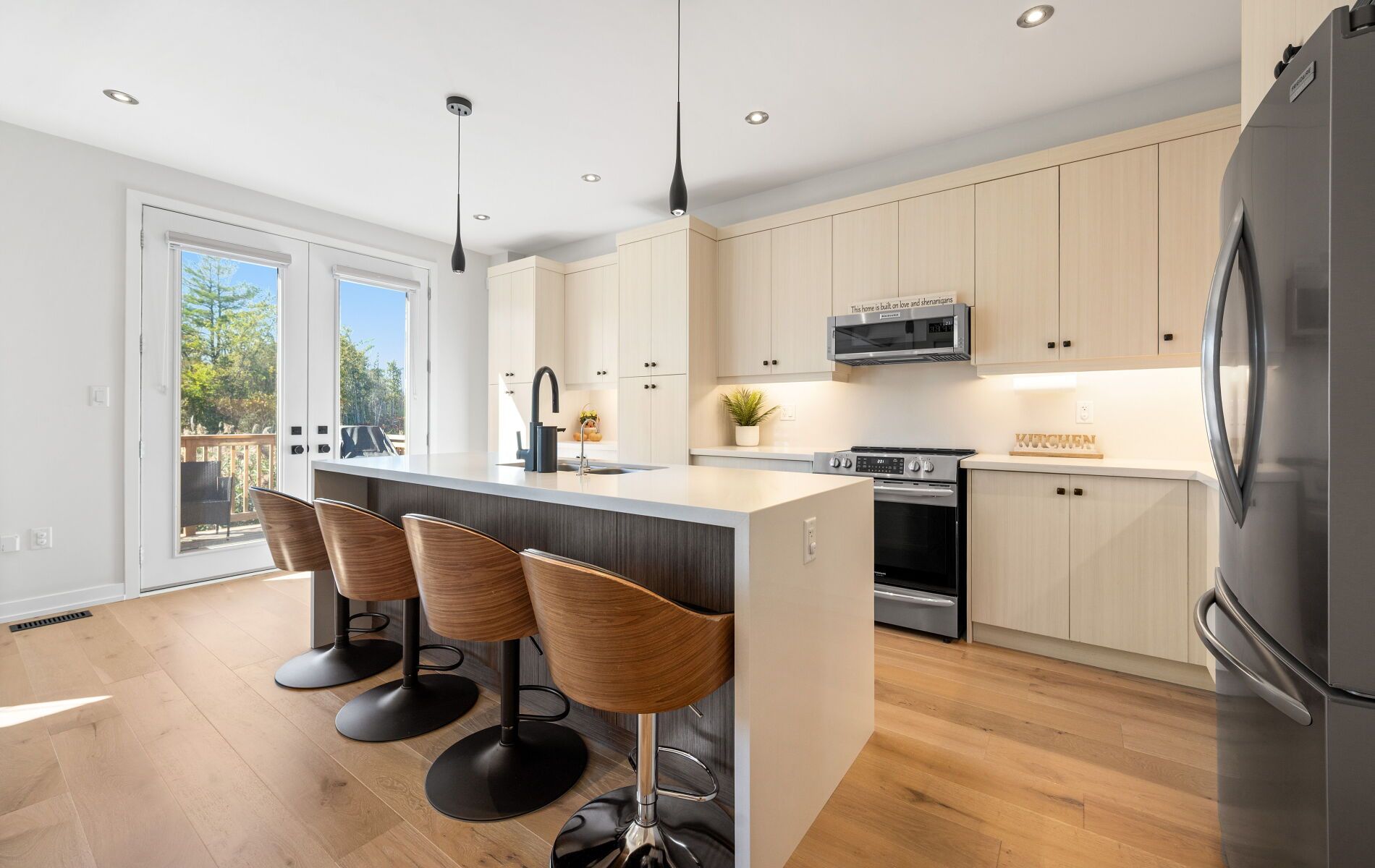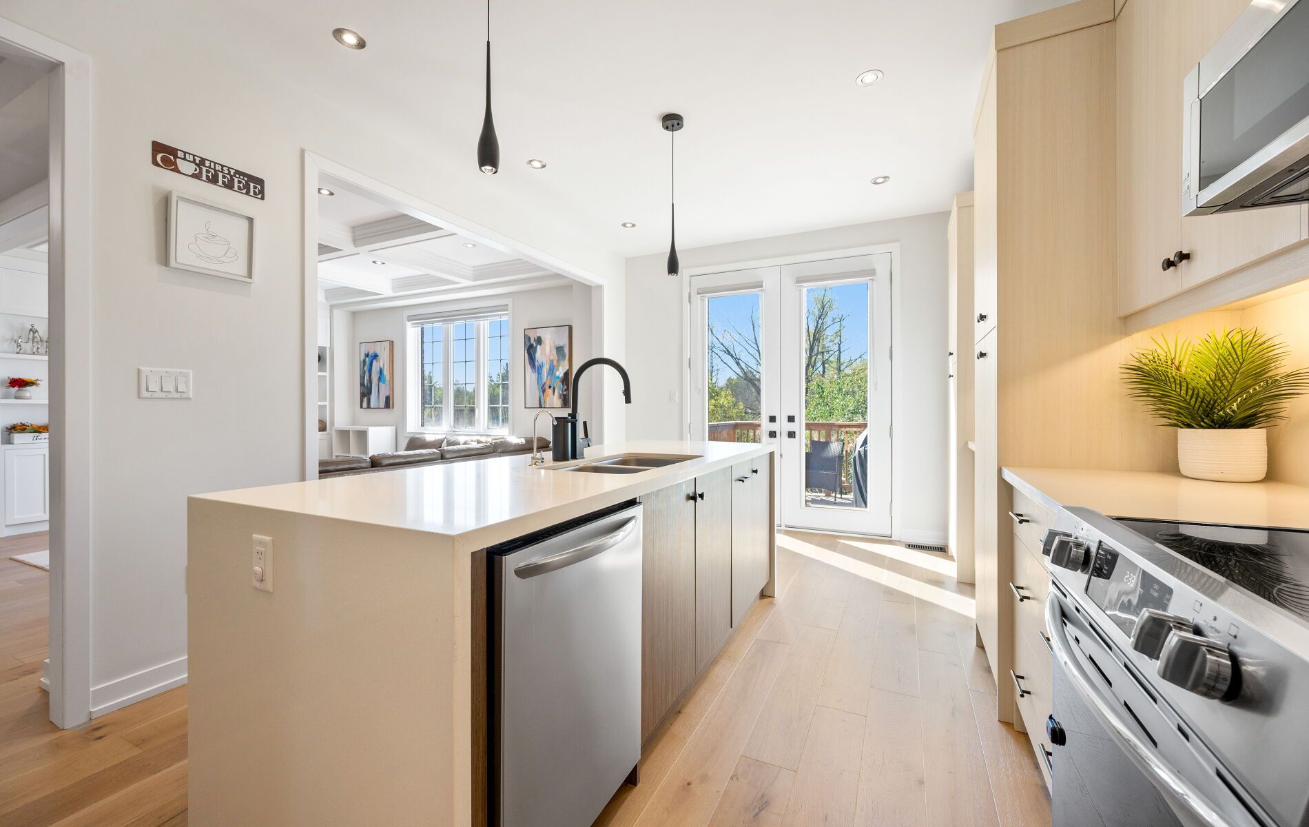 • Chef's kitchen with large island, stainless steel appliances, and deck access.