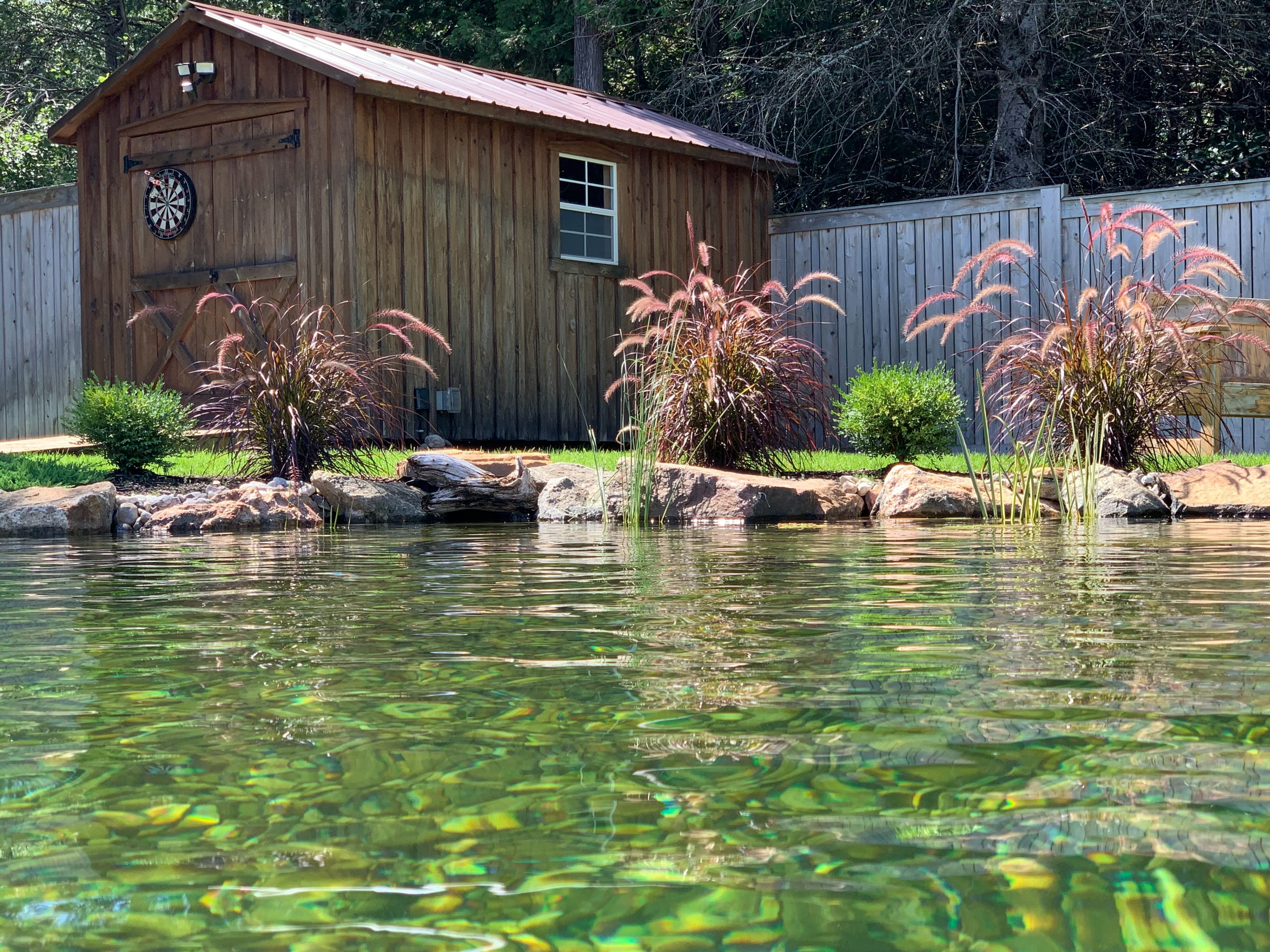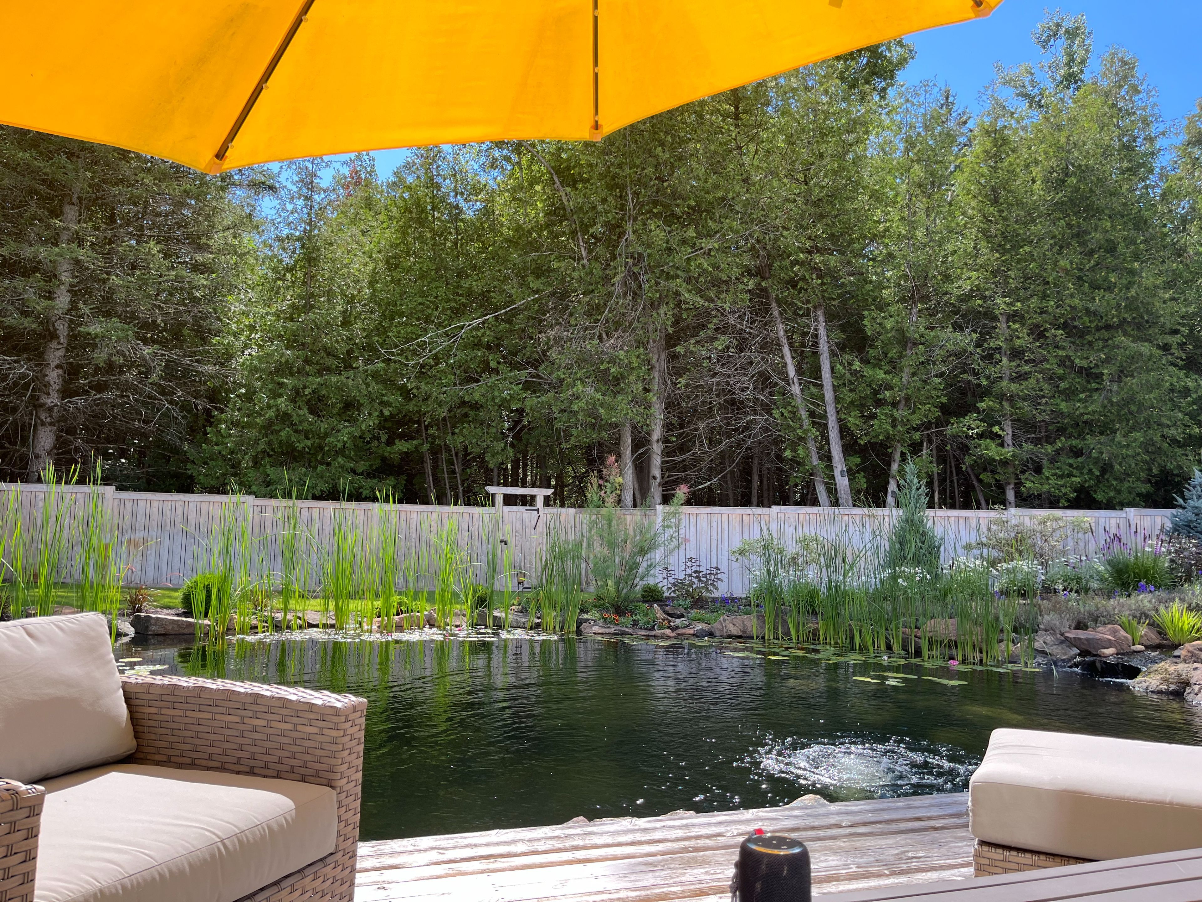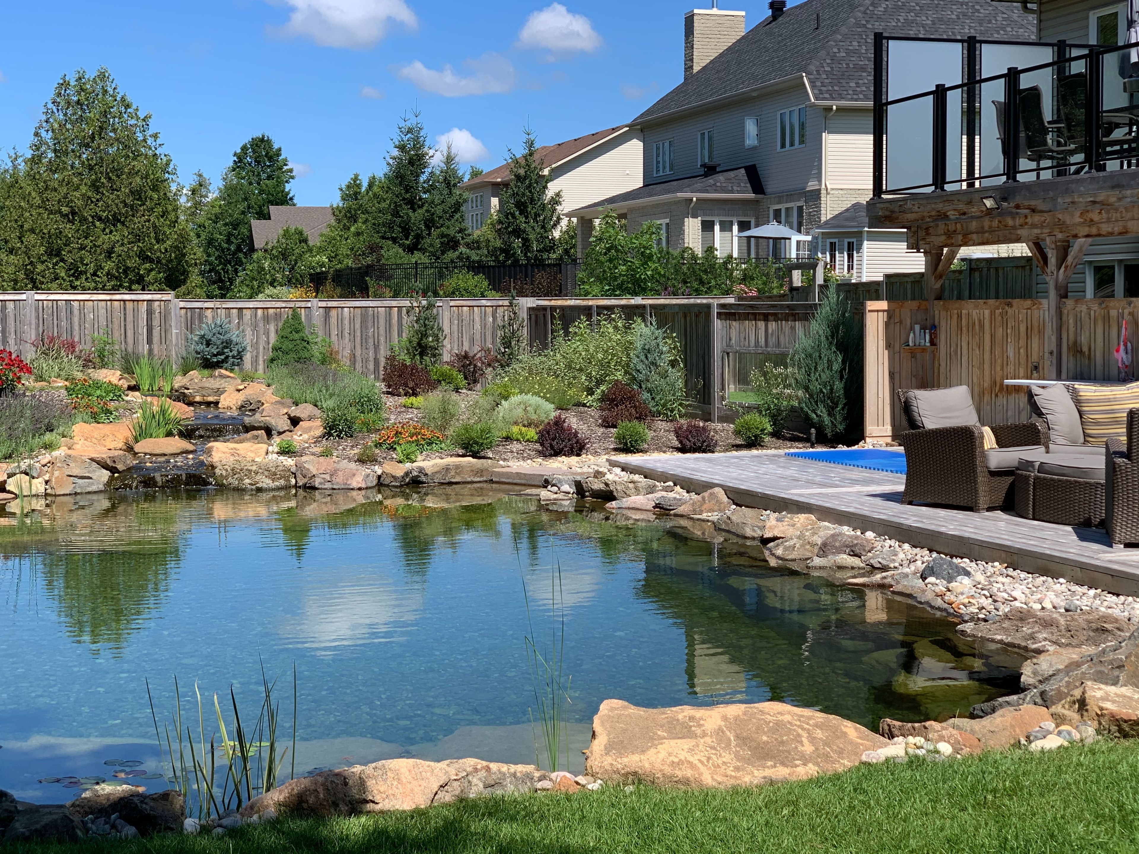 • Spacious deck overlooking a natural swimming pool and backyard.