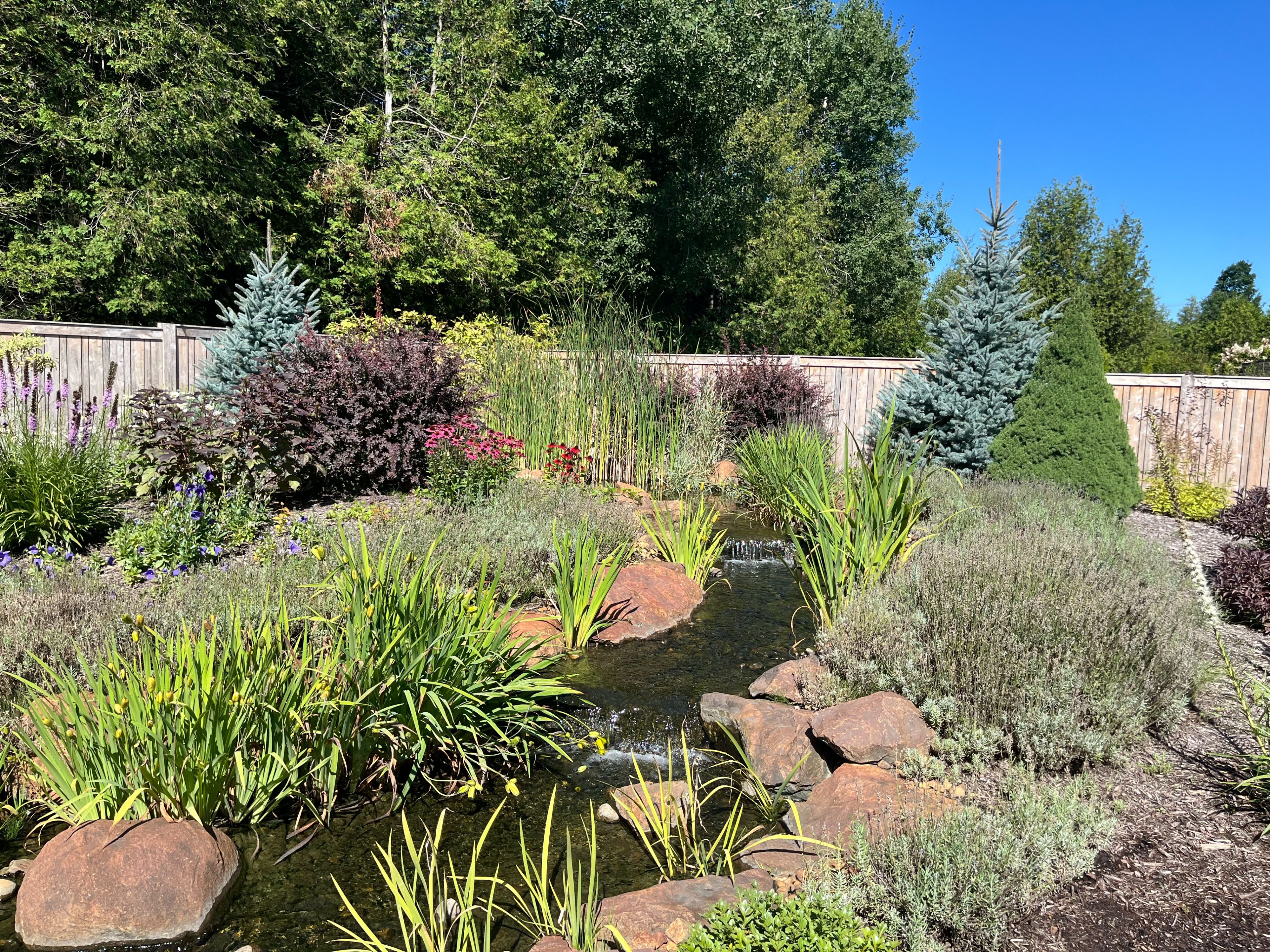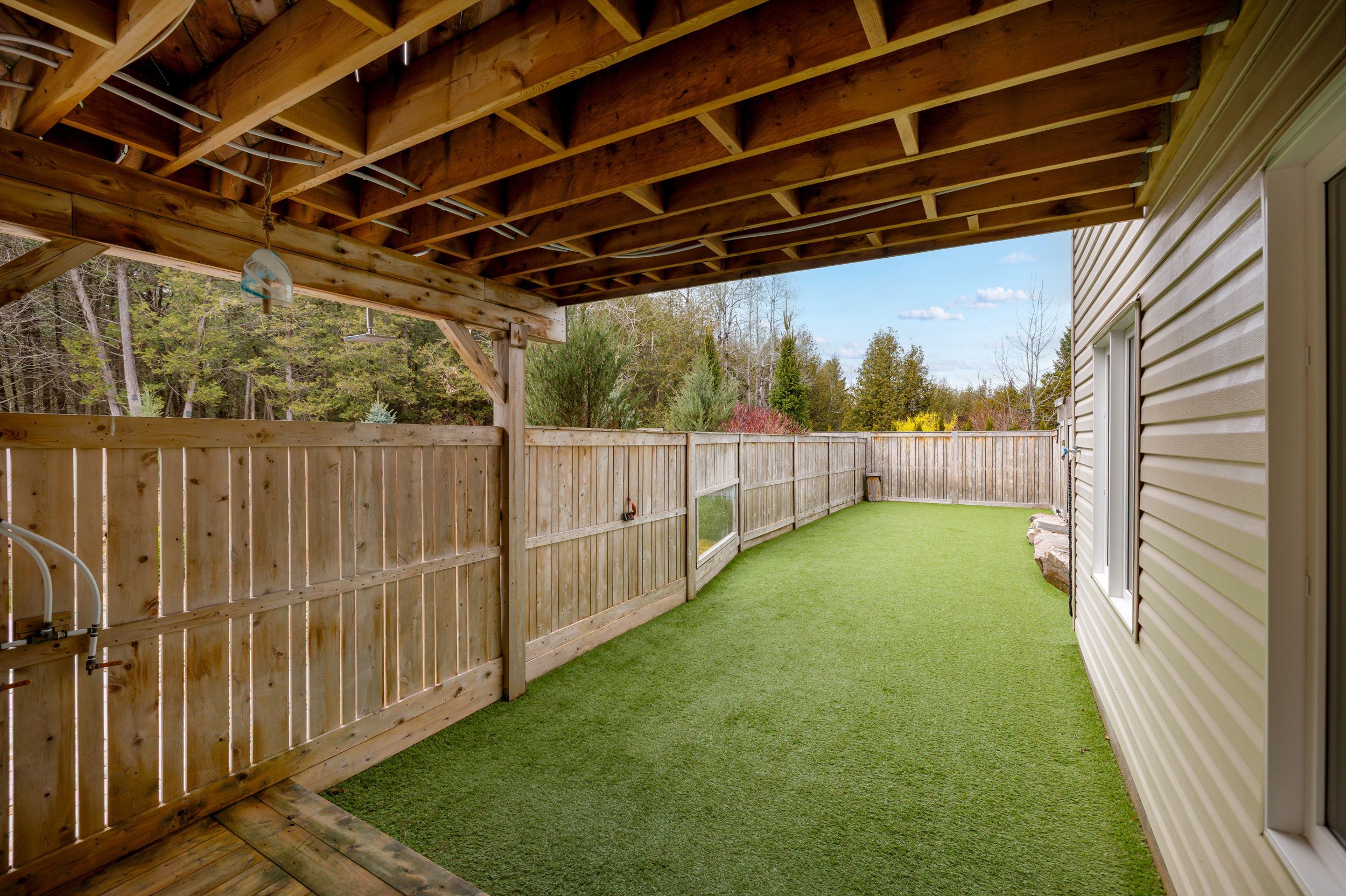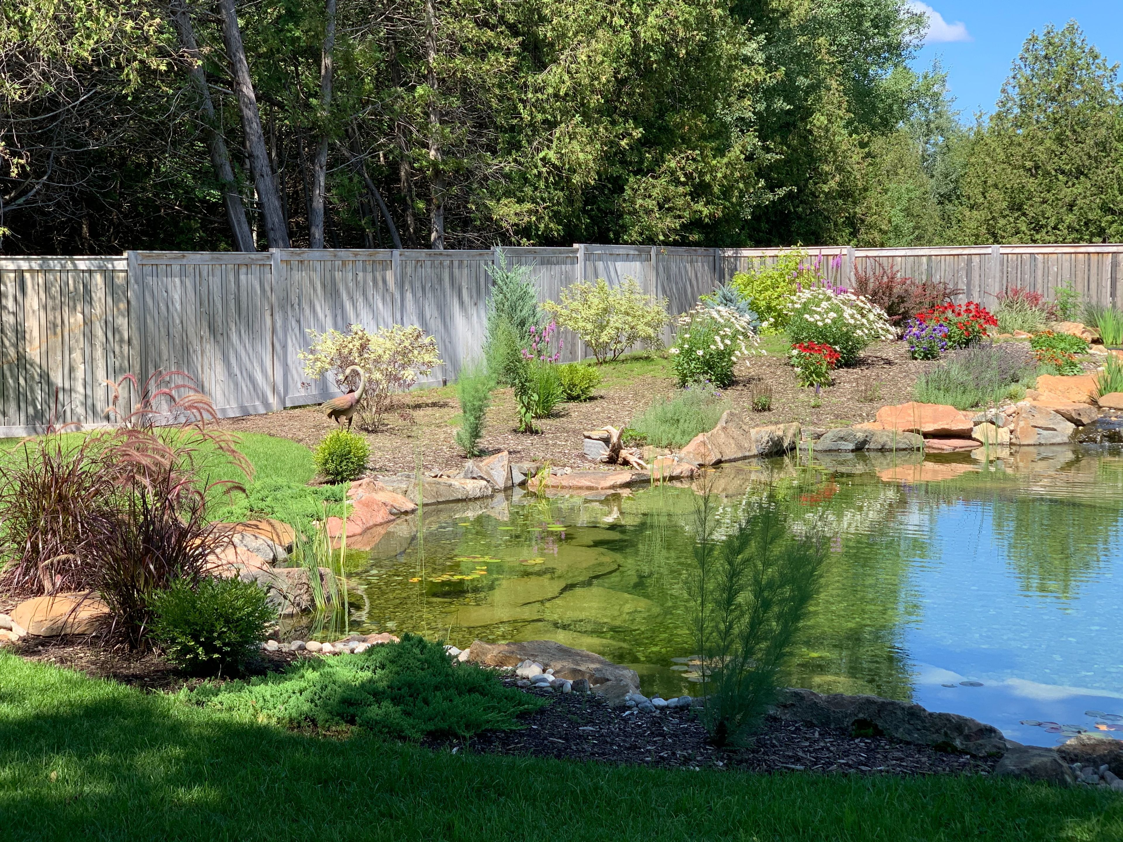 • Spacious deck overlooking a natural swimming pool and backyard.