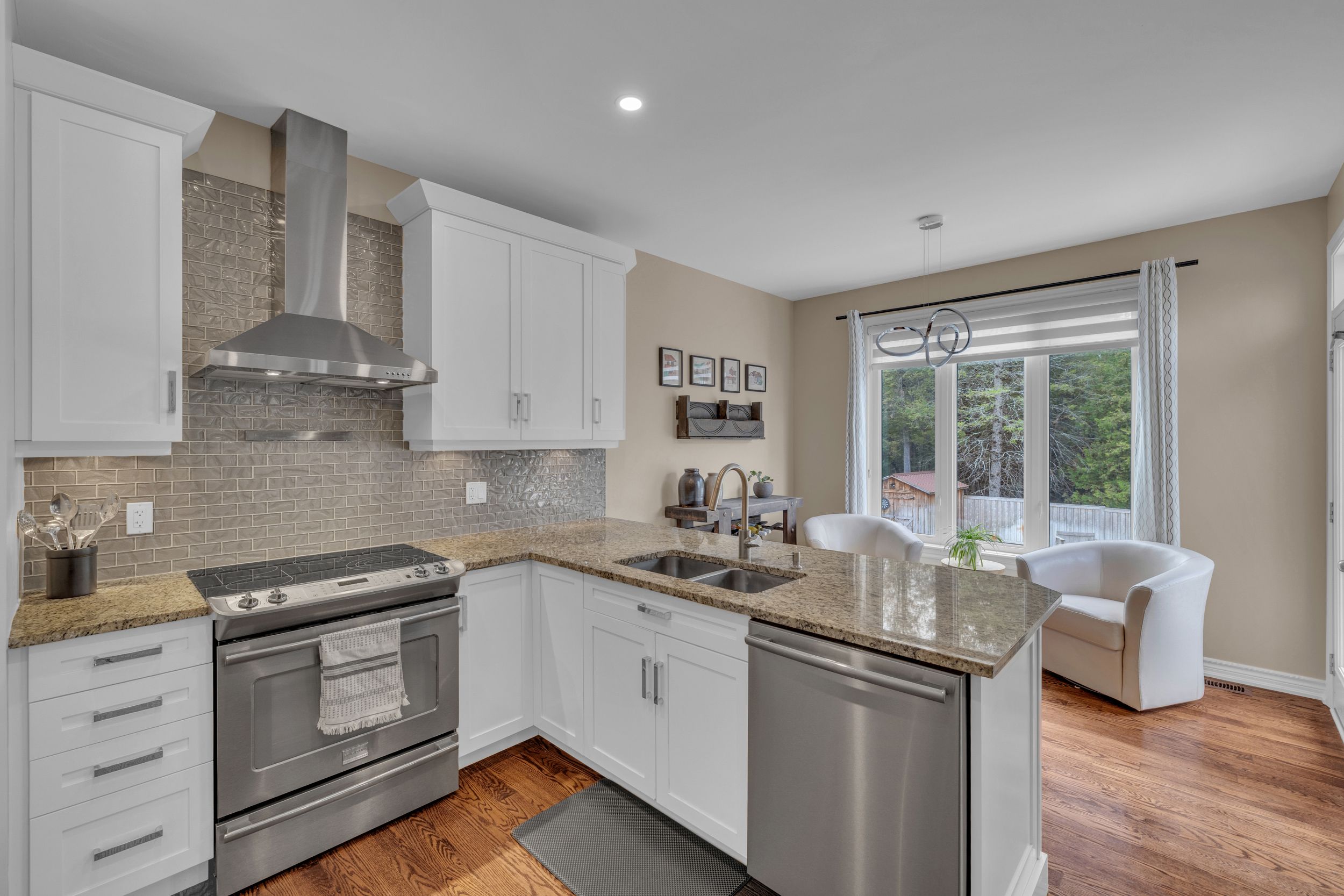 • Well-equipped kitchen with granite countertops and stainless steel appliances.