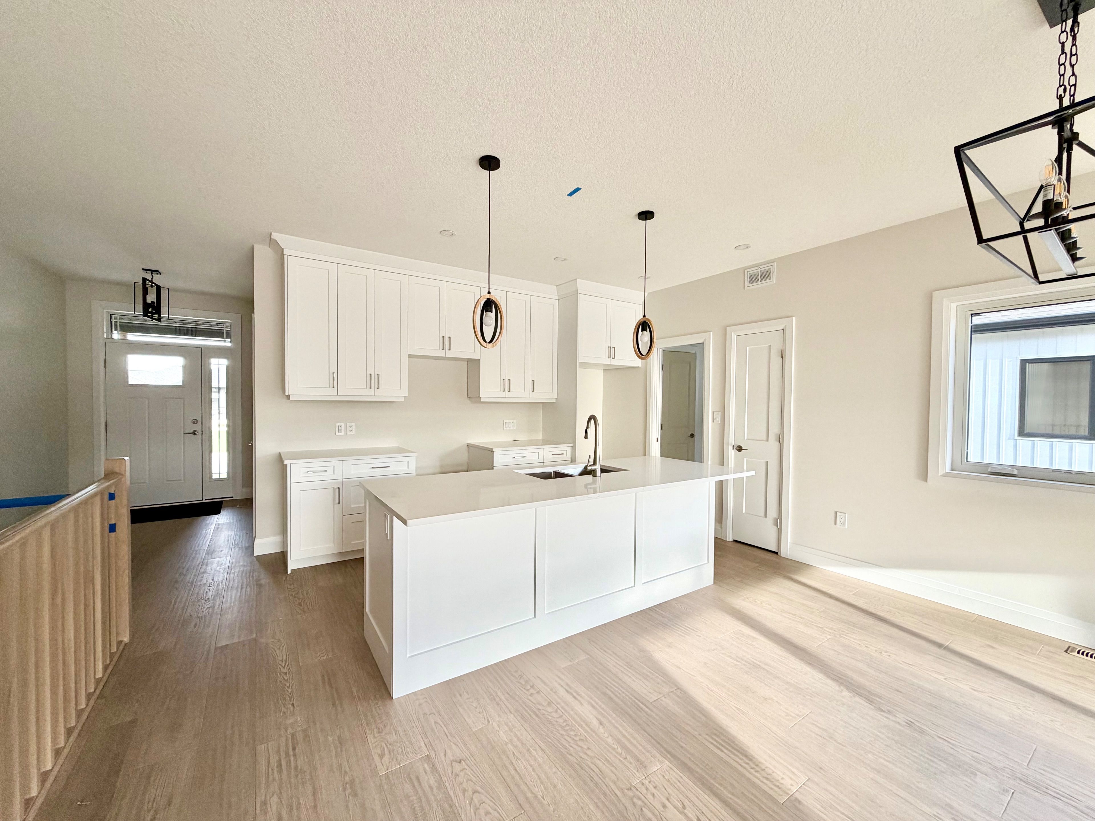 • Modern kitchen with durable quartz countertops and hardwood staircase.