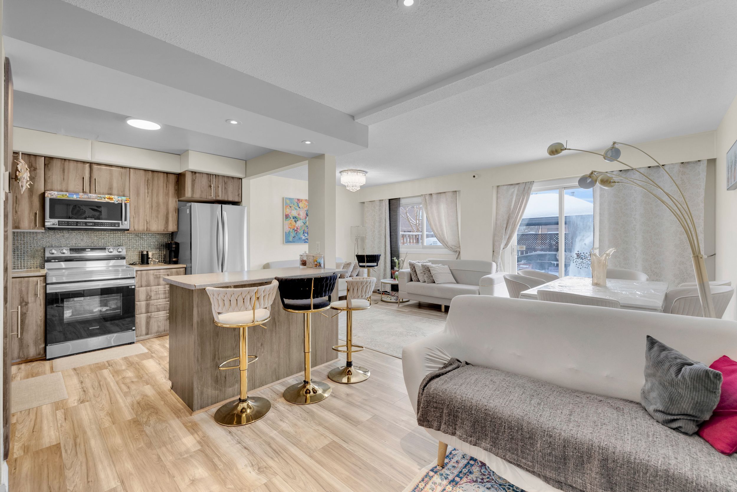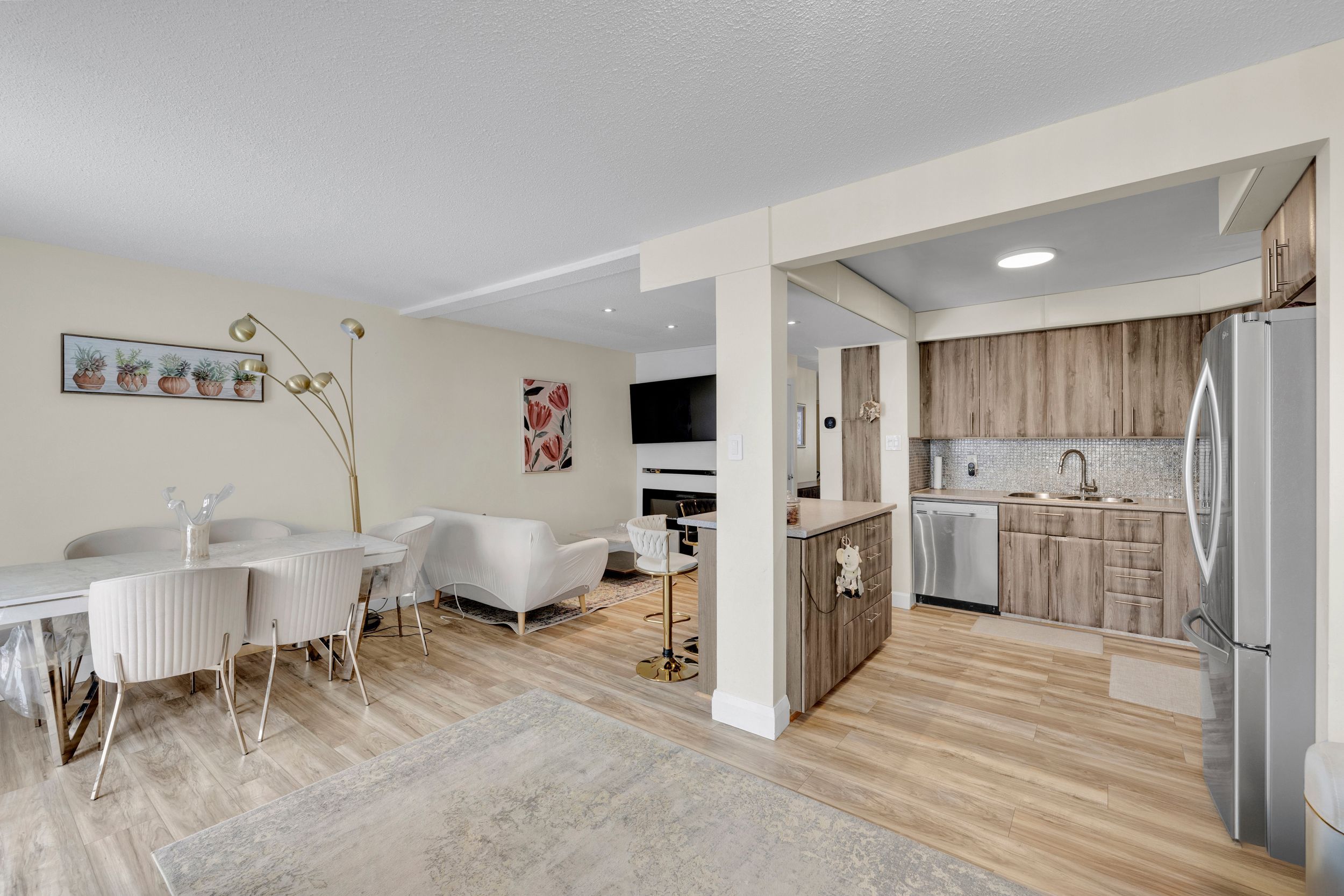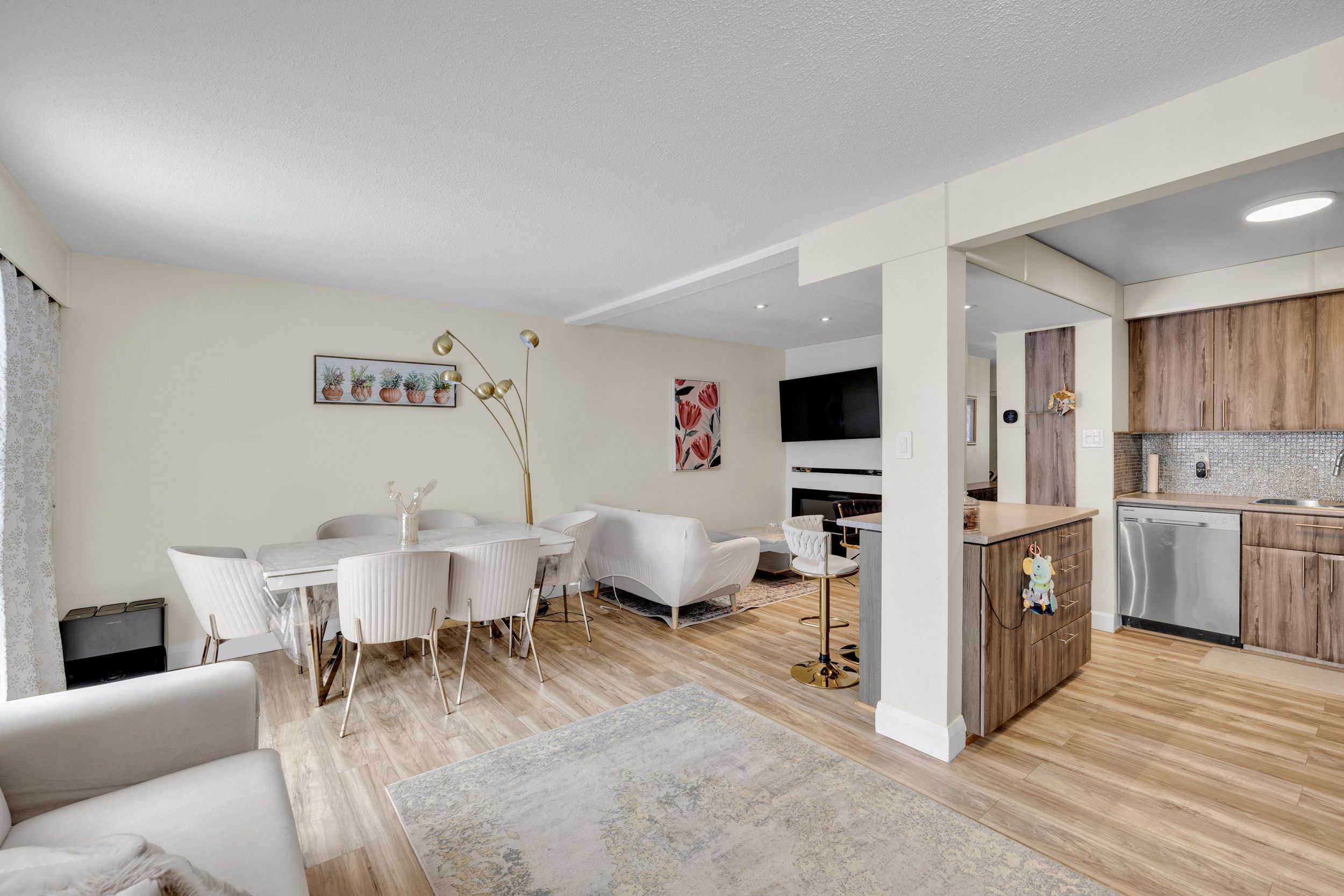 • Open concept kitchen, dining, and living area with custom cabinets.