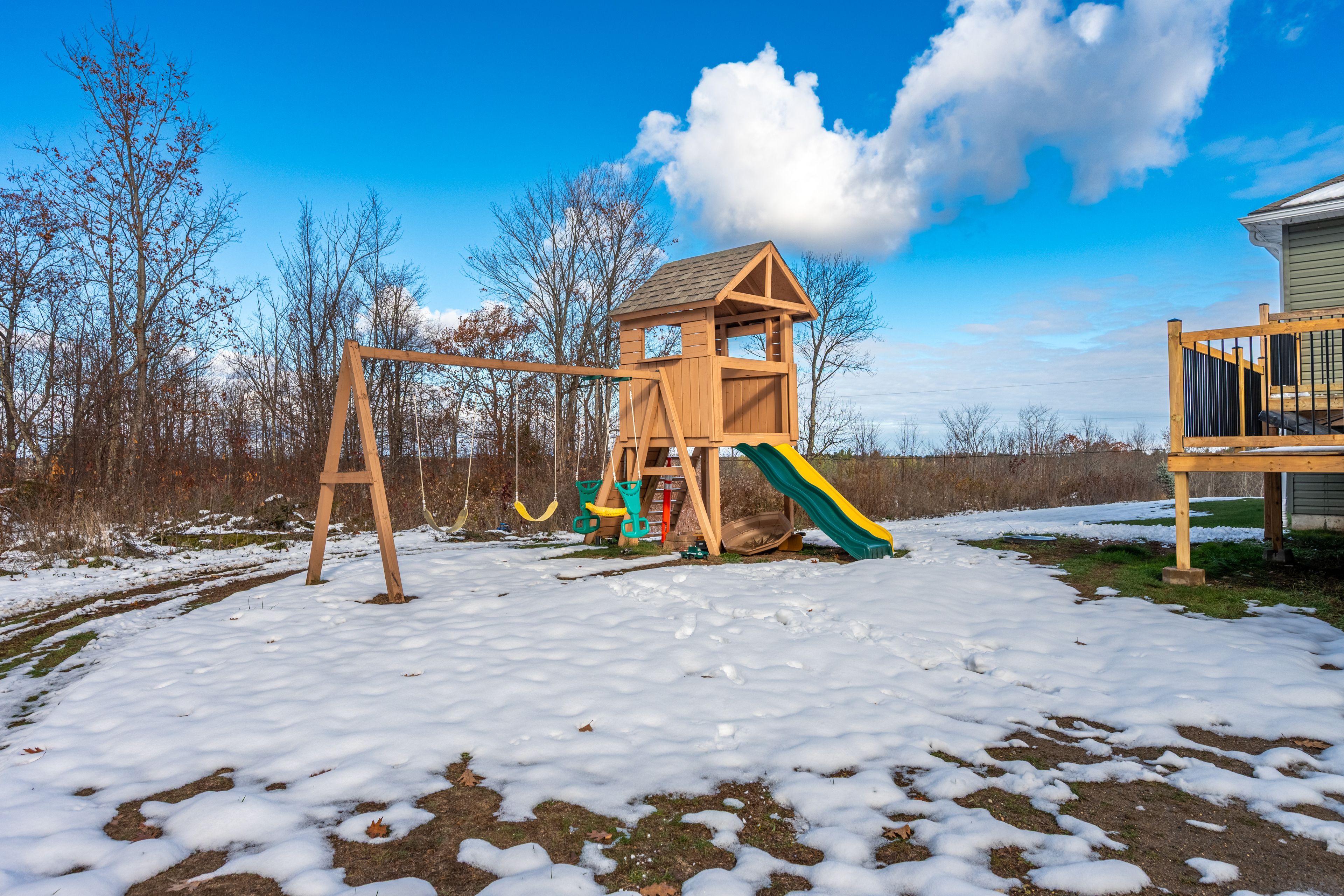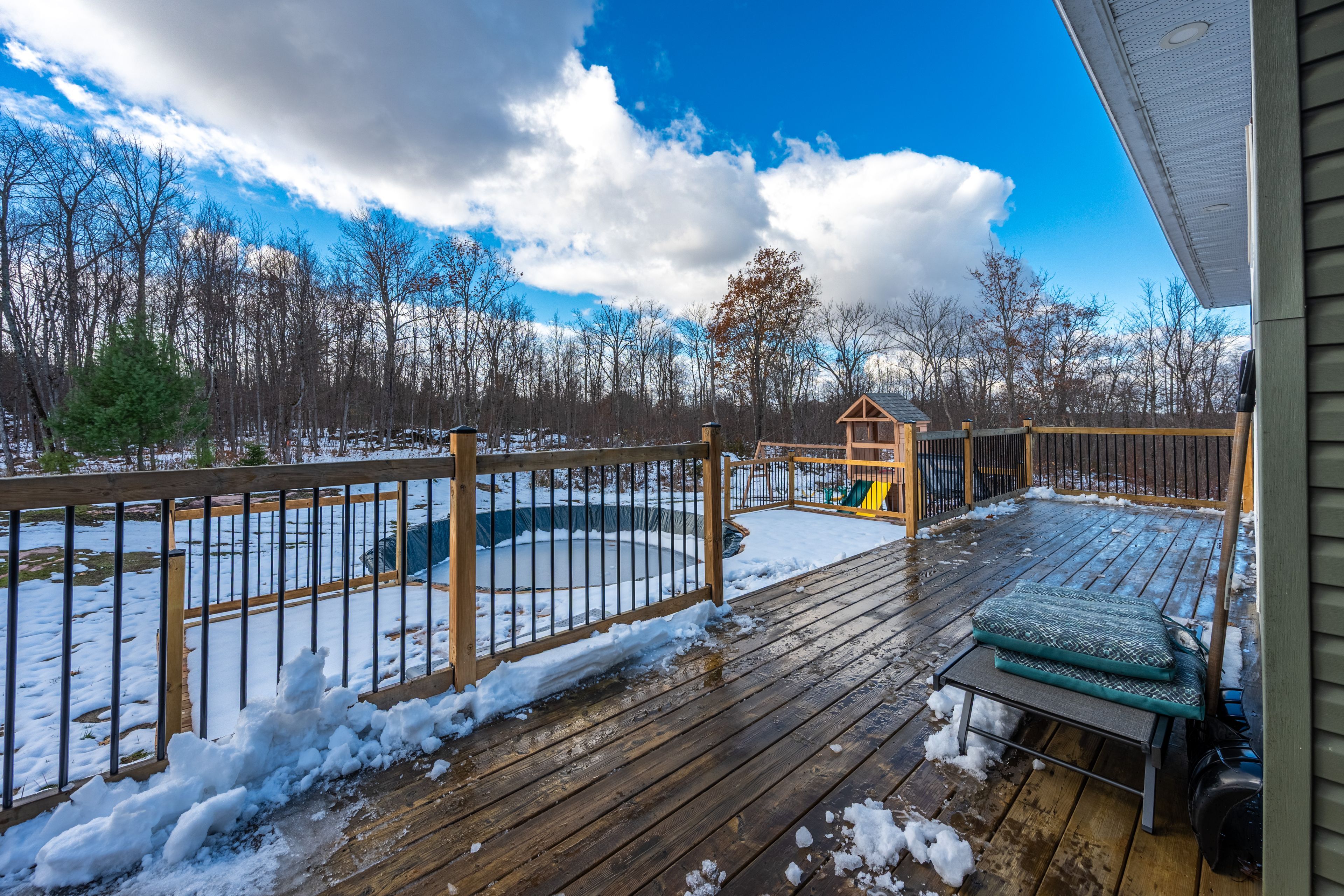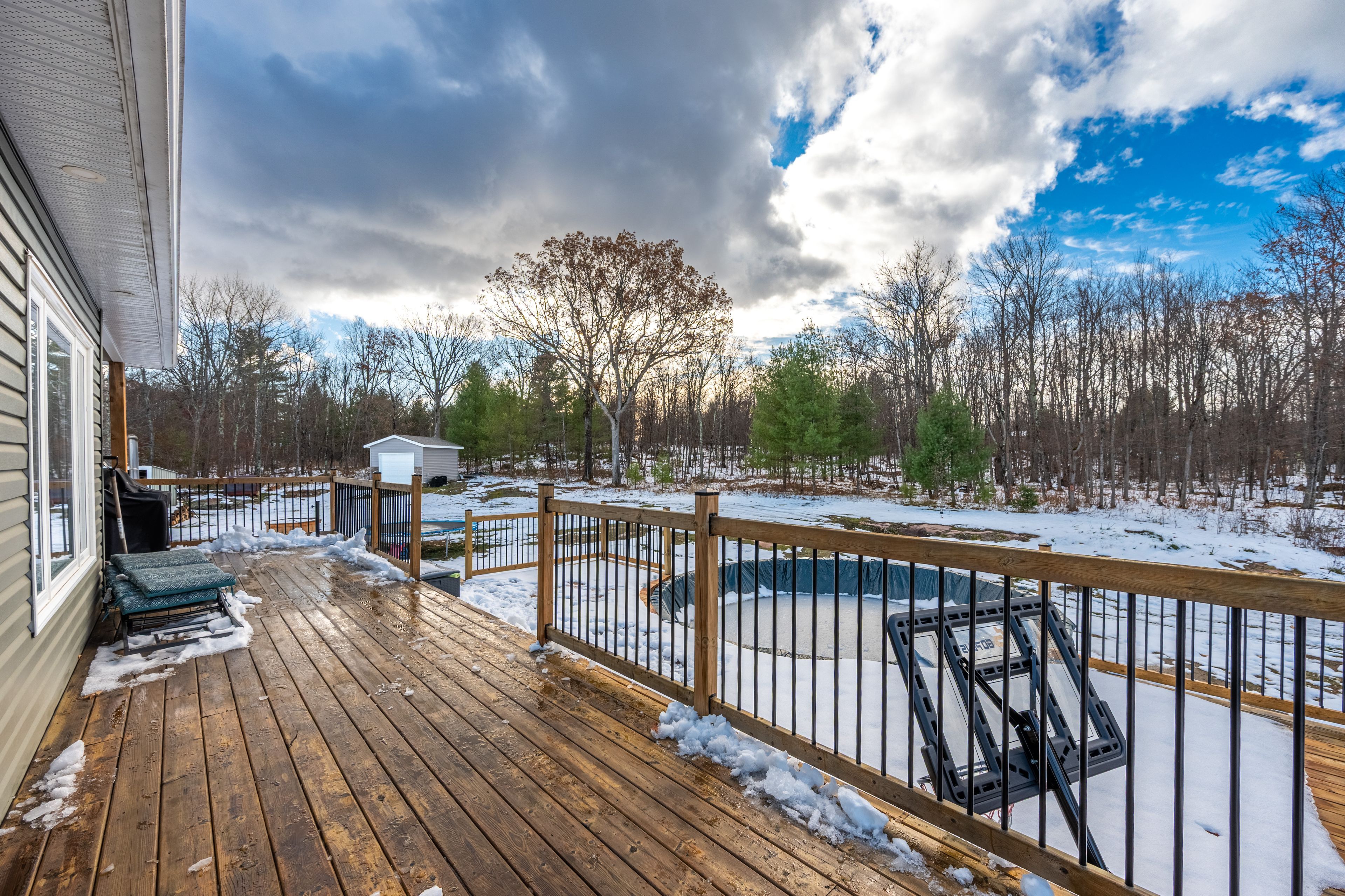 • Outdoor features include a covered porch, two-tiered deck, and above-ground pool.
