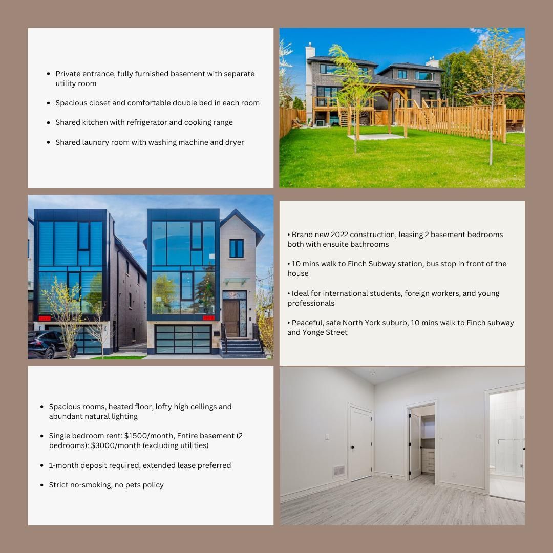 Bright & spacious 2-bedroom fully furnished lower-level suite - 155b drewry avenue, newtonbrook west, toronto. Discover this exceptional, fully furnished 2-bedroom lower-level suite in the highly desirable newtonbrook west neighbourhood. Featuring approximately 200 sq ft per bedroom, each generously sized room offers impressive 10-foot ceilings and plenty of space to add extra furniture, such as a sofa or dining table. Both large bedrooms come with private ensuites, ample closet space, and abundant natural light. Enjoy maximum privacy with a separate private entrance, a modern full kitchen equipped with stainless steel appliances, in-suite washer and dryer, sleek contemporary finishes, and luxurious heated floors throughout. Move-in ready and hassle-free: all furniture is included, and all utilities - plus super-fast 1gb fibre internet - are covered in the rent. Perfect for professionals, students, or small families seeking independent living with every convenience already in place. Prime location just steps from yonge street, with ttc transit (only 5 minutes to finch station), shopping, parks, schools, and easy access to major highways.
