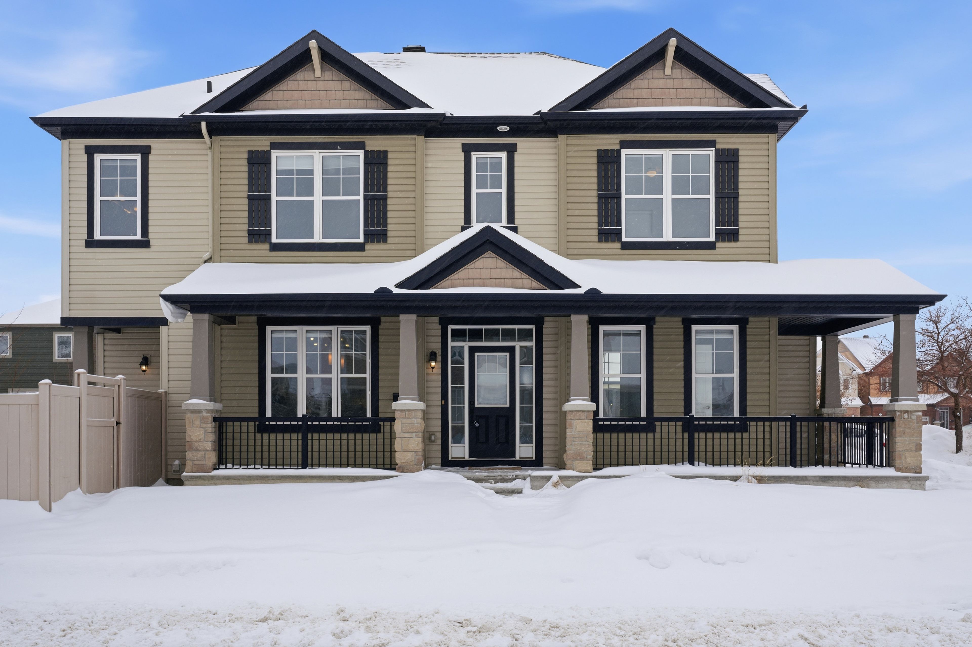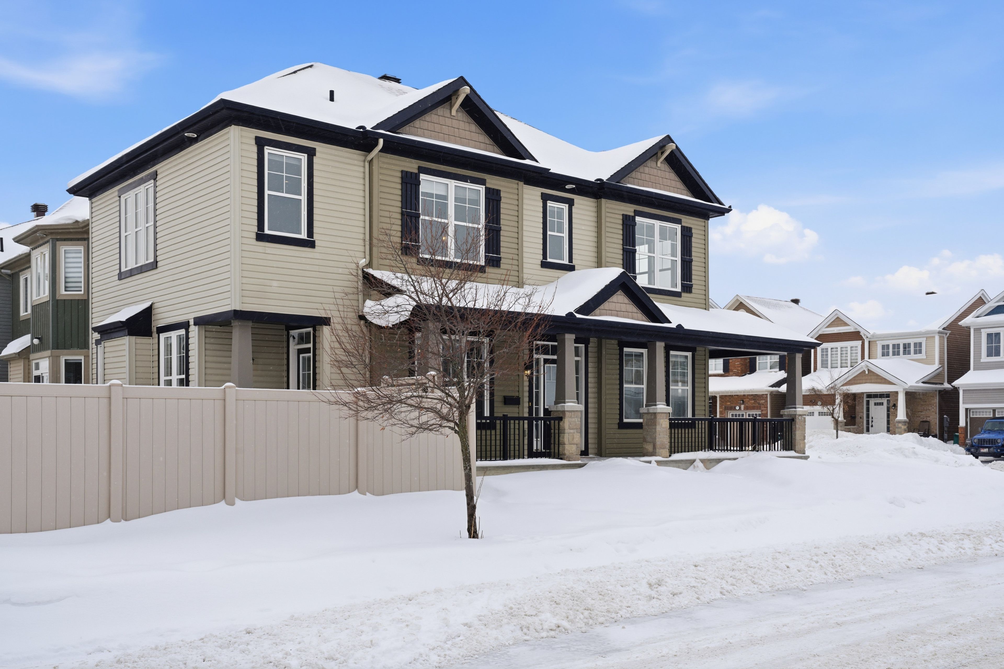 Stunning double garage single detached home situated on a premium corner lot in the highly sought-after barrhaven - half moon bay community. This home is freshly painted features an attractive open-concept layout with contemporary finishes and thoughtful upgrades throughout, creating a bright and inviting living space. The main level welcomes you with 9-foot ceilings, complemented by a combination of ceramic and hardwood flooring. The charming great room, complete with a cozy fireplace, is perfect for both entertaining and relaxing evenings at home. The sun-filled dining room is conveniently located adjacent to the kitchen, offering seamless flow for everyday living and hosting. The gourmet kitchen boasts quartz countertops, an oversized island with breakfast bar, and abundant cabinet space-ideal for both cooking and gathering. A hardwood staircase leads to the 9-foot ceilings upper level, where a versatile loft provides the perfect space for a family room, home office, or can easily be converted into a fourth bedroom. The spacious primary bedroom features a walk-in closet and a five-piece ensuite. Two additional well-sized bedrooms share the main bathroom. The basement provides excellent potential for storage or future development. The fully fenced backyard is generously sized and finished with an interlock patio and river stone, offering an ideal setting for family gatherings or quiet moments under the open sky. Located near top-ranked schools, including st. Benedict school, st. Joseph high school, and john mccrae secondary school. Enjoy walking distance to parks and the minto recreation centre, and just five minutes to barrhaven marketplace, home to walmart, loblaws, restaurants, and all essential amenities.