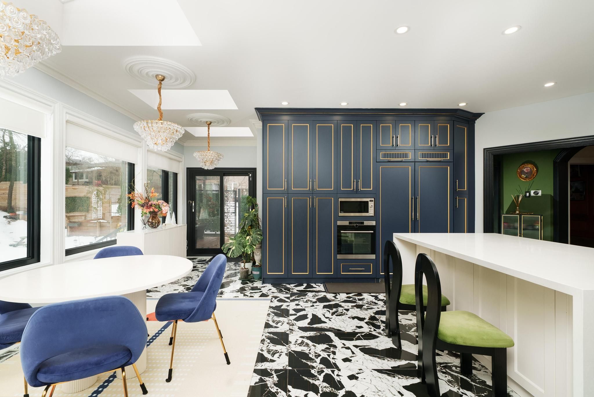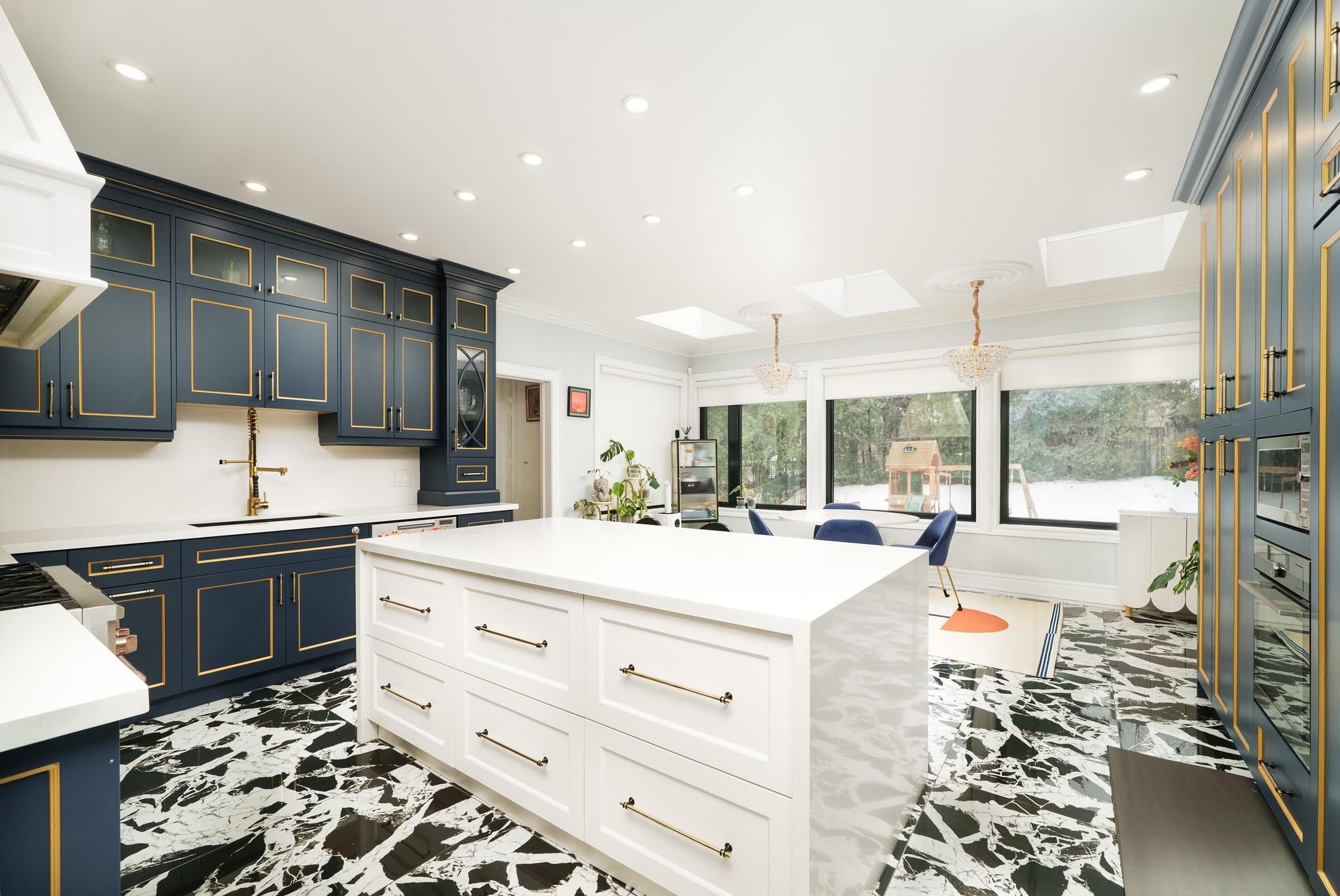 • Bright gourmet kitchen with a sun-filled breakfast area and multiple skylights.