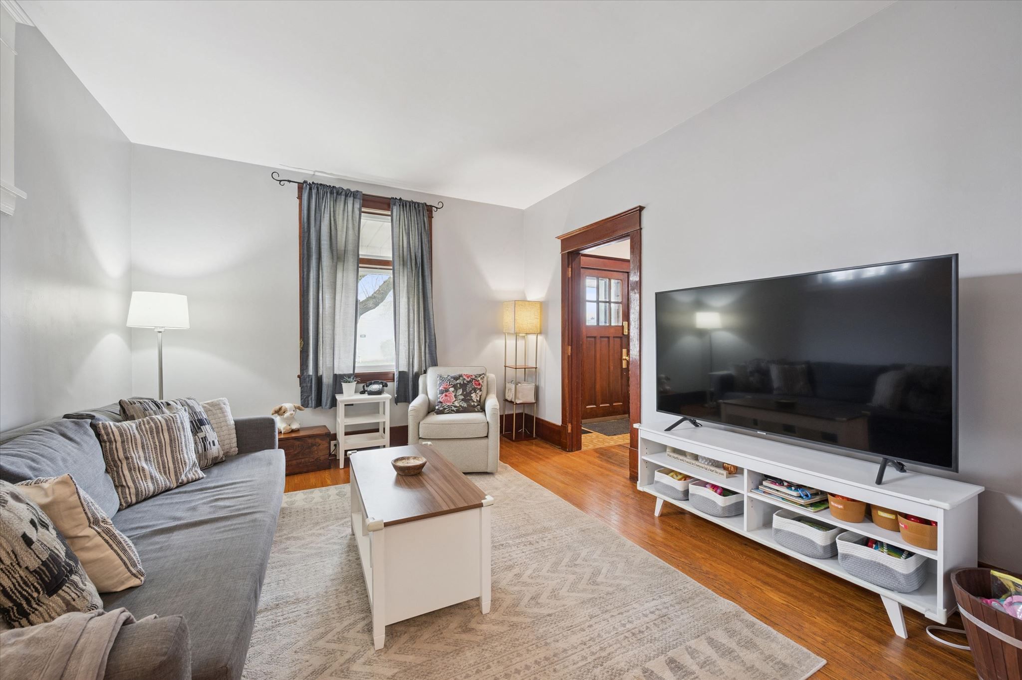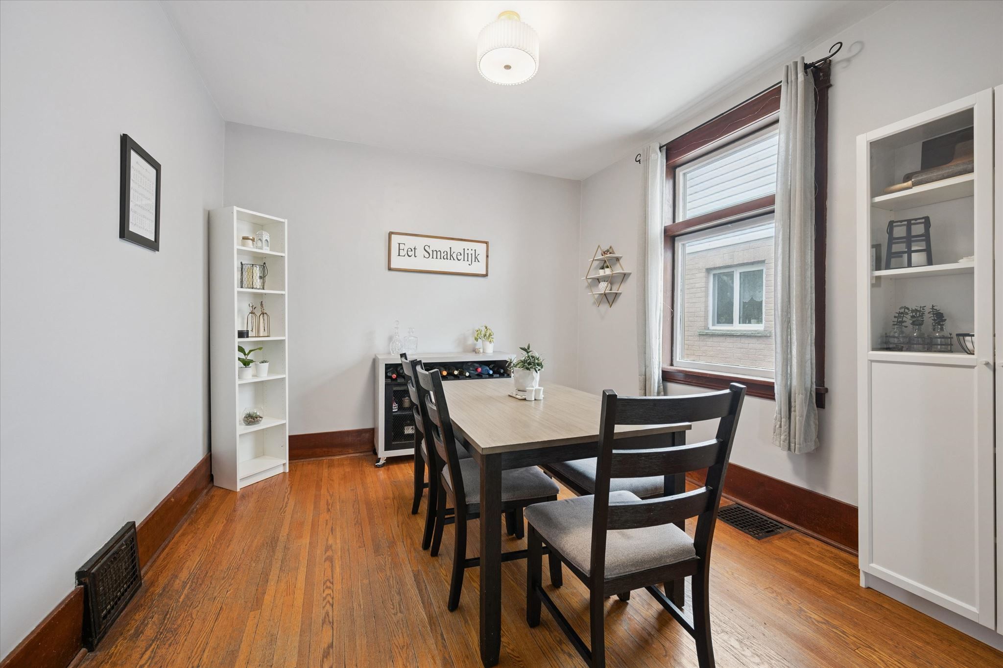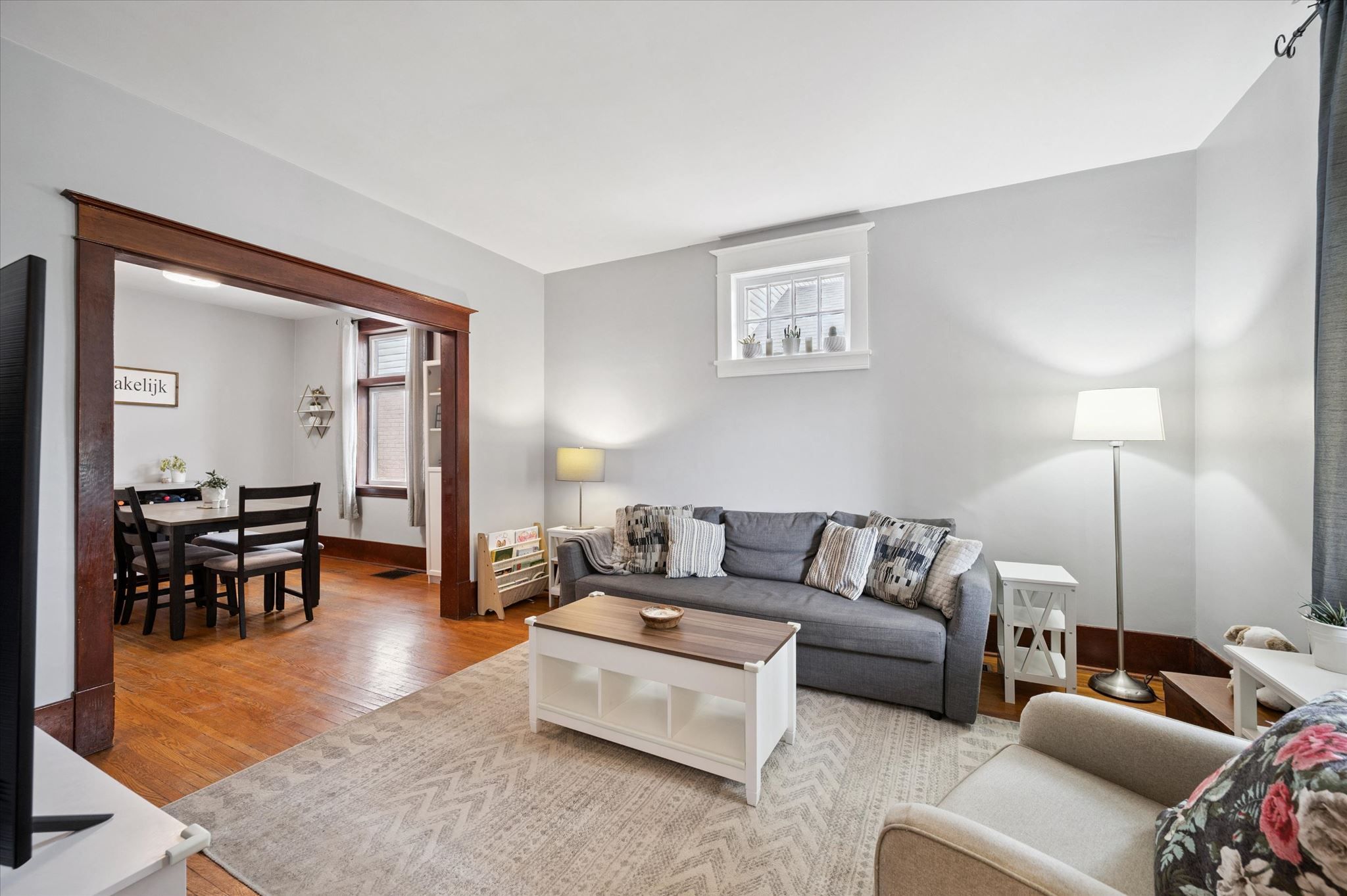 • Bright, open-concept living and dining space with original hardwood floors.