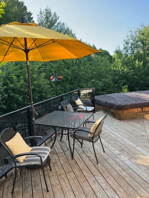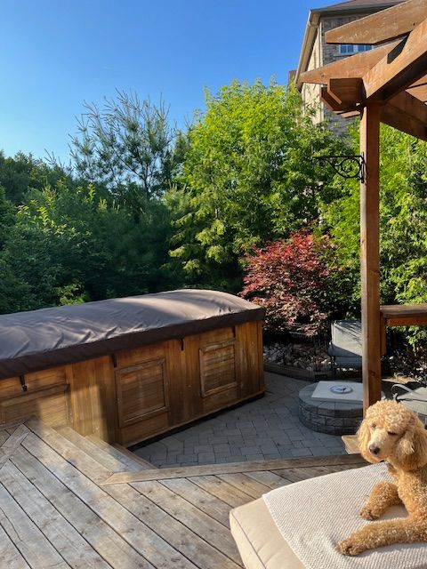 • Generous deck with pergola, gas BBQ, and hot tub for outdoor living.