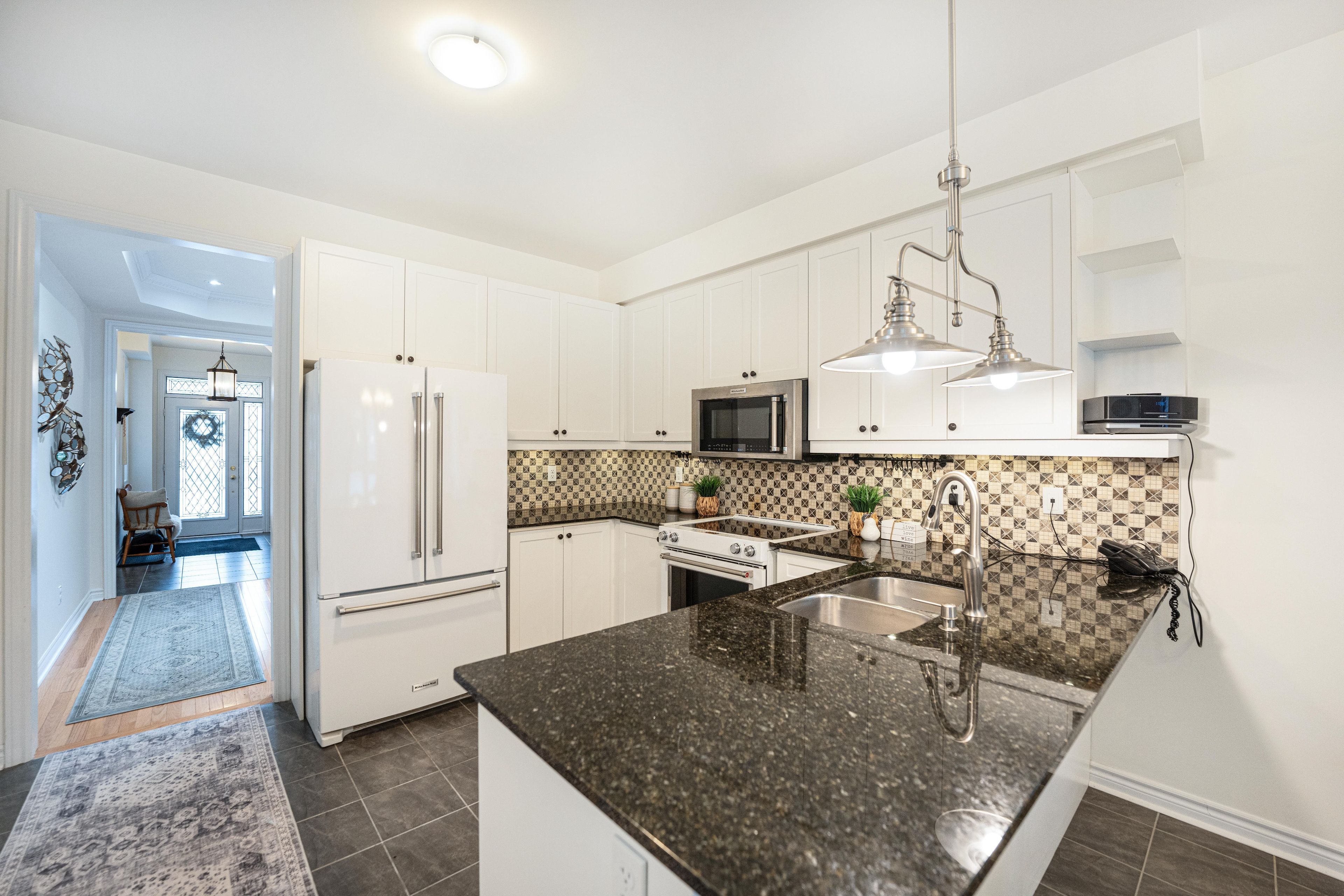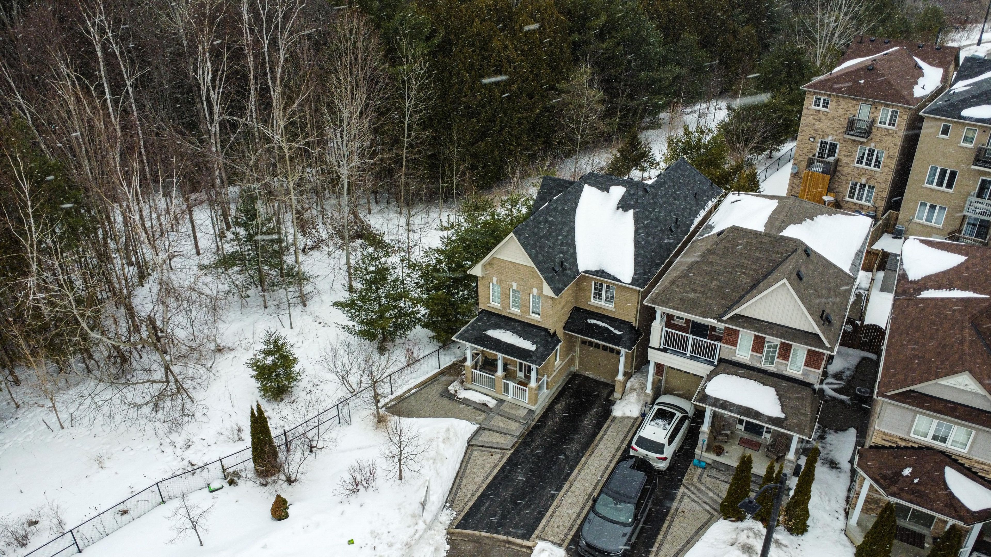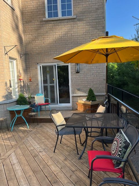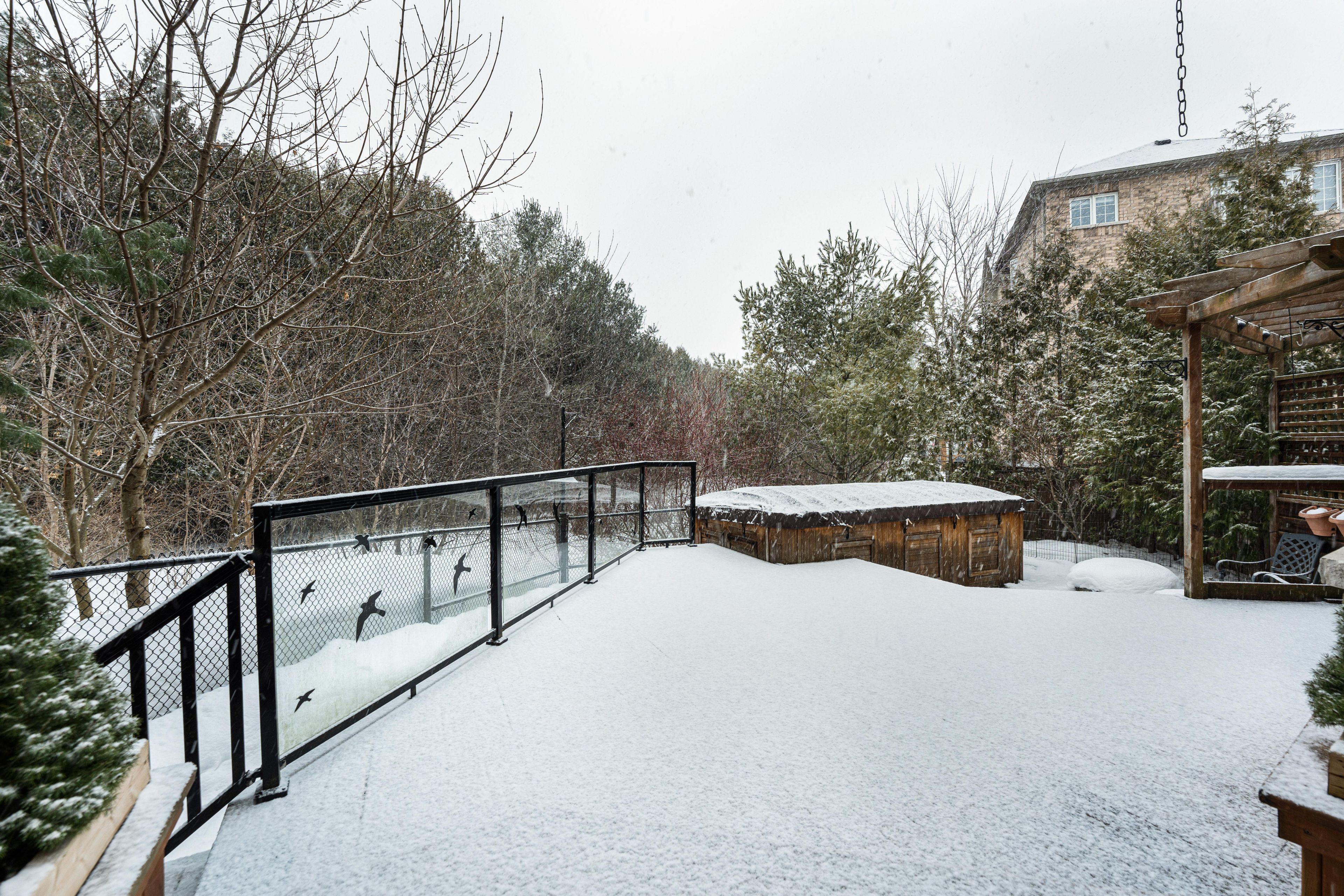 Tucked at the end of a quiet cul-de-sac, this end-lot detached sits beside the ravine with no neighbour to the west. The west side and backyard are wrapped in treeline and conservation, creating a true sense of retreat, where your daily view is greenery, birdsong, and sunset light filtering through the canopy. Curb appeal begins with an interlocking walkway framed by two interlocking flower beds. Out back, the lifestyle is the headline: step onto a generous deck with a pergola set against the forest edge. Entertain with a gas bbq connection, gather around the gas fire pit, then unwind in the arctic hot tub swim spa, all while the ravine and treeline deliver privacy you can feel. Thoughtful native plantings and trees invite monarchs and songbirds, while an outdoor pot light system extends the atmosphere into the evening. Inside, the main level offers a formal dining room with hardwood floors, a vaulted ceiling, pot lights, and a large window overlooking the trees. The open-concept kitchen features a wrap-around counter, tile backsplash, ceramic flooring, and a bright breakfast area with a walkout to the deck (glass door with shutters) plus a west-facing window to the ravine. The living room is warm and light-filled with a gas fireplace, hardwood, and large windows on two sides. Upstairs, an open study/loft with hardwood provides flexible work-from-home or lounge space. Bedrooms are generously sized with excellent closet storage. The primary suite impresses with a spa-like ensuite (soaker tub, glass shower, double vanity, separate toilet) and a custom built-in closet system. Second-floor laundry for added convenience. Finished basement includes two rooms and a 3-piece bath; currently used as a guitar/wood workshop. Equipment may stay or be removed. Minutes to seaton centre shops, banks, cafes, dining, trails/green space, and pickering golf club. Furnace 2015, ac 2016, roof 2015, hwt 2015, hot tub swim spa 2016, deck & pergola 2016. Window 2015
