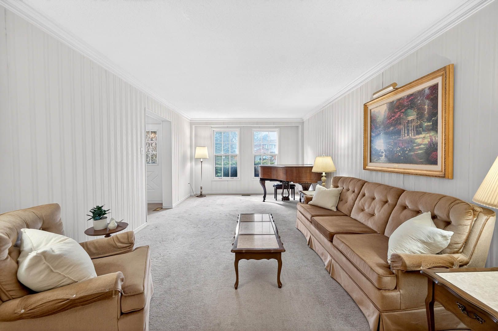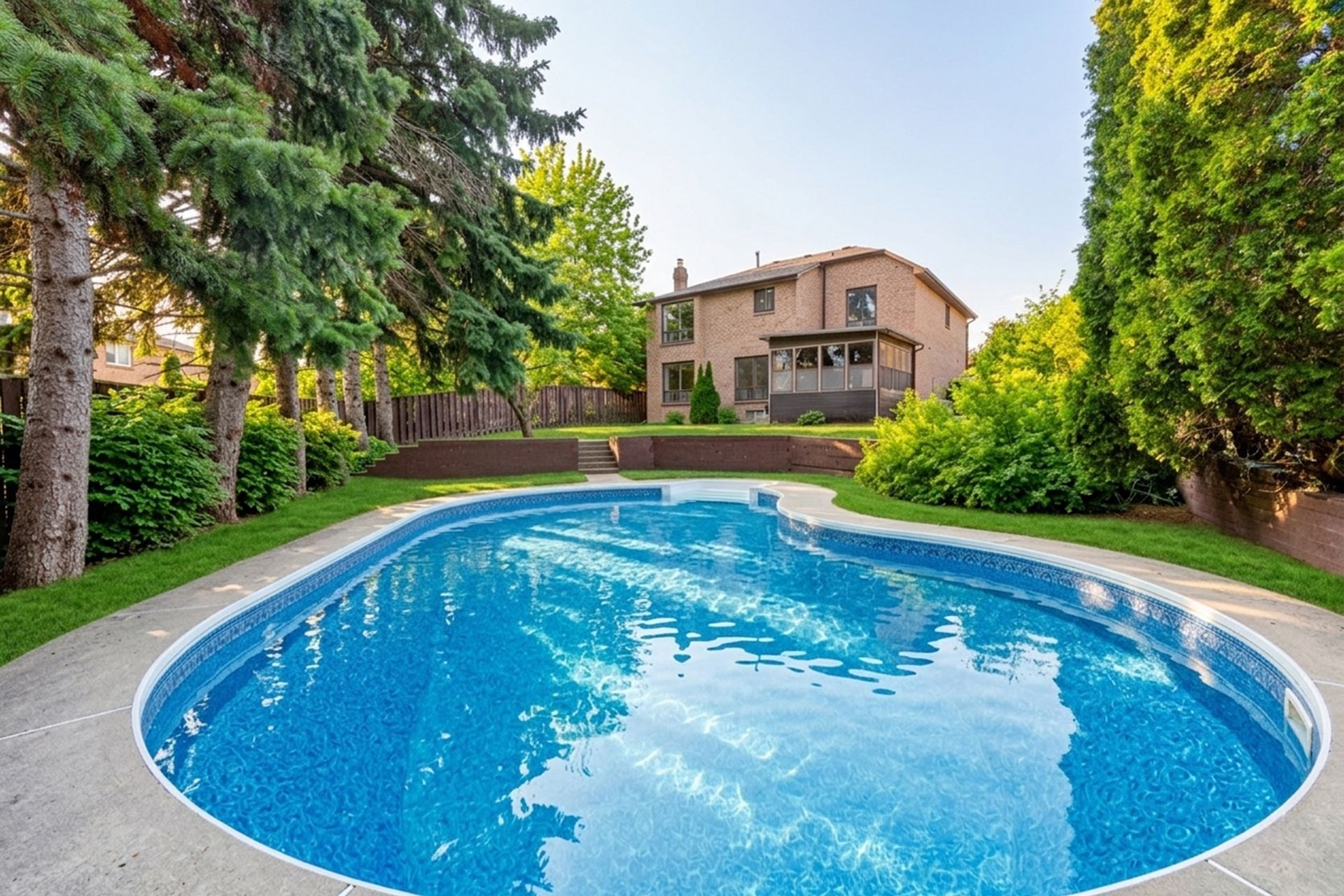 • Large pie-shaped lot with a heated in-ground pool and mature trees.
