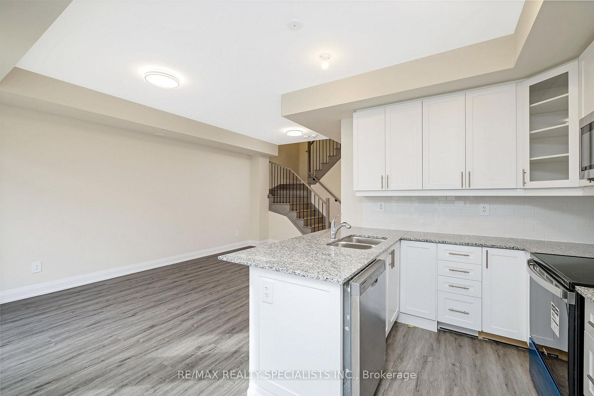 • Modern open-concept kitchen with granite countertops and stainless steel appliances.