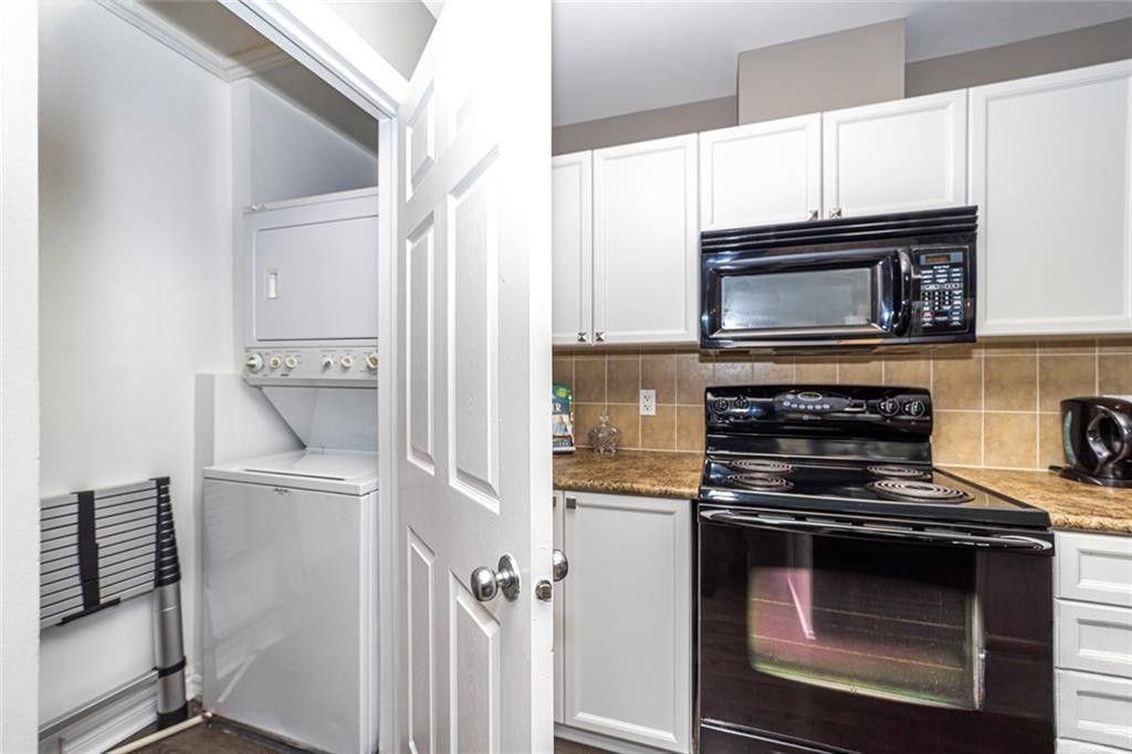 • Modern kitchen with white cabinetry and convenient in-unit laundry.