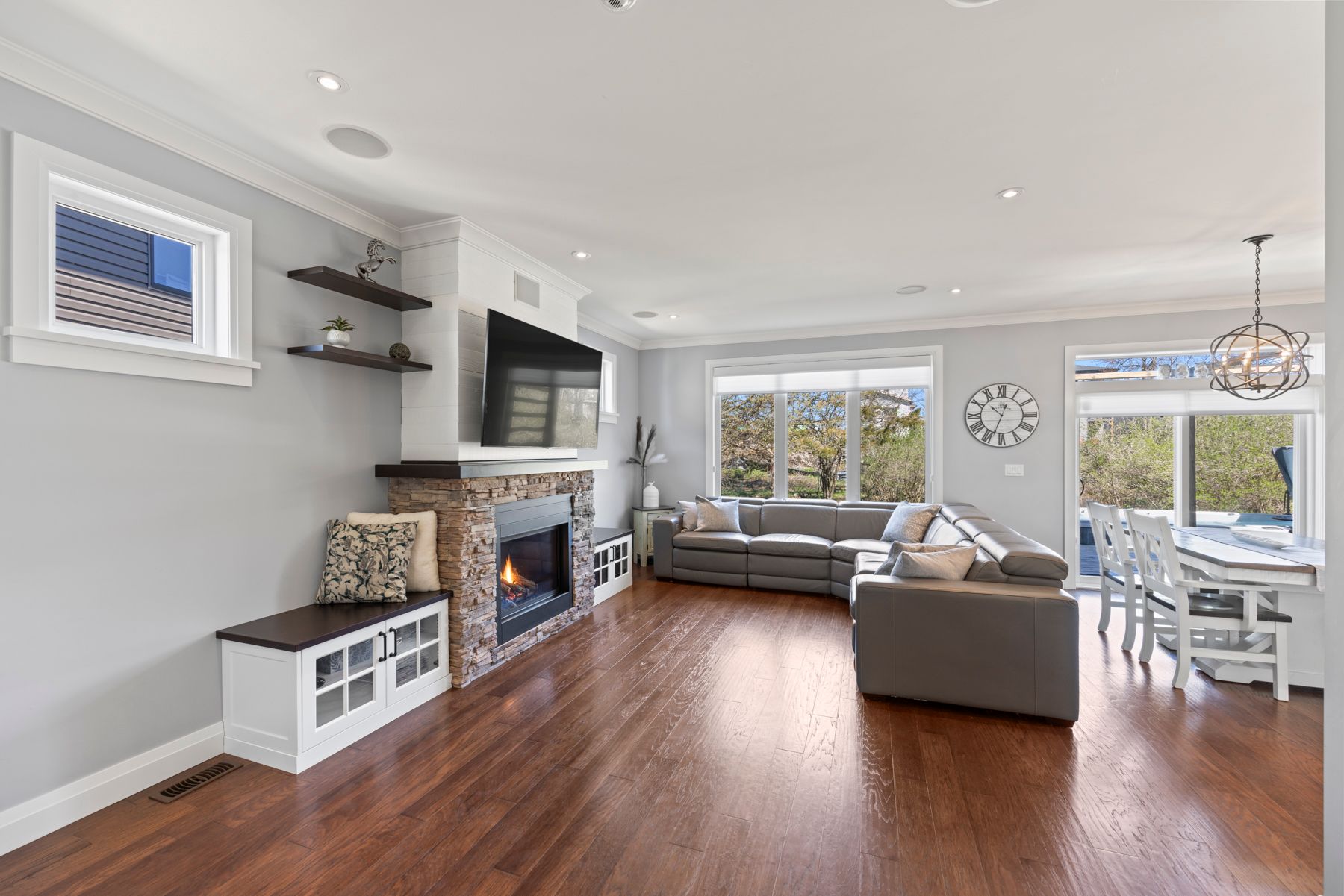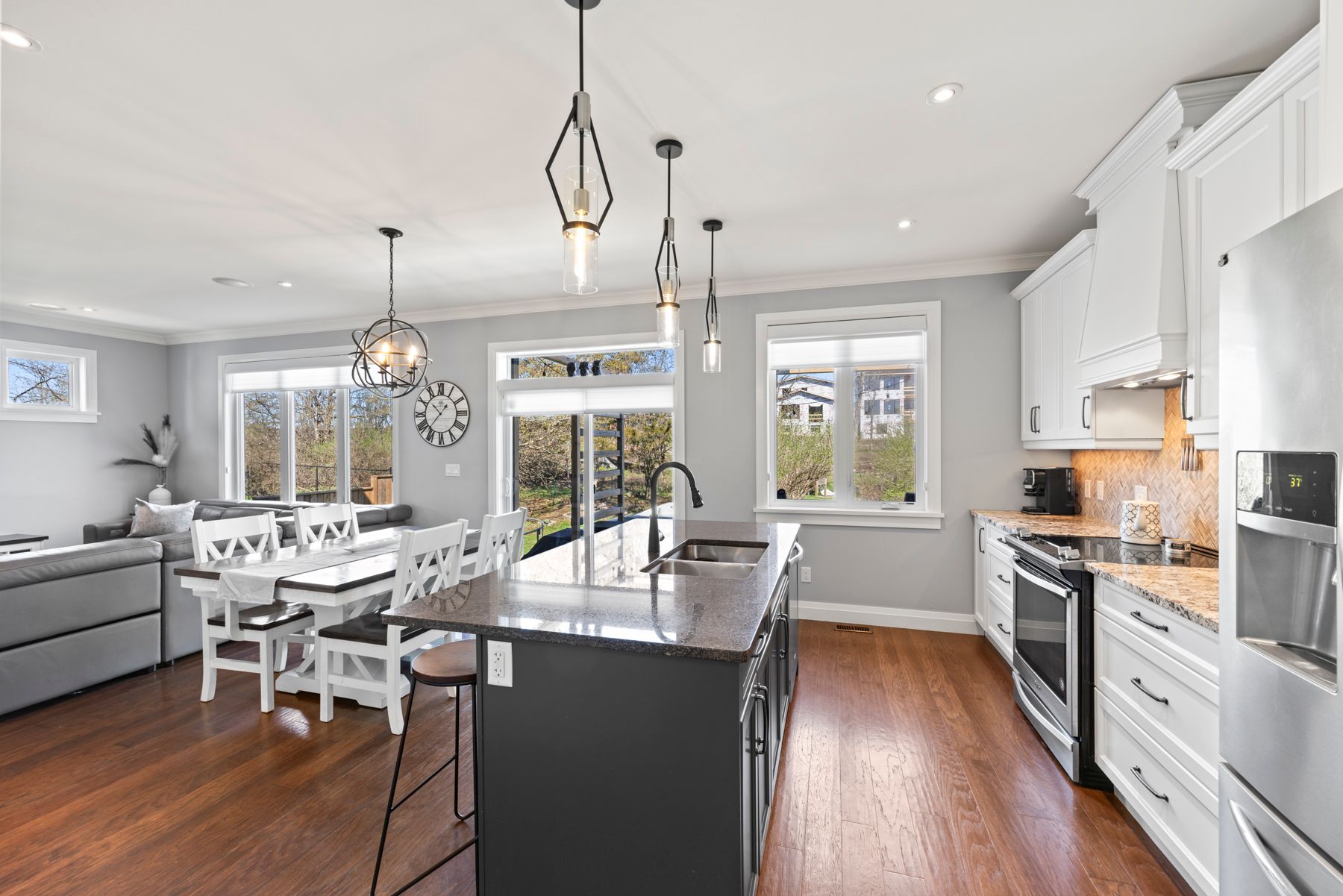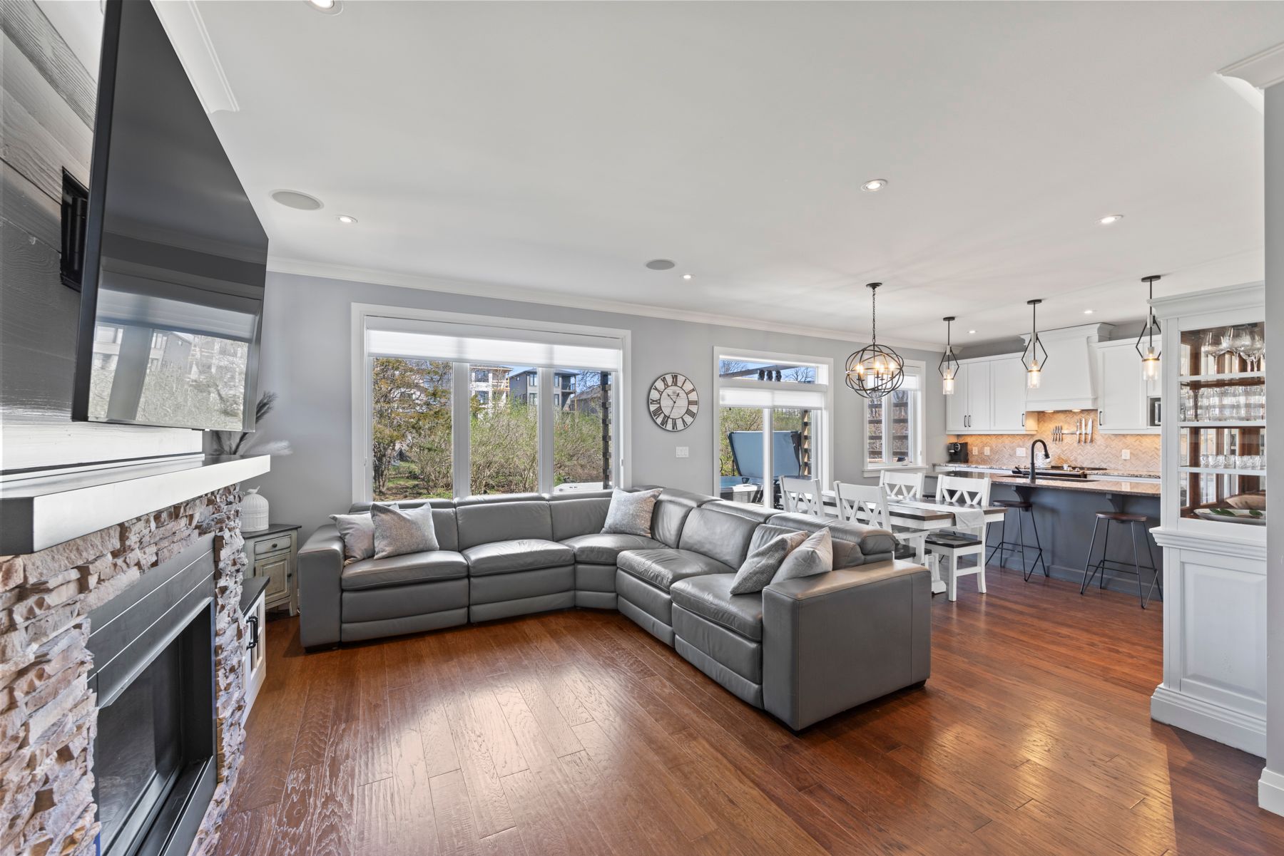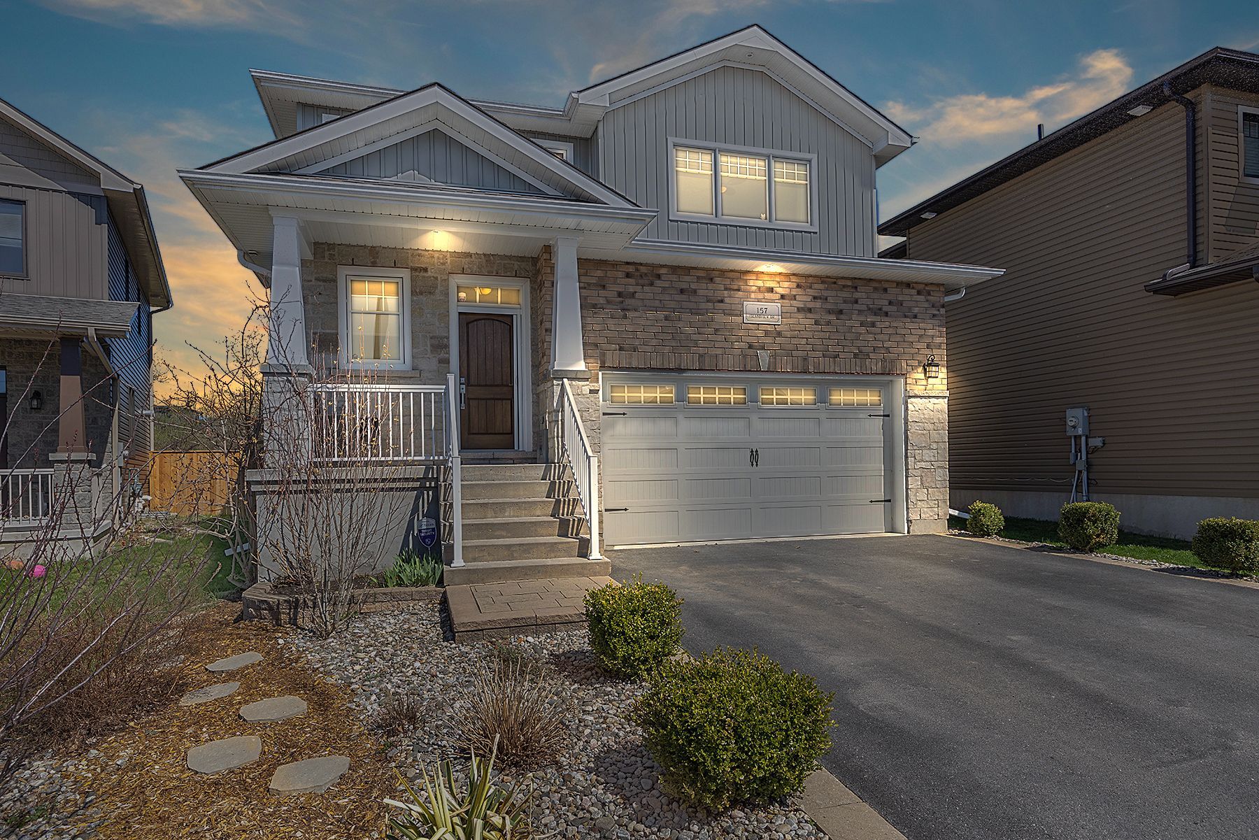 Custom-built 2-storey family home by bellefield, showcasing exceptional craftsmanship and standout curb appeal. This home offers 4bedrooms, 3. 5 baths, and nearly 3,000 sq ft of beautifully finished living space. The unique architectural design features 9-foot ceilings, an expansive entryway, hardwood flooring, and upgraded trim throughout. The gourmet chef's kitchen is equipped with granite countertops, custom cabinetry, and a spacious island, flowing seamlessly into the open-concept main floor that is perfect for entertaining. This inviting space is filled with natural light and features custom-built shelving around the gas fireplace, along with patio doors that lead to a private deck and swim spa overlooking the fully landscaped property. Just off the kitchen, a generous mudroom provides convenient access to the laundry area and attached double garage. Upstairs, the primary suite impresses with elegant double doors, a custom accent wall, and a walk-in closet with exceptional built-in organization. The private ensuite includes double sinks, a walk-in shower, and a luxurious soaker tub. 3 additional generously sized bedrooms, each with large, bright windows, complete the upper level, two of which share a jack-and-jill bathroom. The finished lower level adds even more living space, offering a spacious recreation room, a stylish 3-piece bathroom, and ample storage in the utility room. Ideally located in a highly sought-after neighbourhood, this home is close to schools, recreational amenities, and lake ontario.