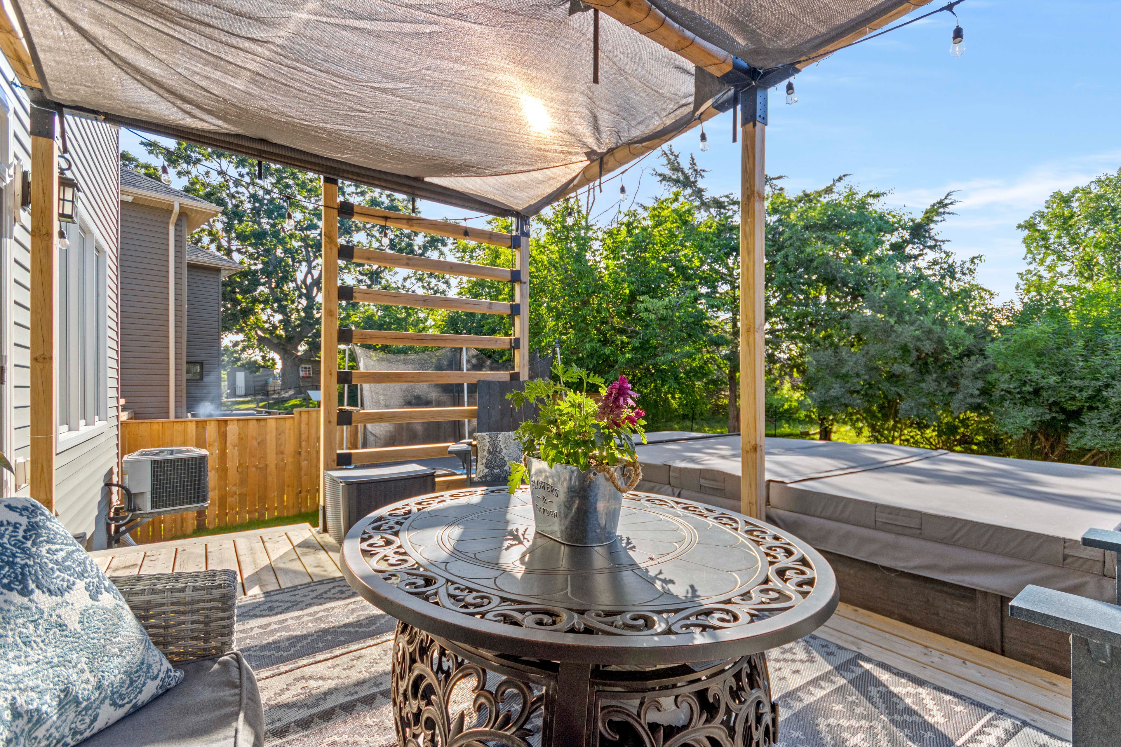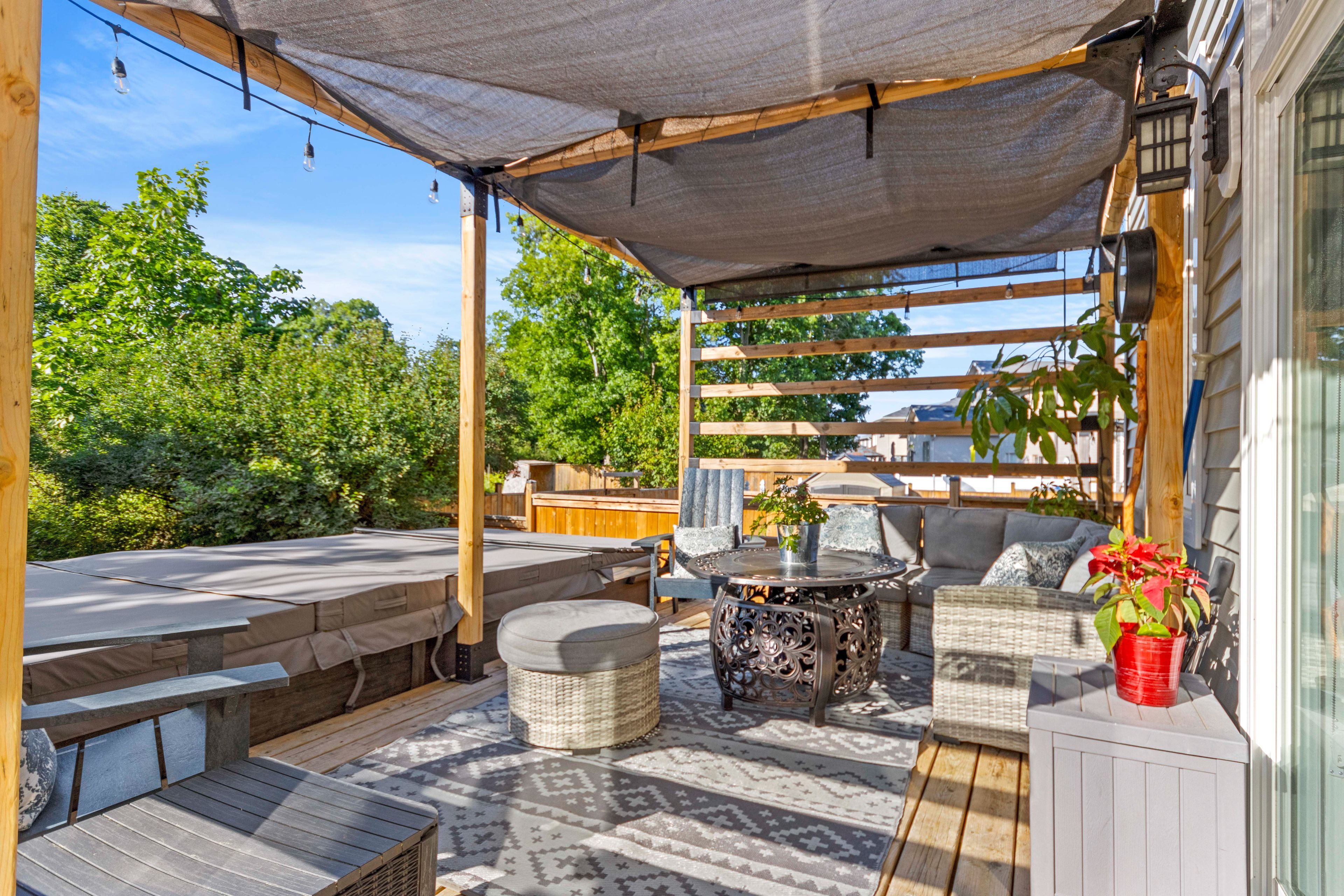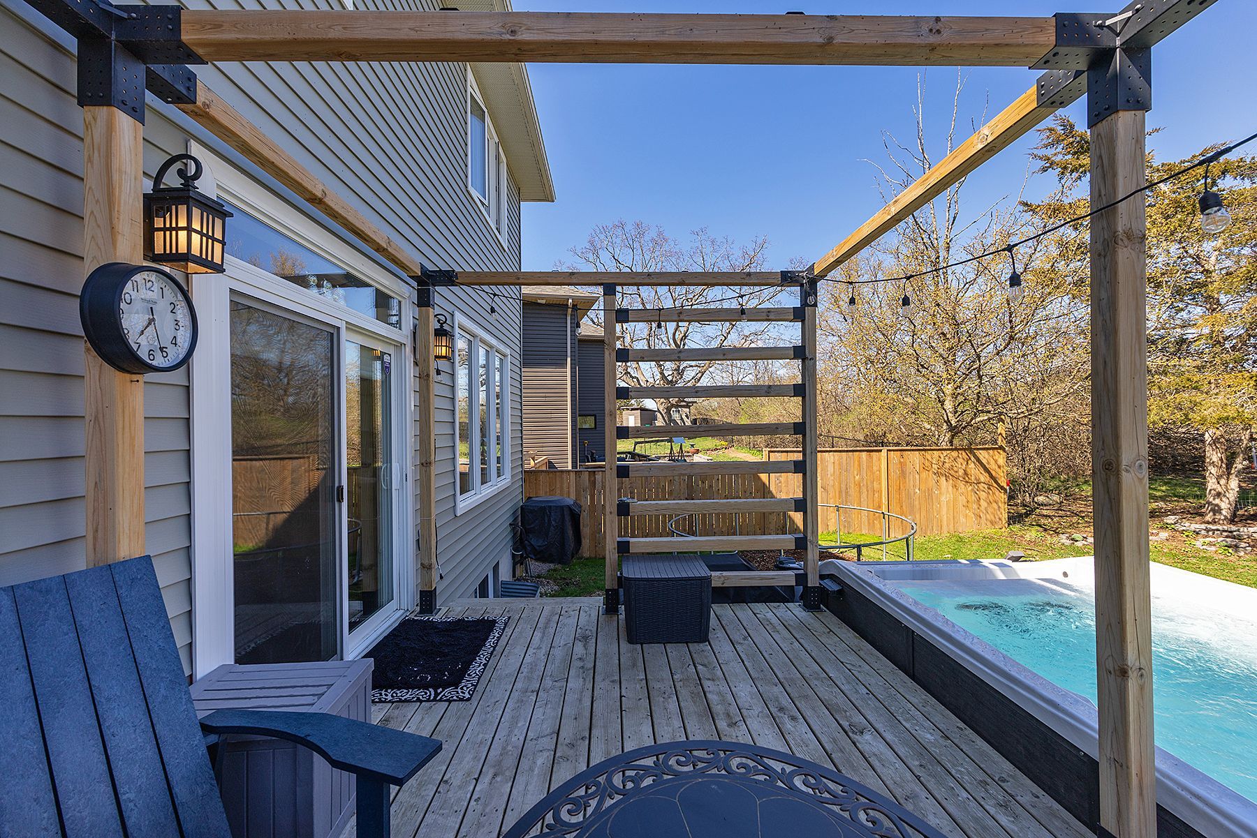 • Private deck with swim spa overlooking landscaped property for relaxation.
