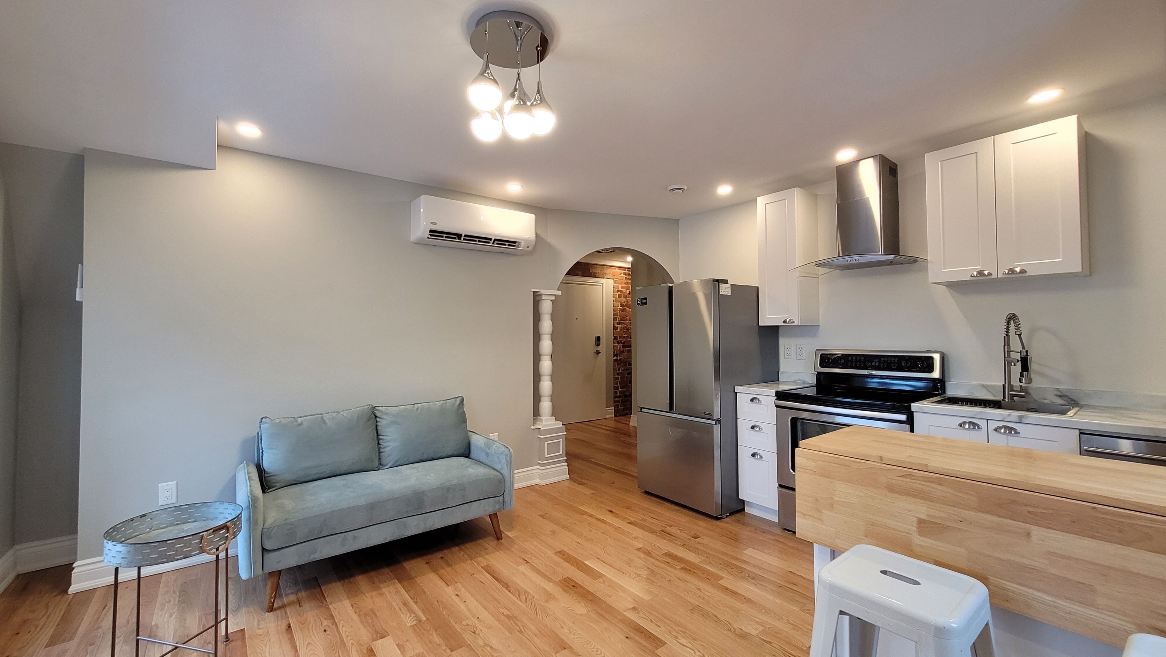 Unit 302 - 1 bedroom 1 4-pc bathroom executive apartment with sunroom/den facing james street. Built in 1901, this historic red brick building has been totally gutted, rebuilt, modernized from ceiling, to wall, to floor, to structure, to studs, to heating system, to plumbing, to electricity, to heating and cooling system, to roof, to front steps, to the garden, to anything you can think of, completely new. Building has a total of 12, one or two bedroom executive apartments. All equipped with in-suite laundries, air conditioning for the summer, heat pumps for the winter, some have private outdoor balconies, some have indoor sunrooms/offices /dens. Most units still have their original historic red brick inside the indoor living space. All oak hardwood floorings and tiles throughout. Parking with fee are available at building parking lot. In centertown, 157 james street is all about its location. Check out the walkers score 97/100, the transit score 74/100, bikers score 92/100.