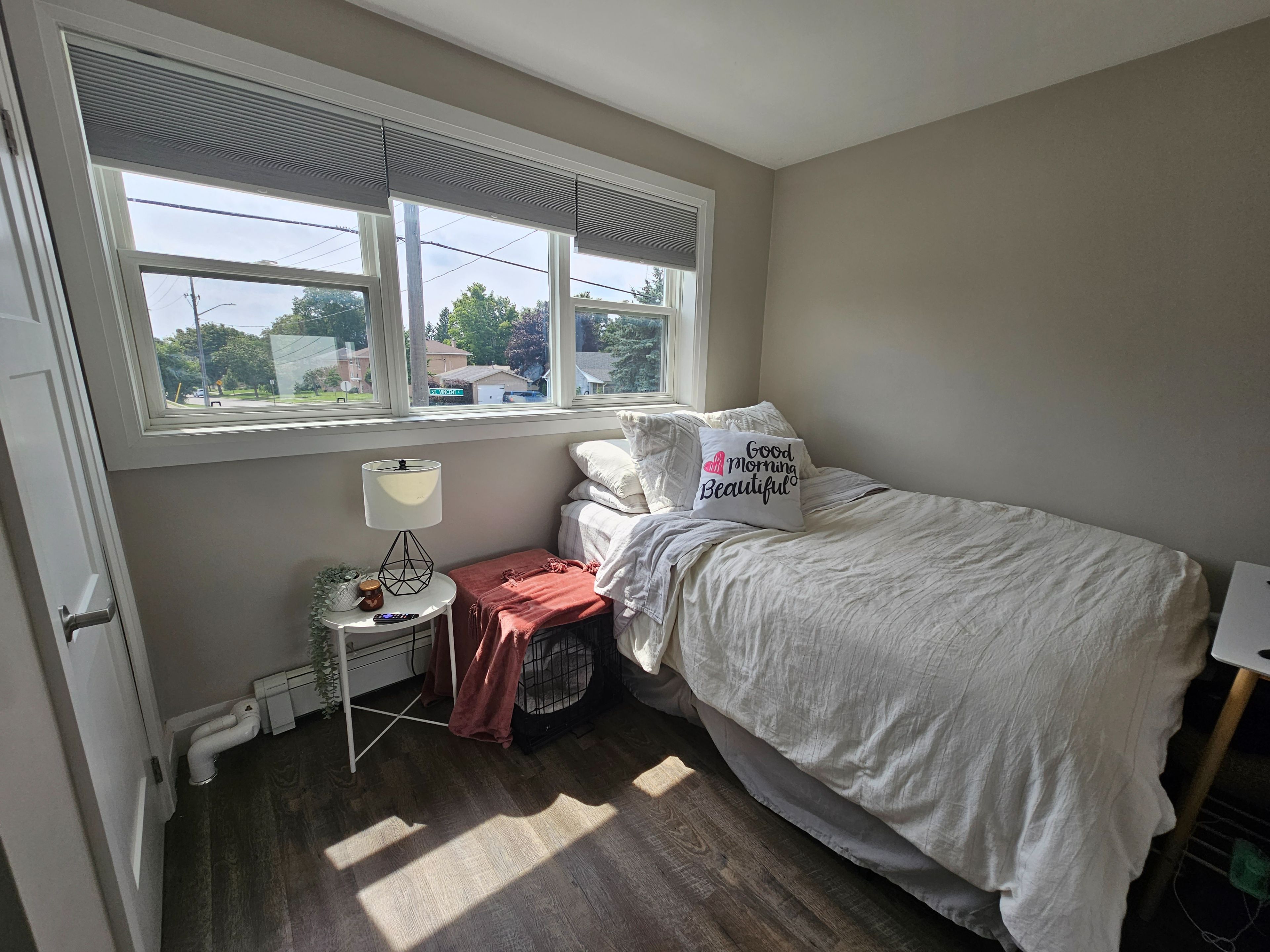 Available from january 1st. Beautiful, spacious and bright. Three bedroom apartment in a quiet triplex building in the heart of barrie. Highlights include newer windows, doors and appliances, including a built-in dishwasher and microwave, quartz countertop, spacious living and dining area, three-piece bathrooms, windows throughout with blinds, newer coin laundry, storage, water and two parking spots included. Close to amenities, hwy 400, lake simcoe and georgian college.