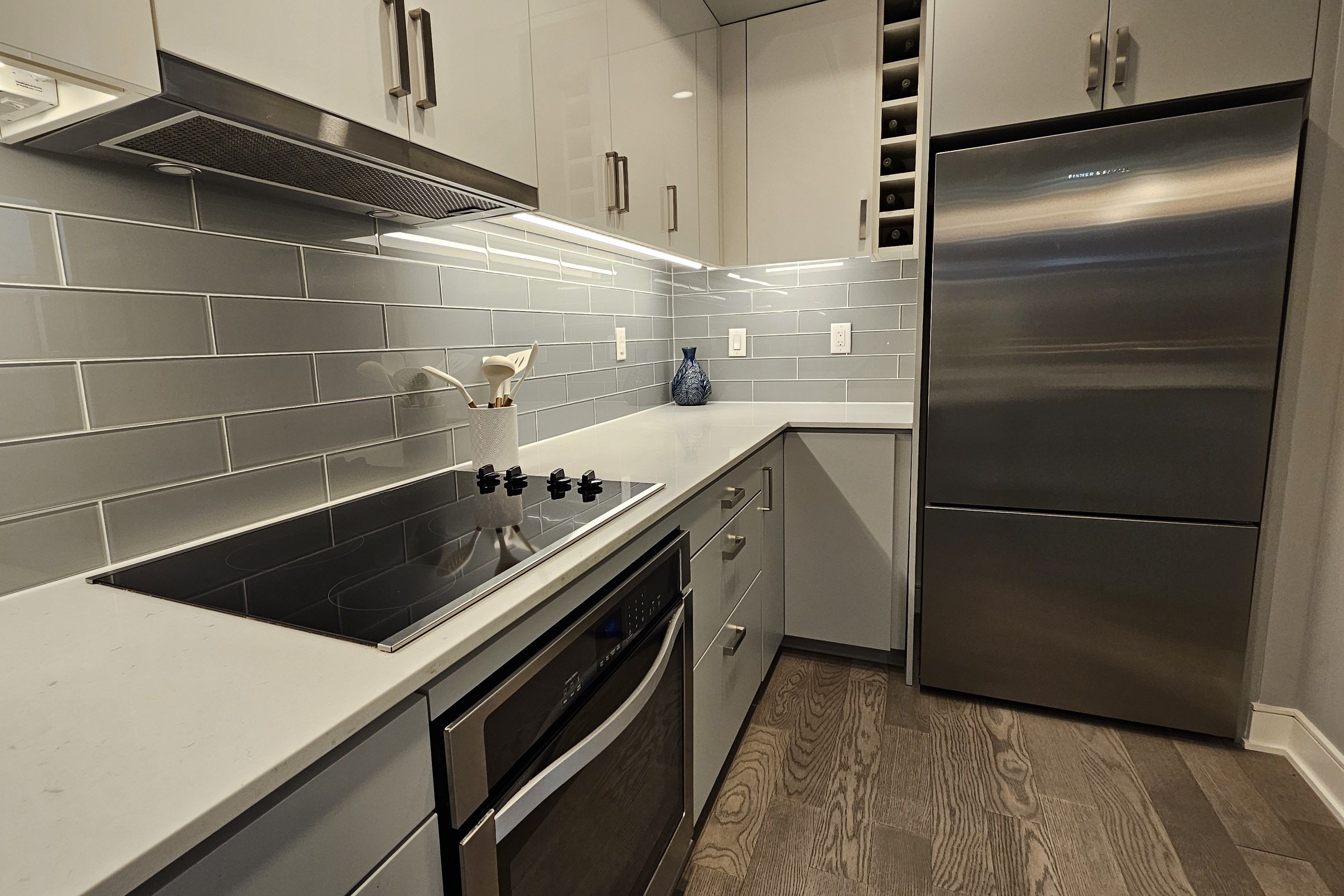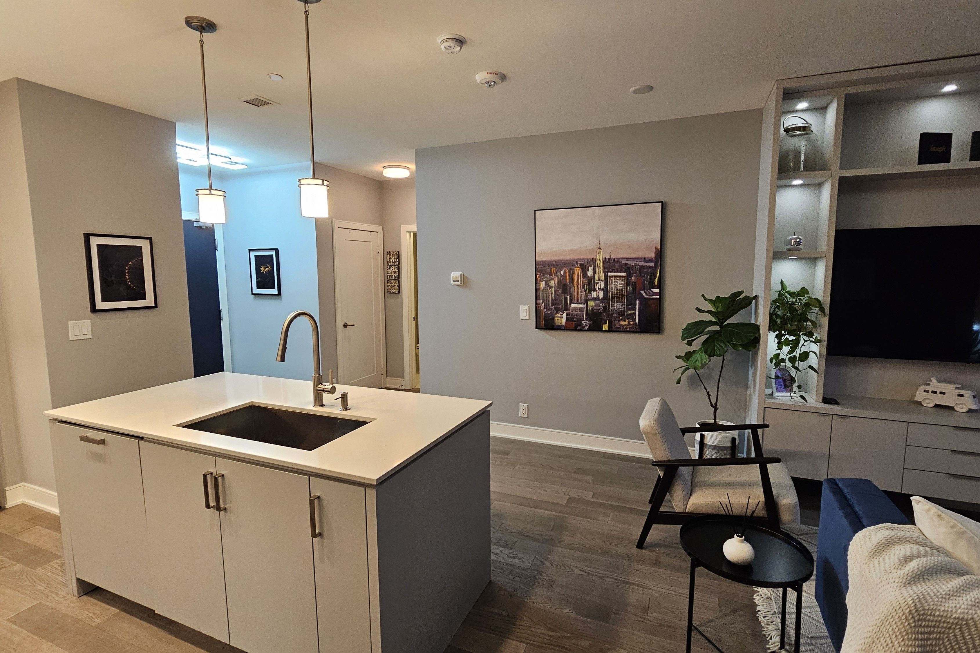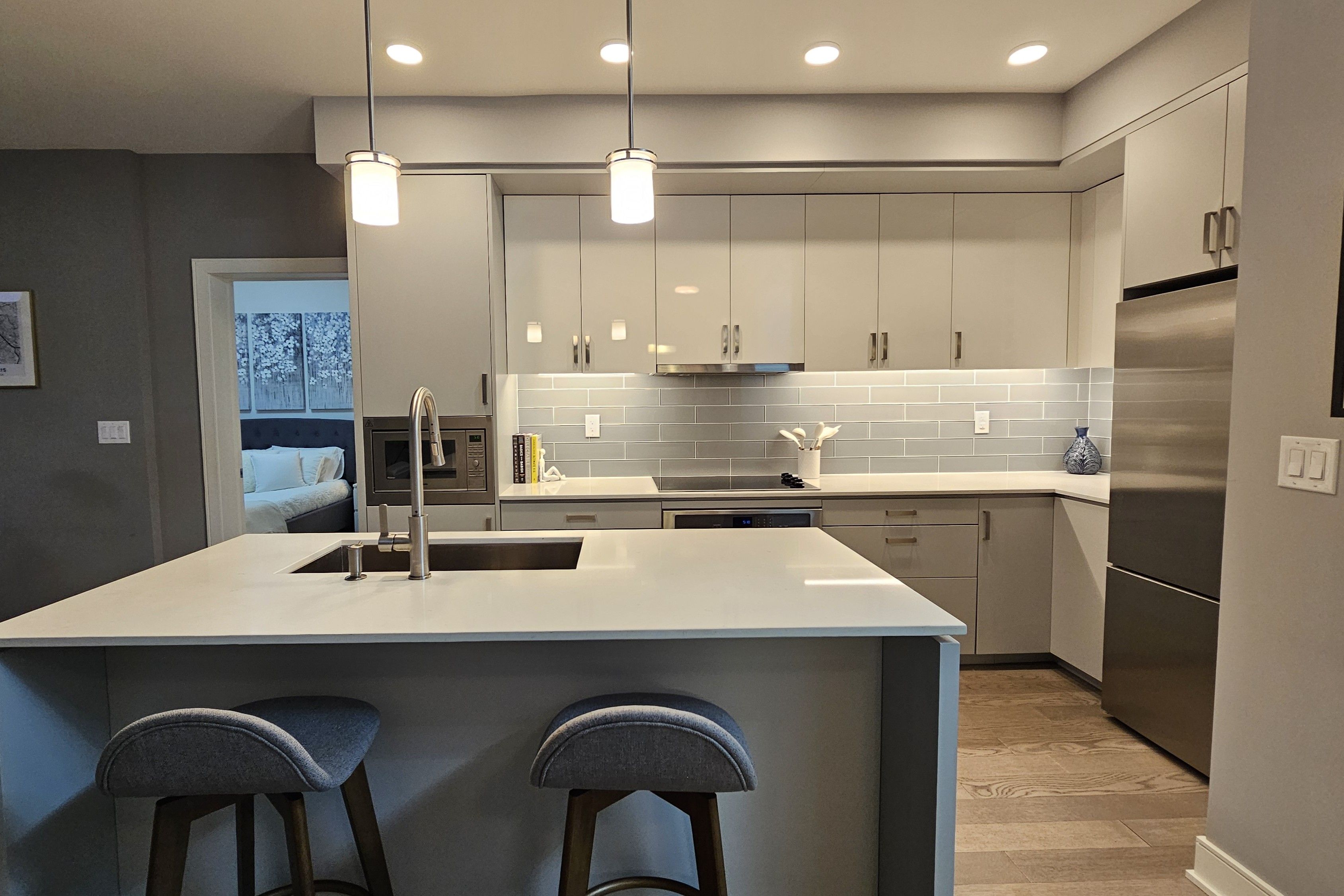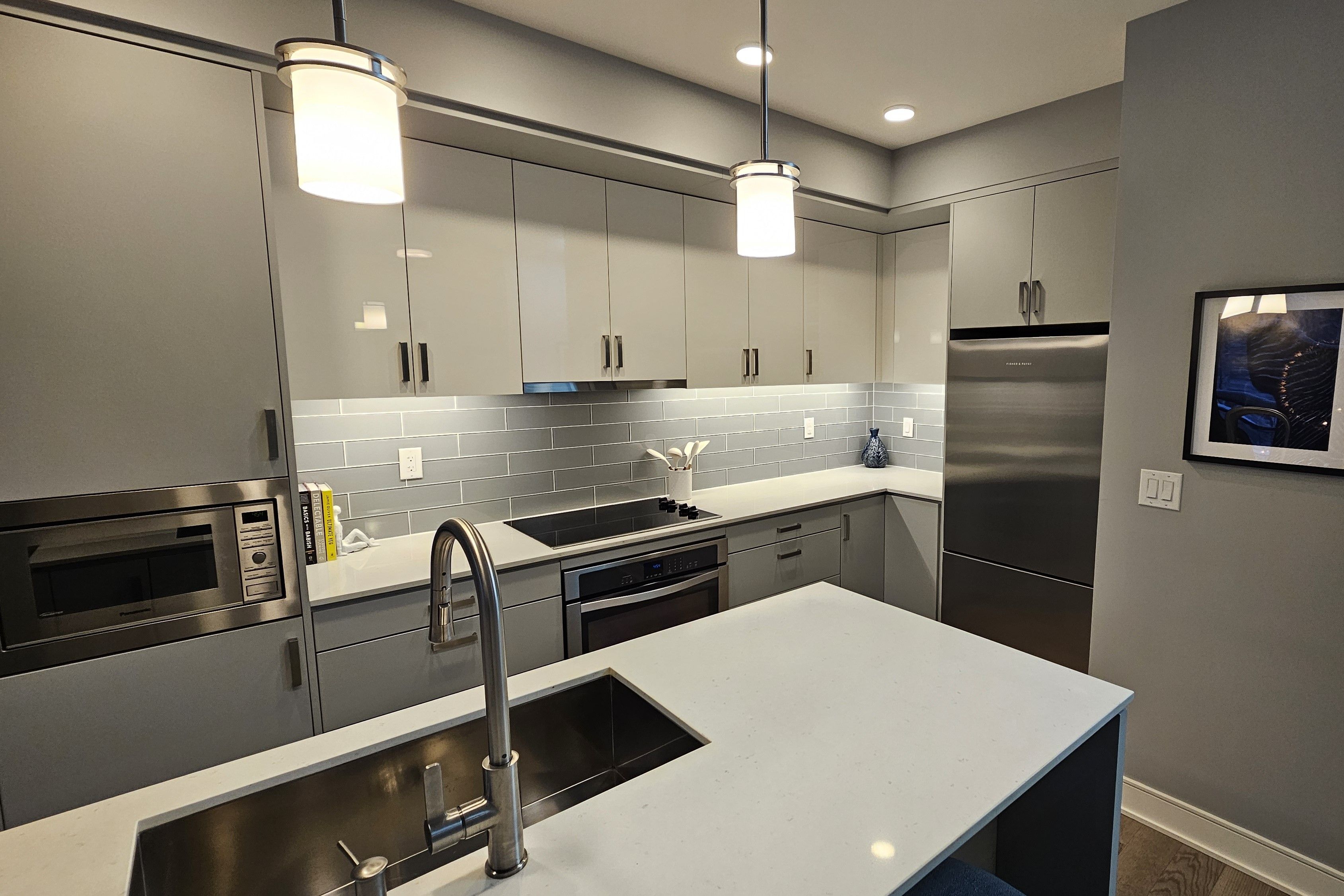 • Modern kitchen with built-in appliances and large island for entertaining.