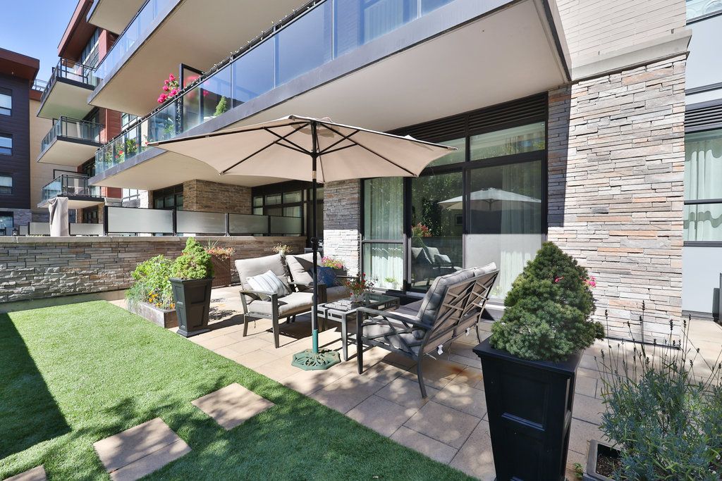 A unique and rare opportunity at the iconic and desirable craftsman in clarkson offering affordable luxury and ultimate convenience. Concierge, 24-hr security, a gym, yoga studio, rooftop w/bbqs, lush manicured grounds, and plenty of socials. These are just a few of many privileges that the residents of the craftsman enjoy. This "meadow wood" suite offers a sunny west exposure, a functional 960 sq ft layout with 2-bedrooms, 2-full washrooms and a showstopper 817 sq ft private terrace in the secure and lush west courtyard. Great for someone with a green thumb and/or pet. The suite features 9' ceilings with pot lights, tasteful 5" engineered hardwood flooring, an eat-in kitchen with large island and sink, full-sized fisher & paykel (31" fridge), whirlpool and panasonic appliances, backsplash and tasteful cabinetry. The primary bedroom features a large walk-in closet, stunning 3-pc ensuite bathroom and a walk-out to the terrace. Positioned on level 1, suite 155 offers simplicity and ease for coming and going. Well-suited for those seeking convenience, comfort, security and a connection to the outdoors. This home is something truly special.