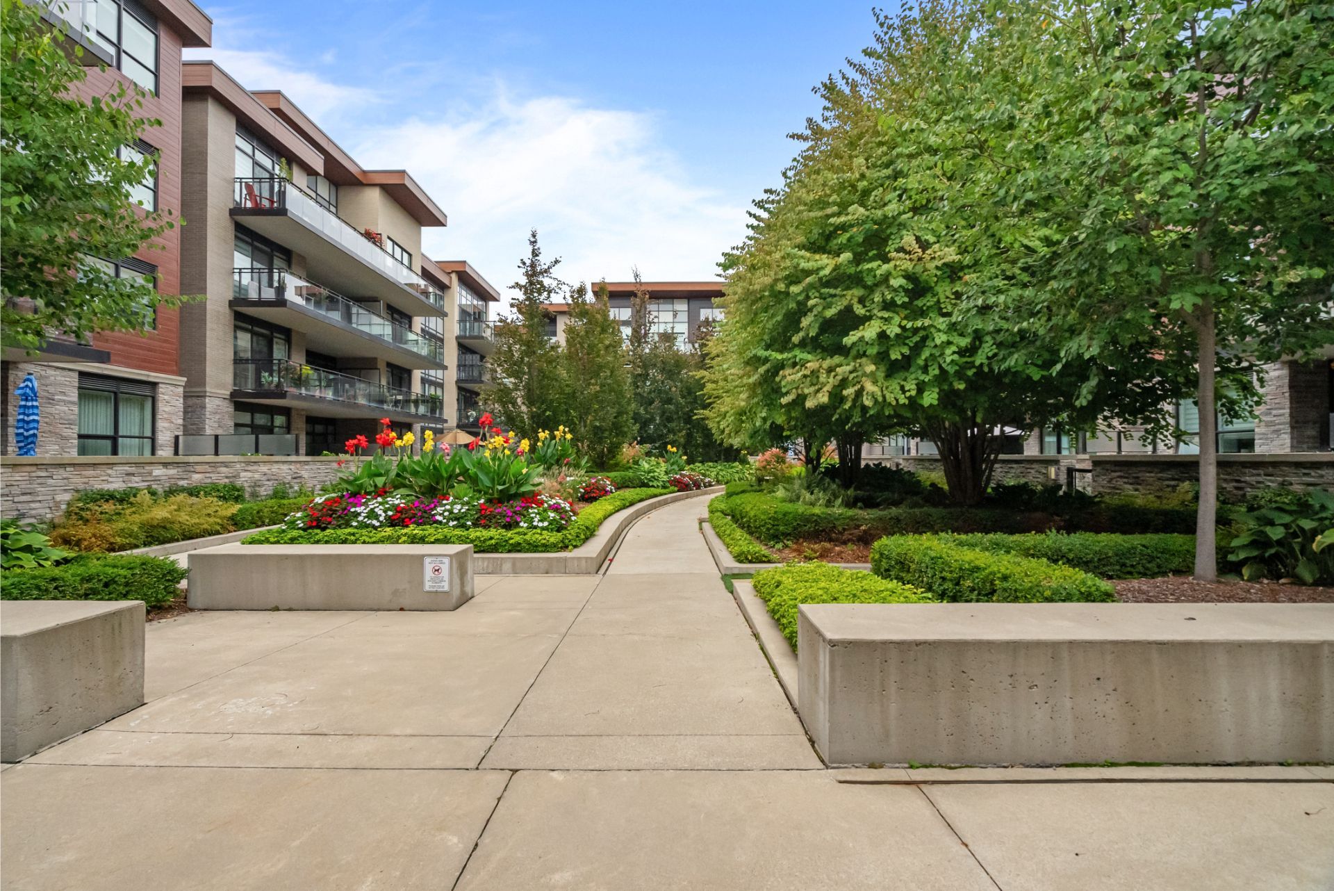 Welcome to the sought-after oak park model in the craftsman condos, located in the heart of clarkson village. This bright ground-level suite offers approximately 660 sq. Ft. Of open-concept living, featuring 1 bedroom plus a spacious den suitable for a dining area, home office, or guest space. The unit features 9-ft ceilings, hardwood flooring, and floor-to-ceiling windows providing abundant natural light, with a walk-out to a private terrace overlooking the landscaped garden. The modern kitchen is equipped with two-tone cabinetry, quartz countertops, stainless steel appliances, and a contemporary backsplash. Additional features include heated bathroom floors, custom window coverings, in-suite full-sized laundry, and smart thermostat (google nest v3). Generous closet space throughout. Includes one oversized parking space with private ev charger and convenient access for larger vehicles. Building amenities include 24-hour concierge, fitness and yoga studio, rooftop terrace, landscaped courtyard, party room, and guest suite. Ideally located close to parks, waterfront trails, shopping, restaurants, public transit, and minutes to clarkson go station and qew.