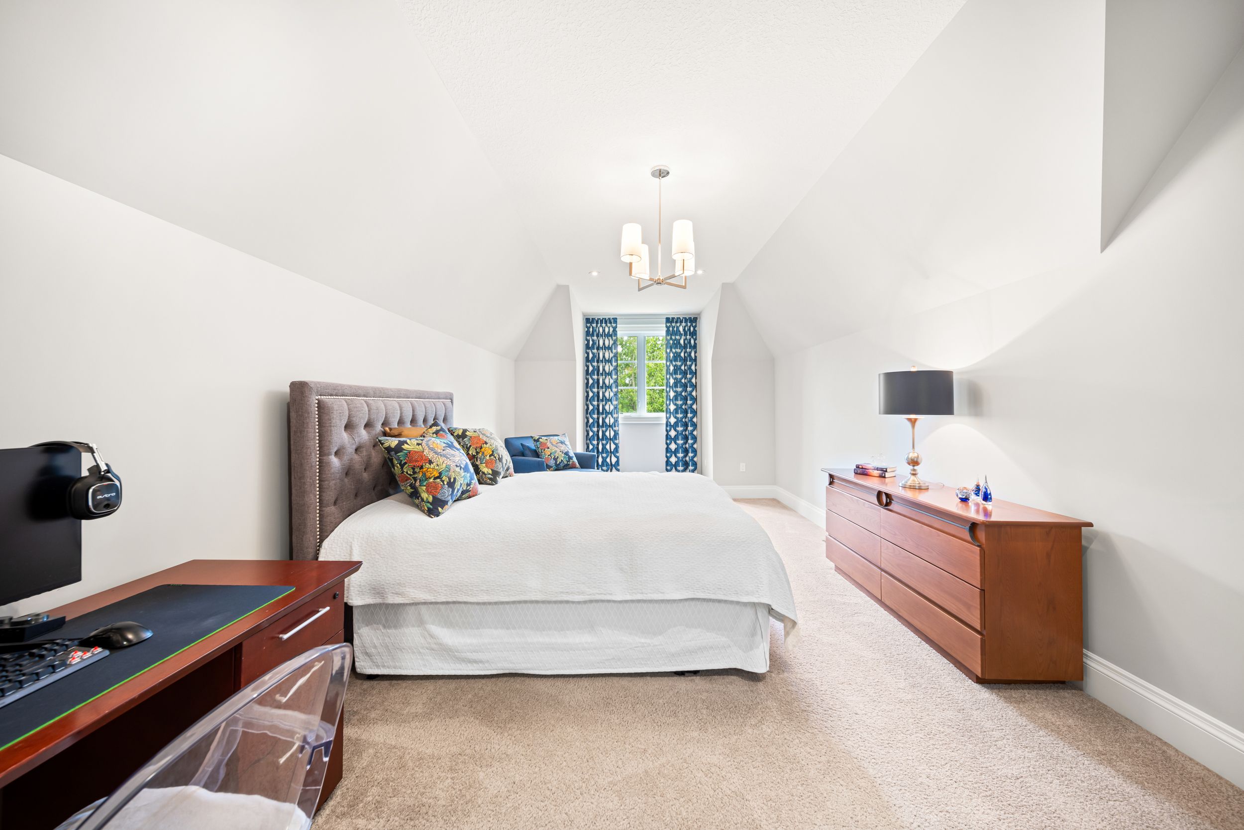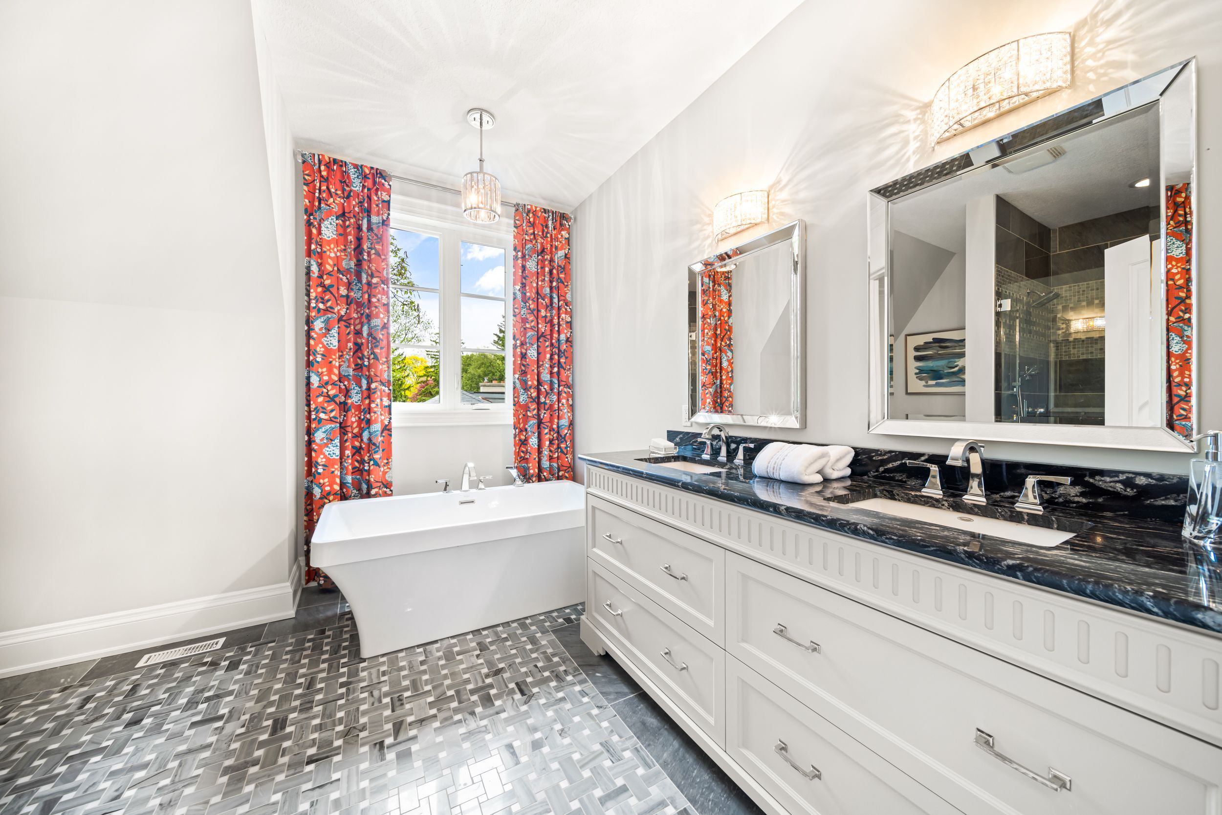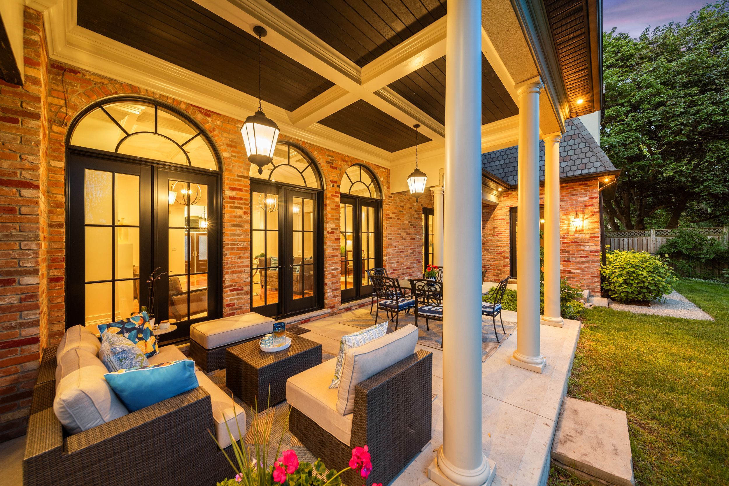 Welcome to this extraordinary bungaloft, nestled on a private, wooded lot and offering the perfect balance of luxury, function, and architectural detail. The main level impresses with 12-foot ceilings, walnut flooring and high-end finishes throughout. Tray ceilings in the formal dining room, coffered ceilings in key living spaces, and solid core doors enhance the sense of quality and scale. Expansive transom windows and high baseboards add architectural charm and natural light throughout. The main floor principal bedroom offers a serene retreat with tray ceilings, garden doors leading to the rear yard, and a stunning ensuite featuring marble tile with inlay, a freestanding tub, a glass-enclosed shower, dual vanities, and a spacious walk-in closet with custom built-ins and dual access. The family room is warmed by a wood-burning fireplace, while the separate living room offers a cozy natural gas fireplace. Two separate mudrooms-one off the front foyer and one off the garage-add everyday practicality to the homes thoughtful layout. The kitchen features premium wolf appliances, a farmhouse sink, pot filler, and a large island with seating. The adjacent servery includes a fridge, wall oven, microwave, and a secondary sink-ideal for hosting. Upstairs, the loft provides a versatile living area, two generously sized bedrooms, and a beautifully finished main bath with a double vanity, freestanding tub, glass shower, and elegant tile inlay flooring. The lower level adds versatility with two additional bedrooms and rough-in. A walk-up to the triple car garage enhances convenience and supports multi-generational living. Outside, enjoy a private, two-tiered backyard oasis with a covered rear porch, perfect for relaxing or entertaining. The expansive driveway offers parking for up to eight vehicles, in addition to the spacious triple car garage with built-in storage, completing this exceptional property.