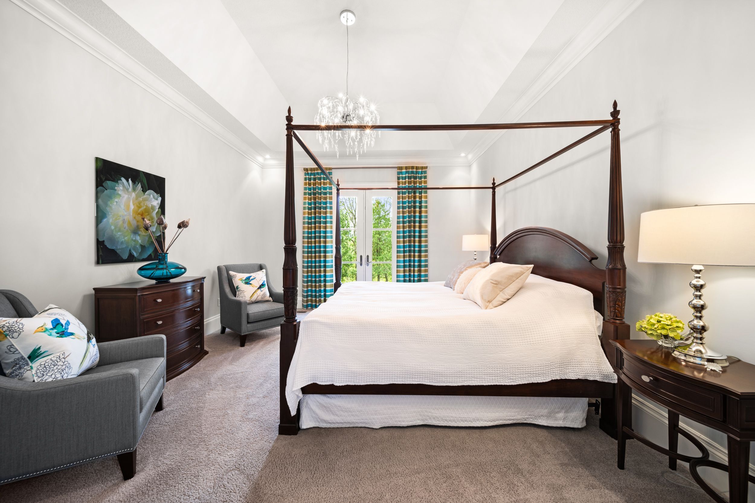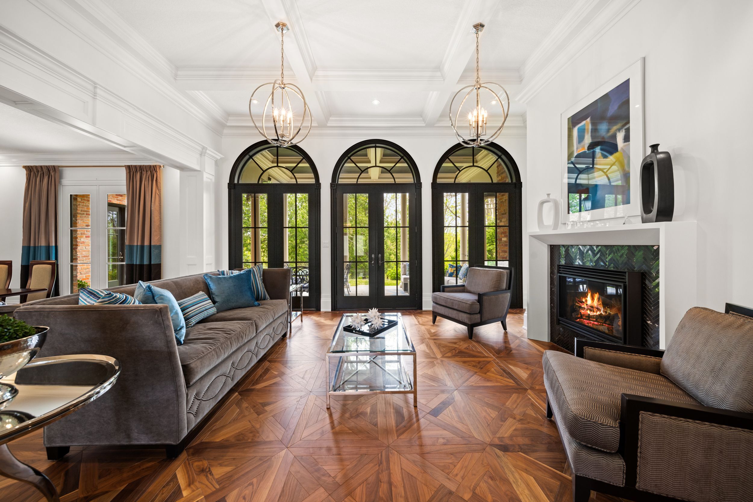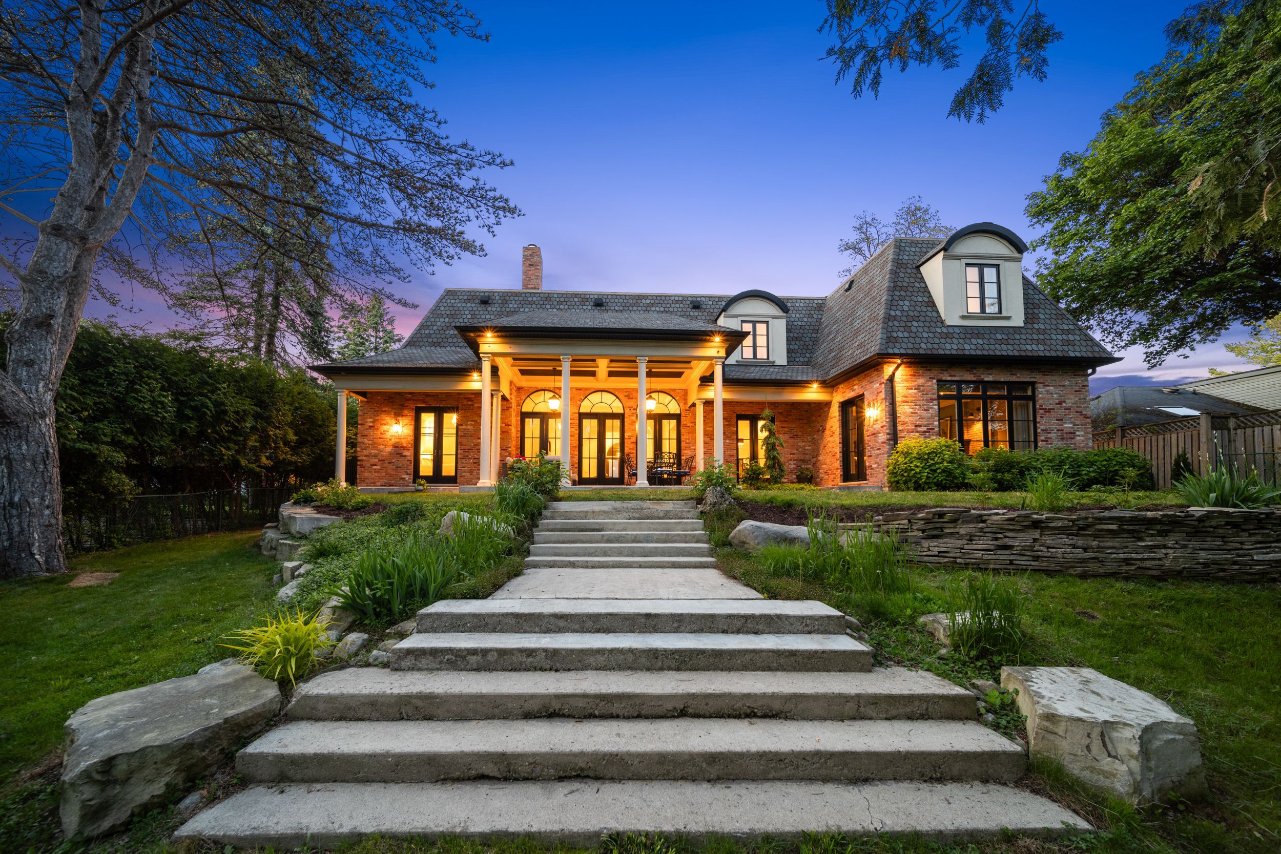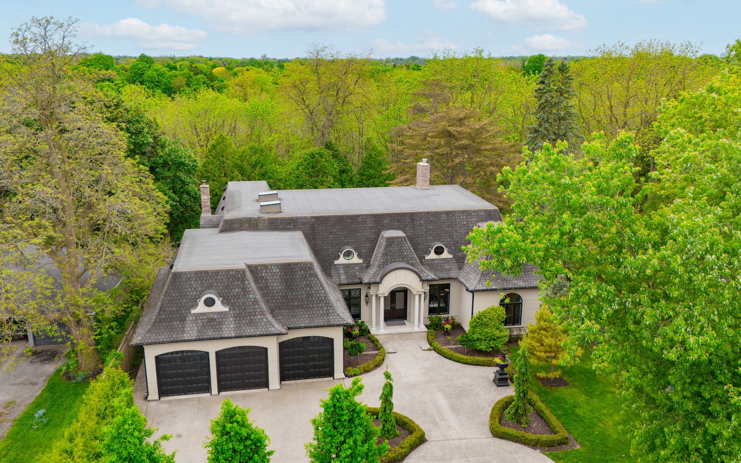Welcome to this extraordinary bungaloft, nestled on a private, wooded lot and offering the perfect balance of luxury, function, and architectural detail. The main level impresses with 12-foot ceilings, walnut flooring and high-end finishes throughout. Tray ceilings in the formal dining room, coffered ceilings in key living spaces, and solid core doors enhance the sense of quality and scale. Expansive transom windows and high baseboards add architectural charm and natural light throughout. The main floor principal bedroom offers a serene retreat with tray ceilings, garden doors leading to the rear yard, and a stunning ensuite featuring marble tile with inlay, a freestanding tub, a glass-enclosed shower, dual vanities, and a spacious walk-in closet with custom built-ins and dual access. The family room is warmed by a wood-burning fireplace, while the separate living room offers a cozy natural gas fireplace. Two separate mudrooms-one off the front foyer and one off the garage-add everyday practicality to the homes thoughtful layout. The kitchen features premium wolf appliances, a farmhouse sink, pot filler, and a large island with seating. The adjacent servery includes a fridge, wall oven, microwave, and a secondary sink-ideal for hosting. Upstairs, the loft provides a versatile living area, two generously sized bedrooms, and a beautifully finished main bath with a double vanity, freestanding tub, glass shower, and elegant tile inlay flooring. The lower level adds versatility with two additional bedrooms and rough-in. A walk-up to the triple car garage enhances convenience and supports multi-generational living. Outside, enjoy a private, two-tiered backyard oasis with a covered rear porch, perfect for relaxing or entertaining. The expansive driveway offers parking for up to eight vehicles, in addition to the spacious triple car garage with built-in storage, completing this exceptional property.