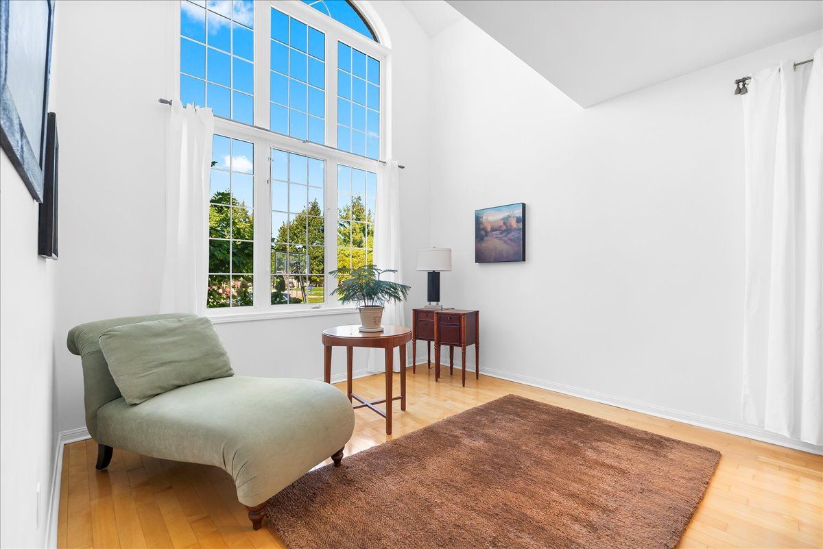 • Bright dining room with cathedral ceiling and beautiful arched window.
