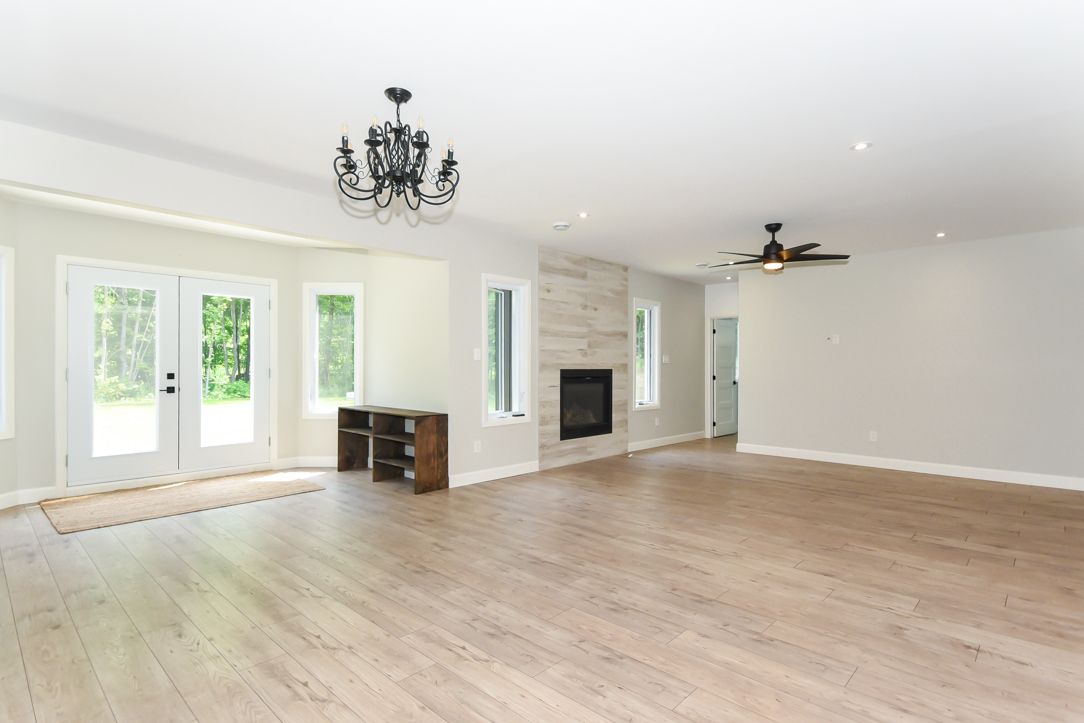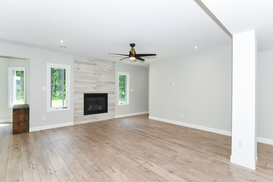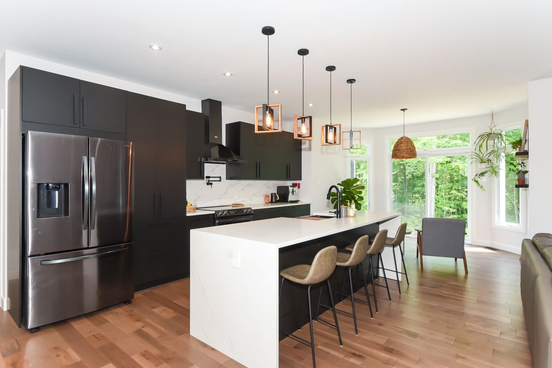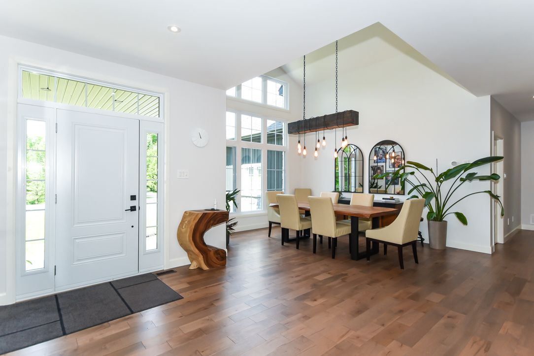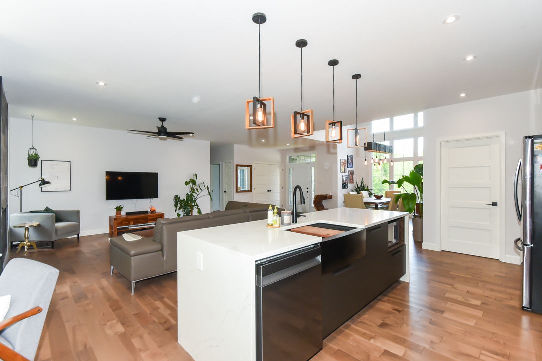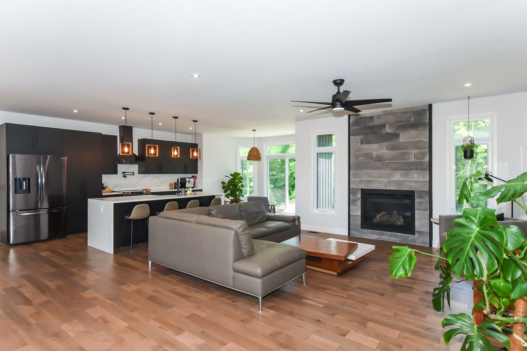 Welcome to your 2023 custom dual-living design home built ideally for in-law suite or rental income! This stunning home is thoughtfully designed for extended family living, featuring two full master bedroom ensuites, each with their own kitchen and living areas one on each level! Step into the inviting foyer adorned with rich maple hardwood floors, leading to a sleek, modern kitchen with custom cabinetry, waterfall quartz countertops, a pantry, and a large island with seating perfect for gathering leading to upper deck. The dining area boasts soaring 14' vaulted ceilings, while the spacious living room features an eye-catching gas fireplace for cozy evenings. The main floor master suite is a private retreat, complete with heated floors, double sinks, a standalone soaker tub, and a walk-in shower. Two additional bedrooms on this level are generously sized and separated by a full family bathroom. Downstairs, the bright walk-out level includes the second master suite with its own bathroom & walk-in closet, a quaint second kitchen, a dining and living area with a second gas fireplace, a den, and ample storage space. Enjoy outdoor living, relaxing and entertaining in the private backyard offering; a shaded patio, firepit area, and mature trees backing onto neighboring property with cobb's lake creek. Additional highlights: high-speed bell fibe internet. Extra insulation for enhanced energy efficiency. Charming small town community with top rated elementary school & park area. A rare and versatile home perfect for multi-generational families or those seeking income potential with in-law capabilities. Don't miss your chance to view this one-of-a-kind property! 24-hour irrevocable on all offers.