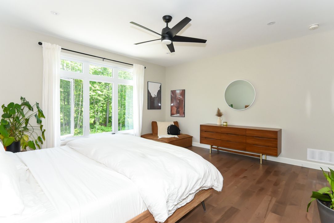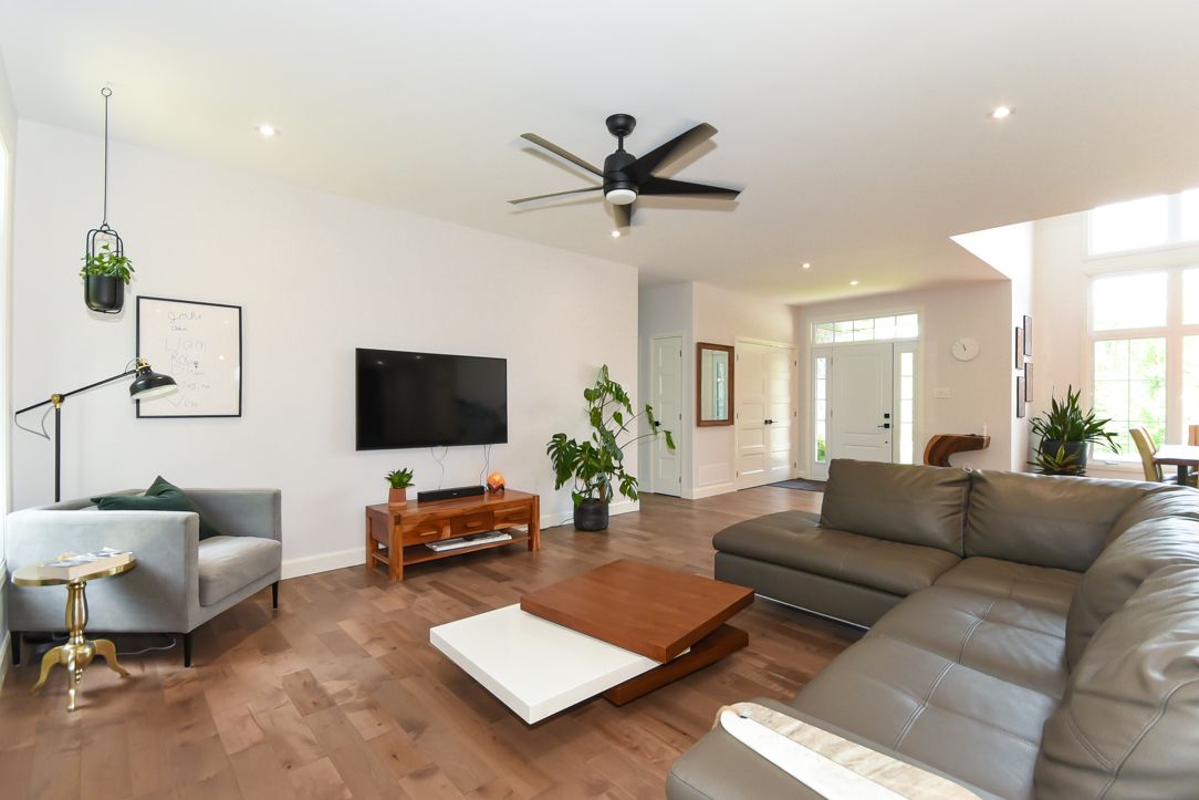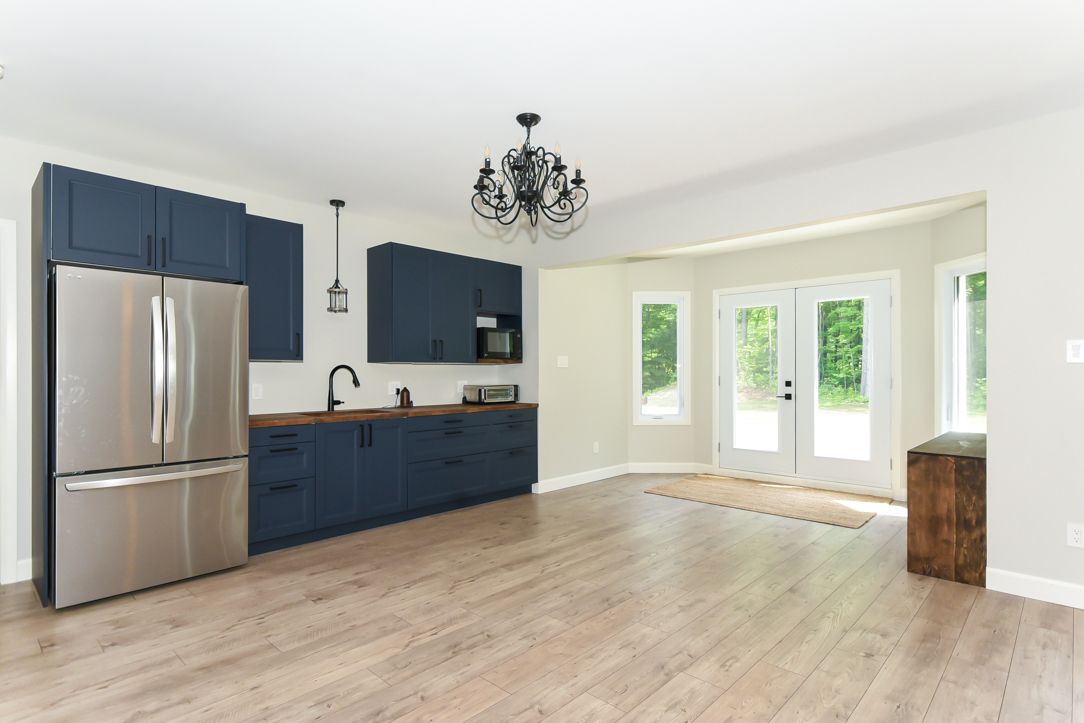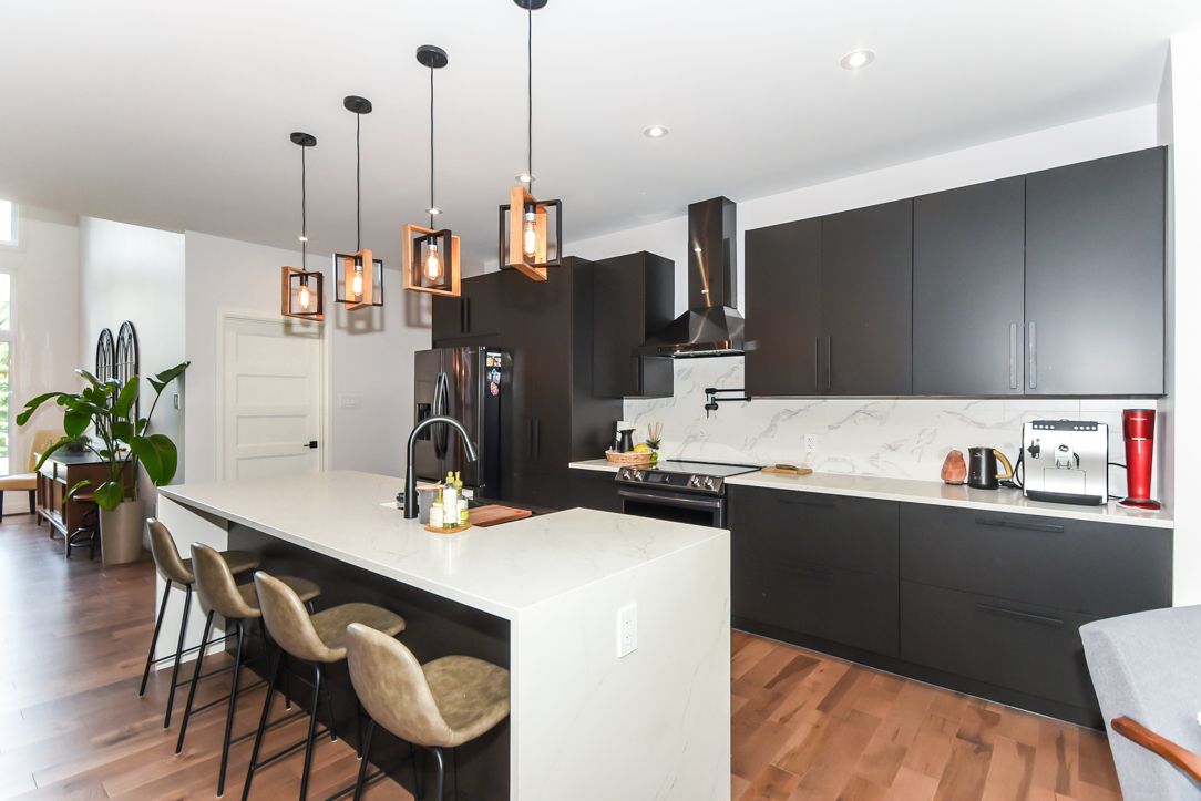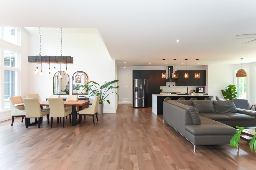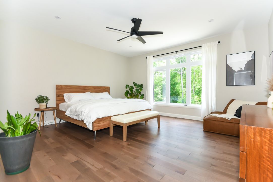 Welcome to your 2023 custom dual-living design home built ideally for in-law suite or rental income! This stunning home is thoughtfully designed for extended family living, featuring two full master bedroom ensuites, each with their own kitchen and living areas one on each level! Step into the inviting foyer adorned with rich maple hardwood floors, leading to a sleek, modern kitchen with custom cabinetry, waterfall quartz countertops, a pantry, and a large island with seating perfect for gathering leading to upper deck. The dining area boasts soaring 14' vaulted ceilings, while the spacious living room features an eye-catching gas fireplace for cozy evenings. The main floor master suite is a private retreat, complete with heated floors, double sinks, a standalone soaker tub, and a walk-in shower. Two additional bedrooms on this level are generously sized and separated by a full family bathroom. Downstairs, the bright walk-out level includes the second master suite with its own bathroom & walk-in closet, a quaint second kitchen, a dining and living area with a second gas fireplace, a den, and ample storage space. Enjoy outdoor living, relaxing and entertaining in the private backyard offering; a shaded patio, firepit area, and mature trees backing onto neighboring property with cobb's lake creek. Additional highlights: high-speed bell fibe internet. Extra insulation for enhanced energy efficiency. Charming small town community with top rated elementary school & park area. A rare and versatile home perfect for multi-generational families or those seeking income potential with in-law capabilities. Don't miss your chance to view this one-of-a-kind property! 24-hour irrevocable on all offers.