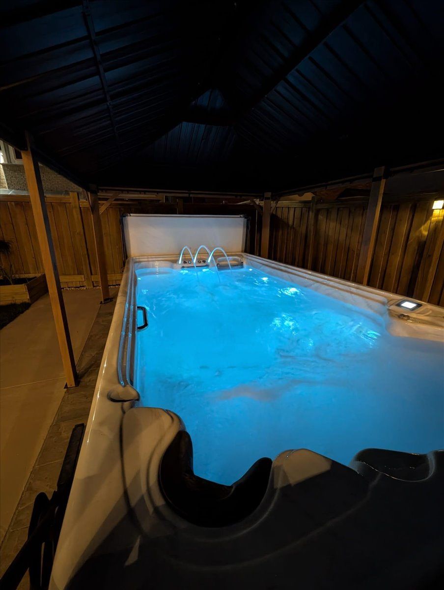 • Features a semi-inground swim spa with seating for up to 10 adults.