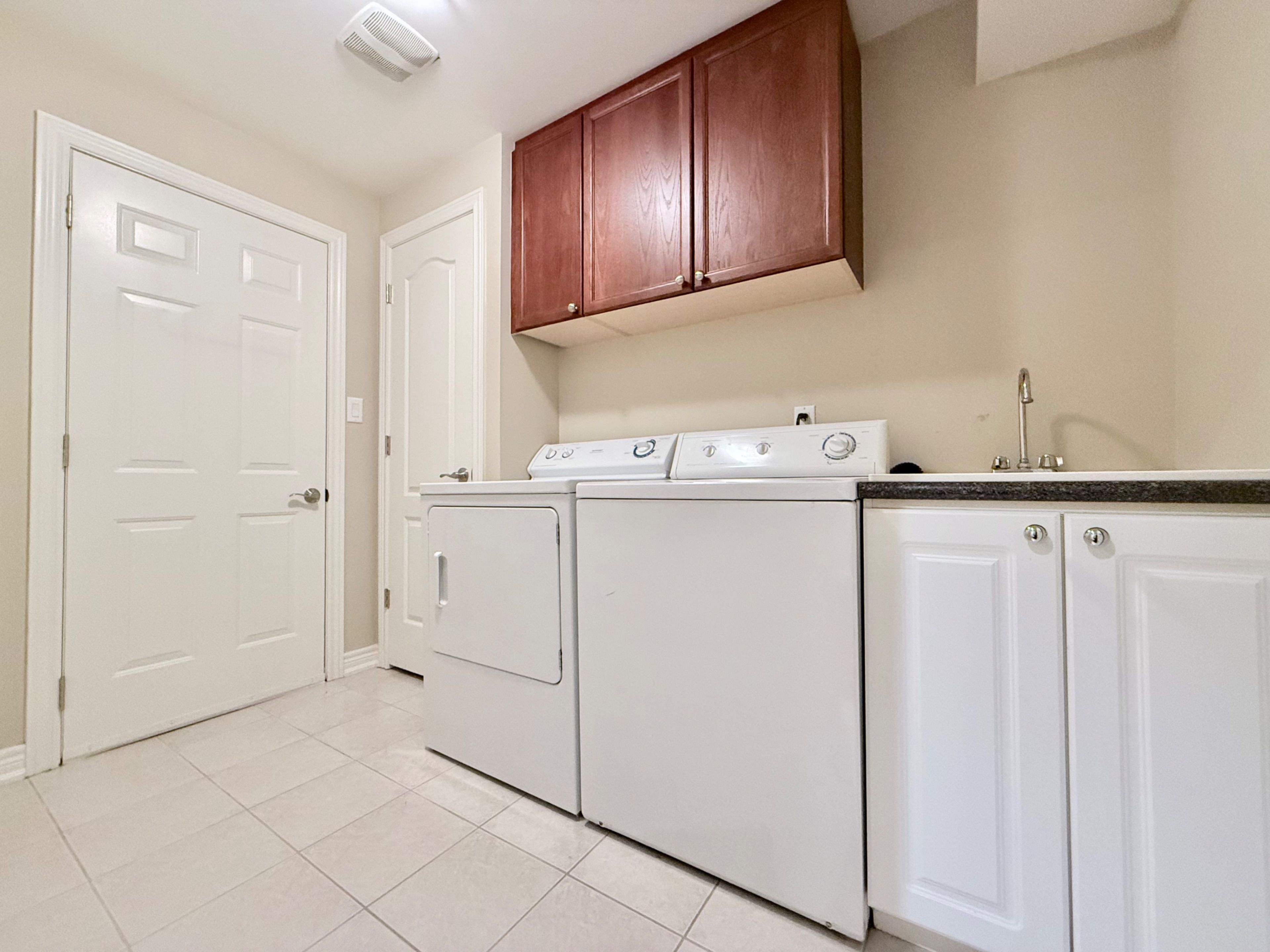 • Sunlit kitchen has ample cabinetry and direct access to the fenced backyard.