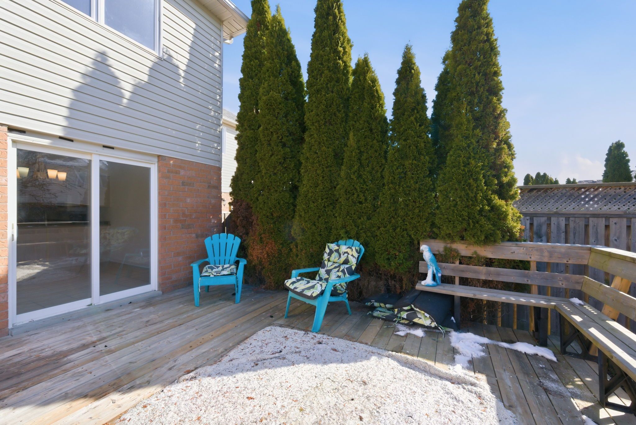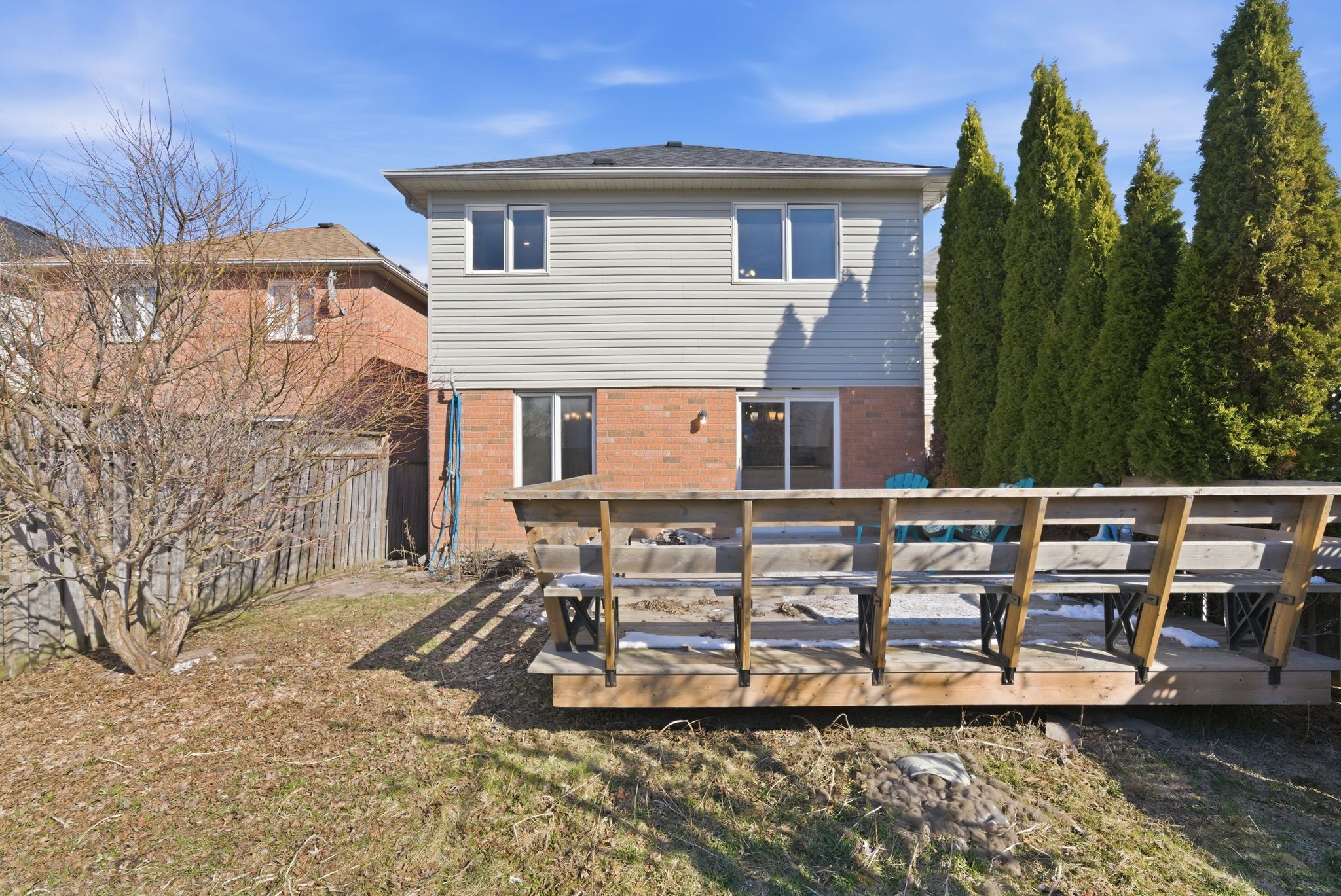 • Generous backyard with a large deck and built-in seating.