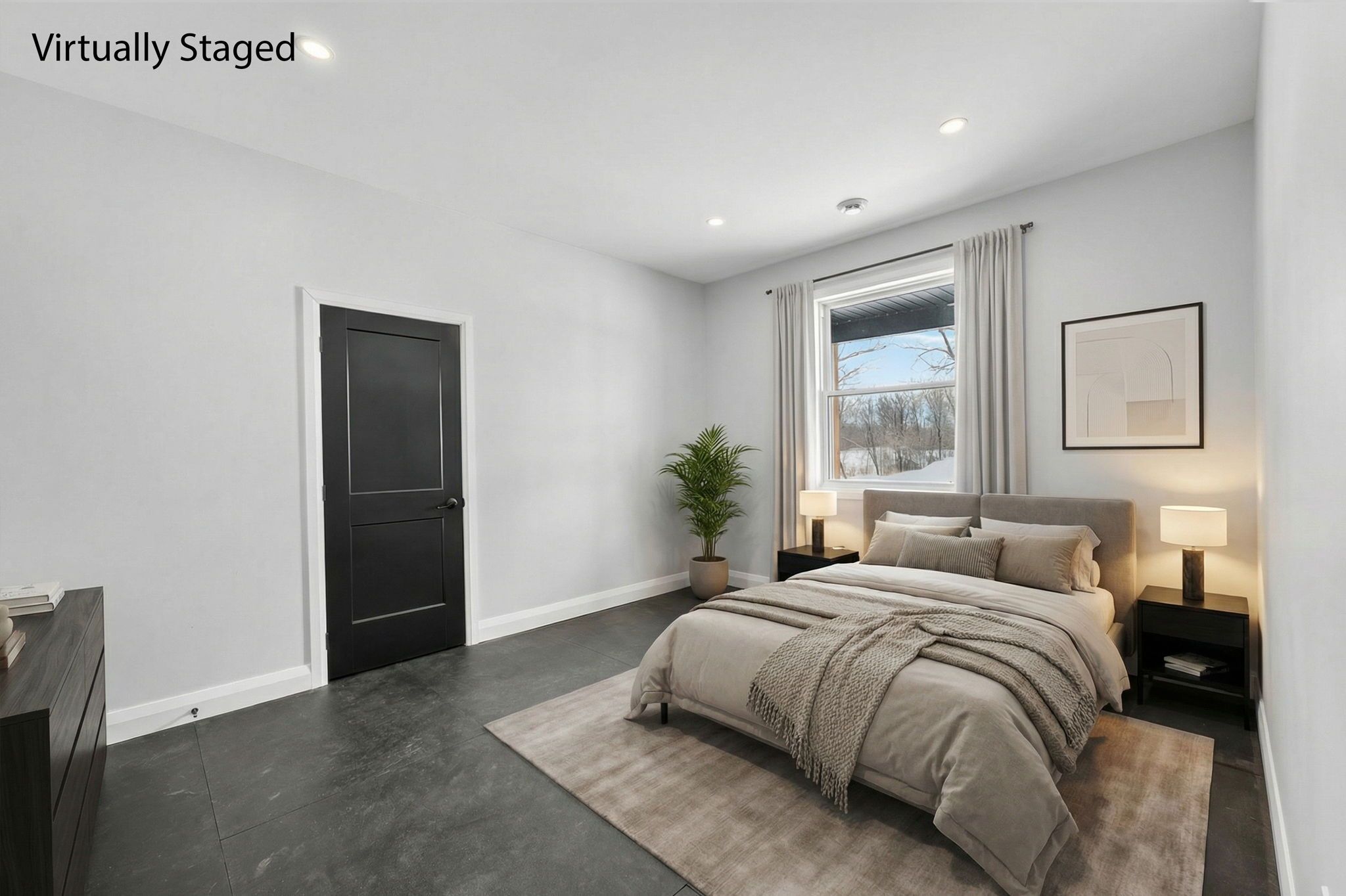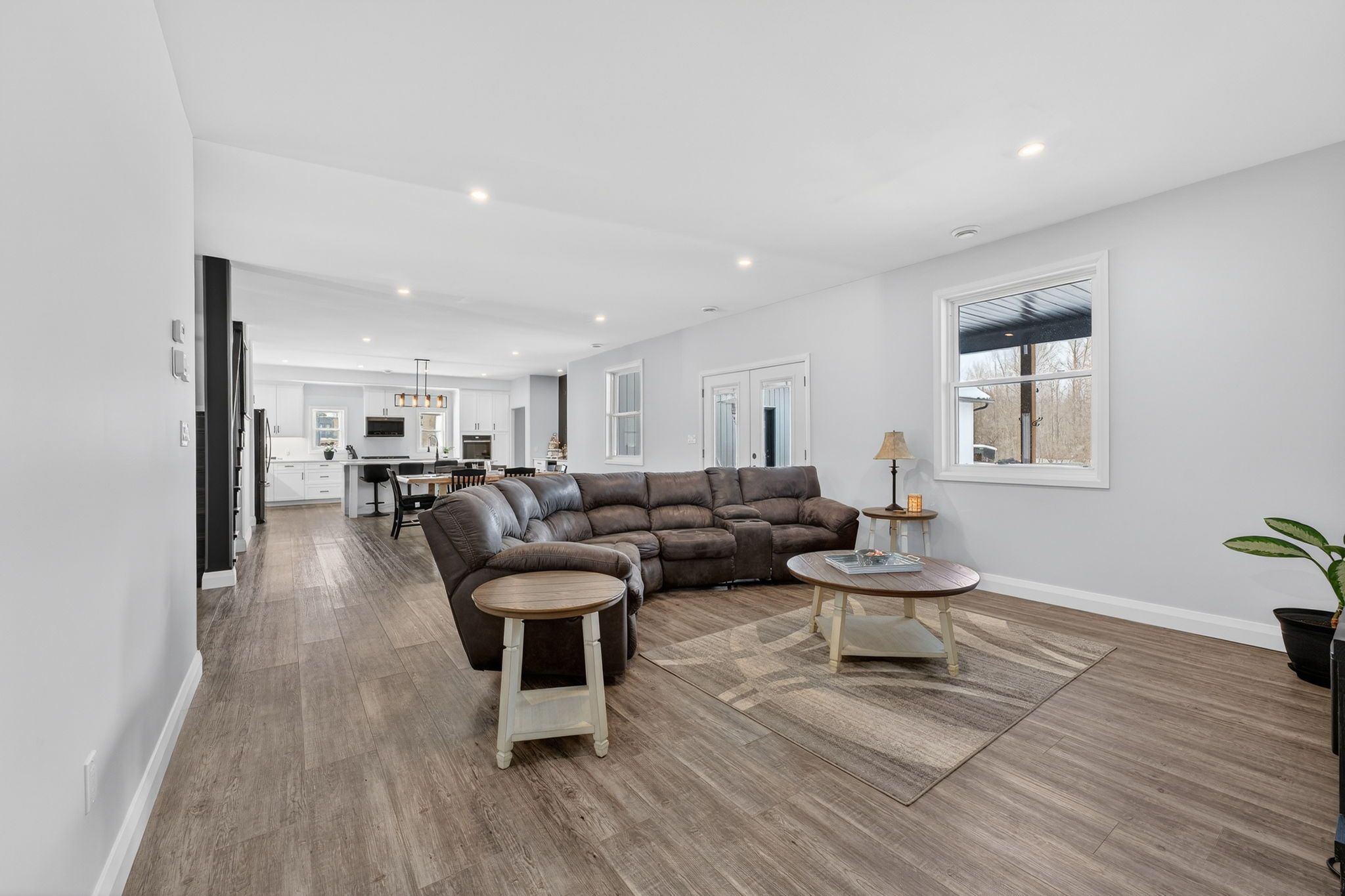 Set on a private country property, this beautifully finished home offers exceptional space, modern design, and versatile living inside & out. The bright, open-concept main level features a stunning kitchen with oversized island, ample cabinetry, and seamless flow into the dining and living areas-ideal for both everyday living and entertaining. Large windows and patio doors lead to an expansive covered patio, creating the perfect space for year-round outdoor enjoyment. The main-floor primary suite offers a peaceful retreat with walk-in closet and spa-inspired ensuite featuring a double vanity and tiled shower. Additional bedrooms are thoughtfully positioned for privacy and flexibility, while a dedicated gym, laundry area, and interior access to the garage add everyday convenience. The fully finished upper level provides a generous family room, two additional bedrooms, full bathroom, and storage, offering space for growing families, guests, or home office needs. With multiple living areas, modern finishes throughout, and serene country surroundings, this home delivers comfort, functionality, and lifestyle in one exceptional package.