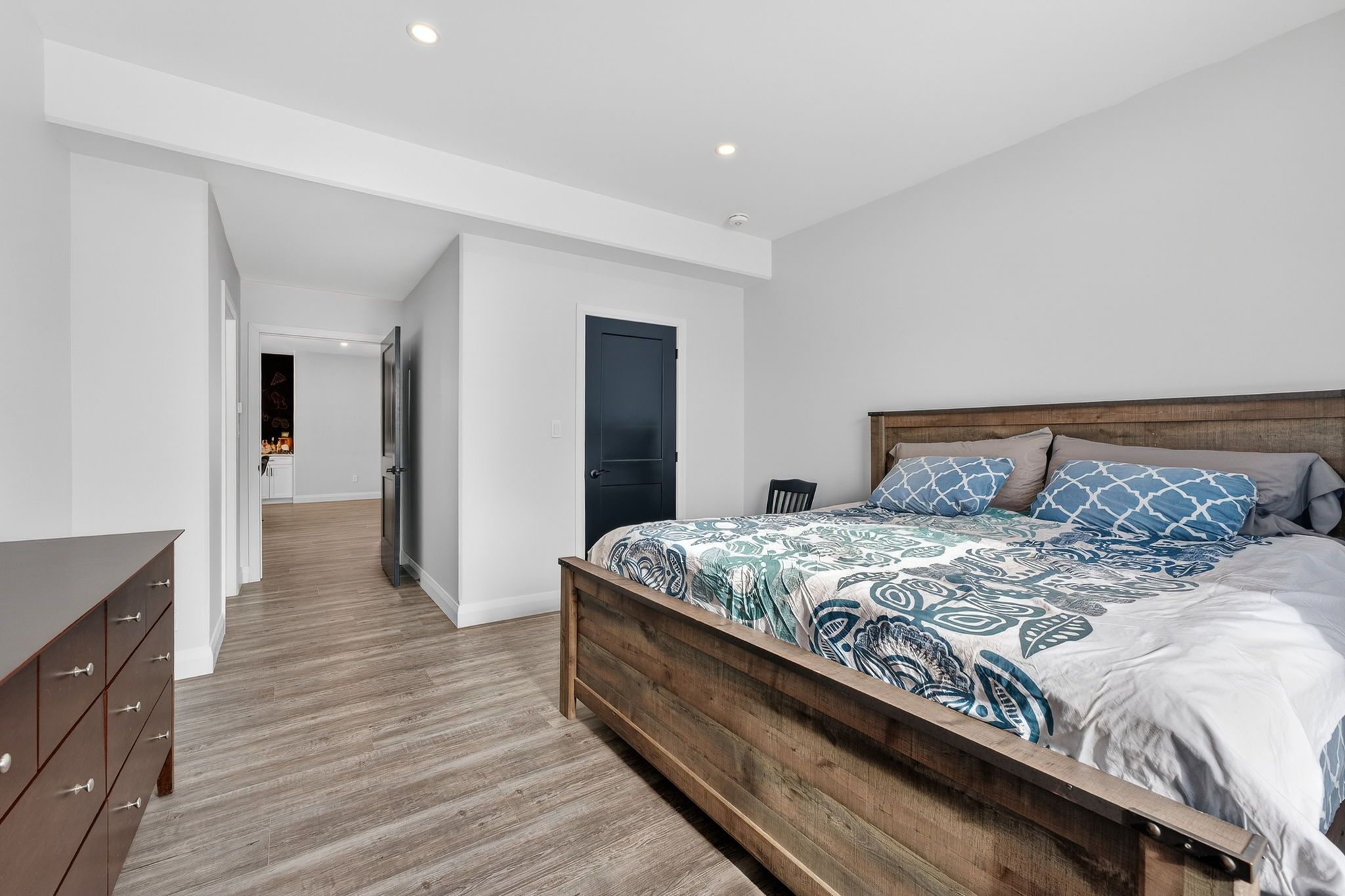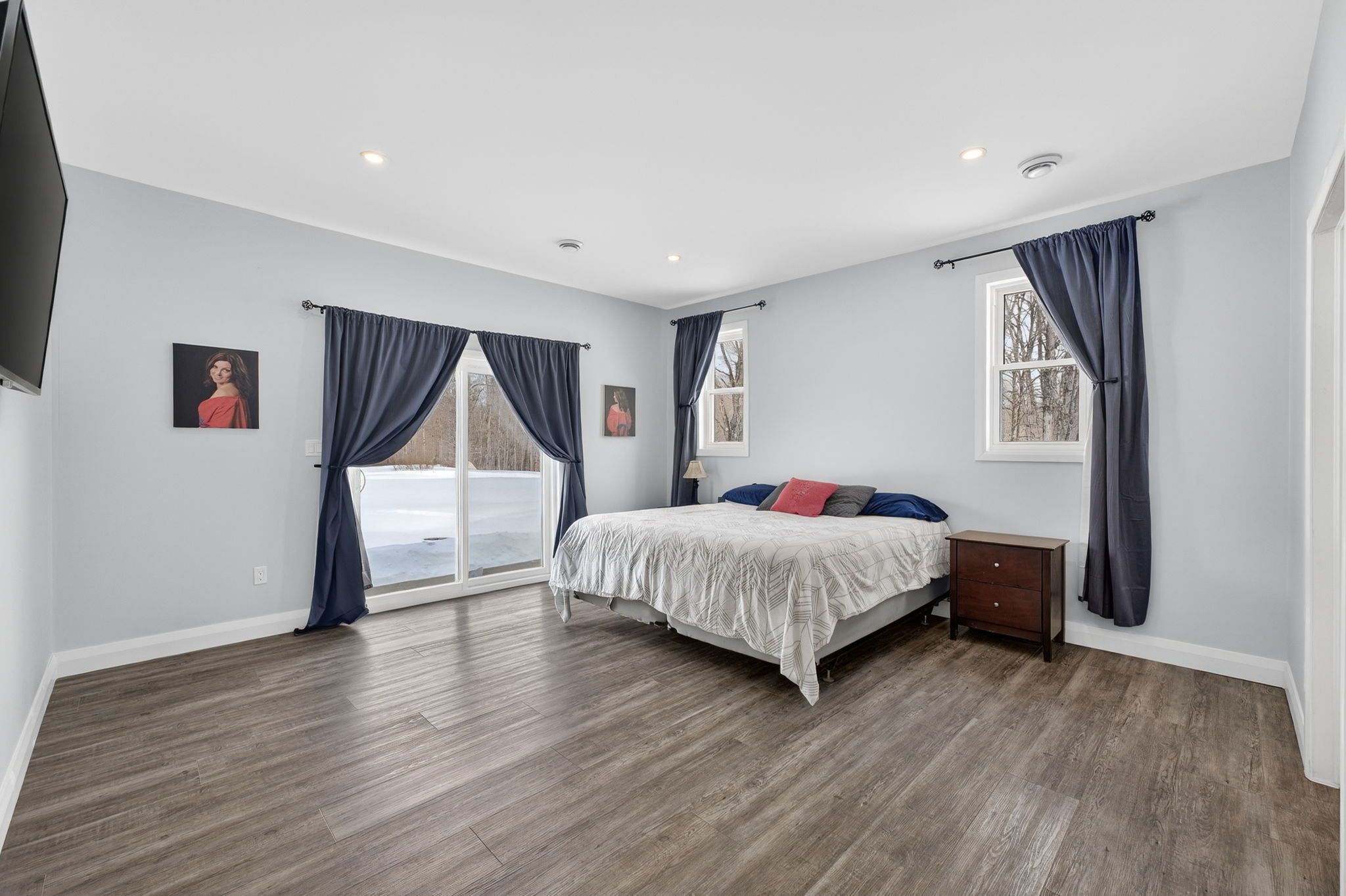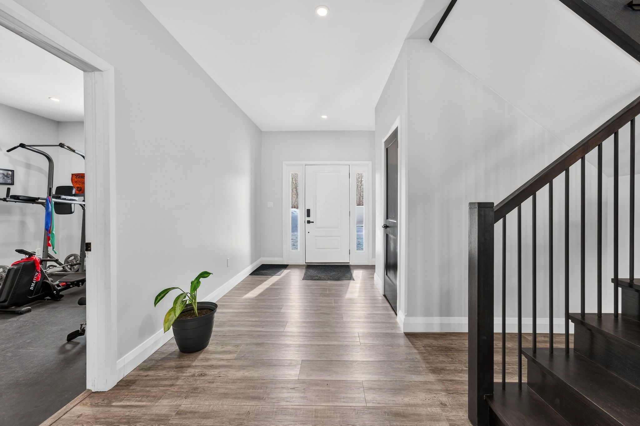 Set on a private country property, this beautifully finished home offers exceptional space, modern design, and versatile living inside & out. The bright, open-concept main level features a stunning kitchen with oversized island, ample cabinetry, and seamless flow into the dining and living areas-ideal for both everyday living and entertaining. Large windows and patio doors lead to an expansive covered patio, creating the perfect space for year-round outdoor enjoyment. The main-floor primary suite offers a peaceful retreat with walk-in closet and spa-inspired ensuite featuring a double vanity and tiled shower. Additional bedrooms are thoughtfully positioned for privacy and flexibility, while a dedicated gym, laundry area, and interior access to the garage add everyday convenience. The fully finished upper level provides a generous family room, two additional bedrooms, full bathroom, and storage, offering space for growing families, guests, or home office needs. With multiple living areas, modern finishes throughout, and serene country surroundings, this home delivers comfort, functionality, and lifestyle in one exceptional package.